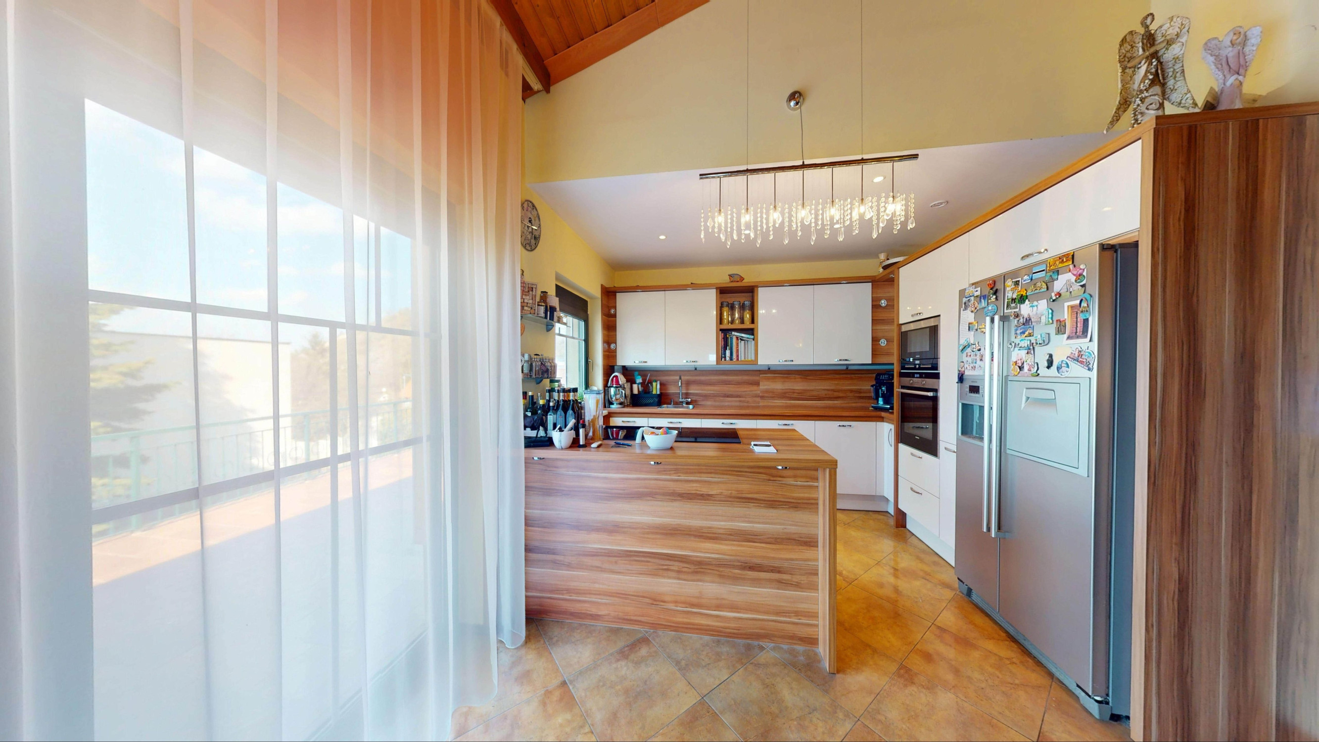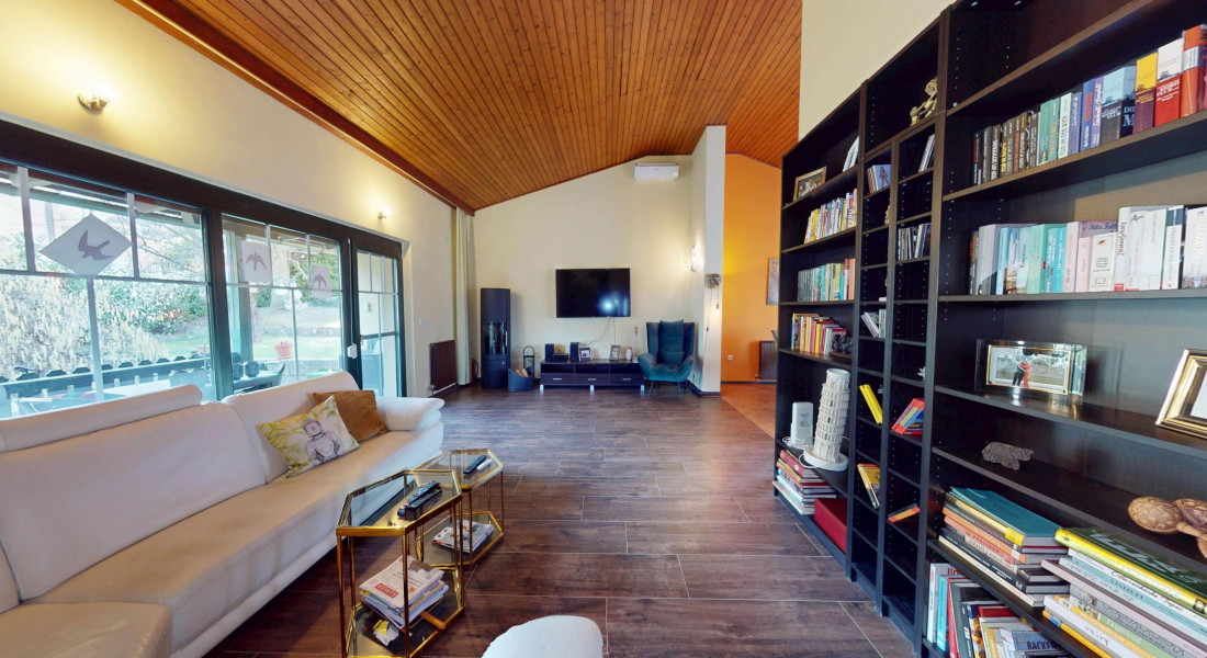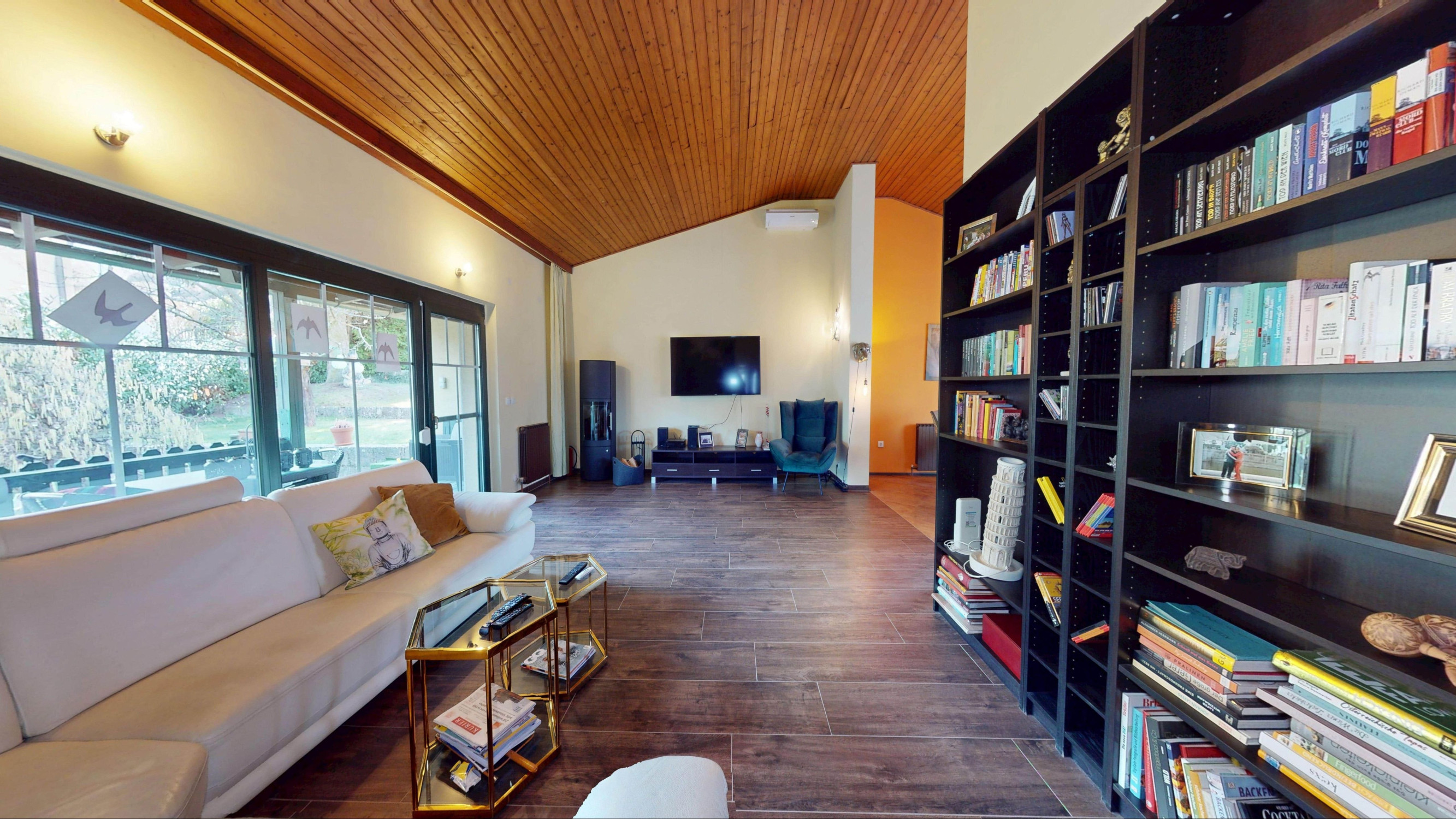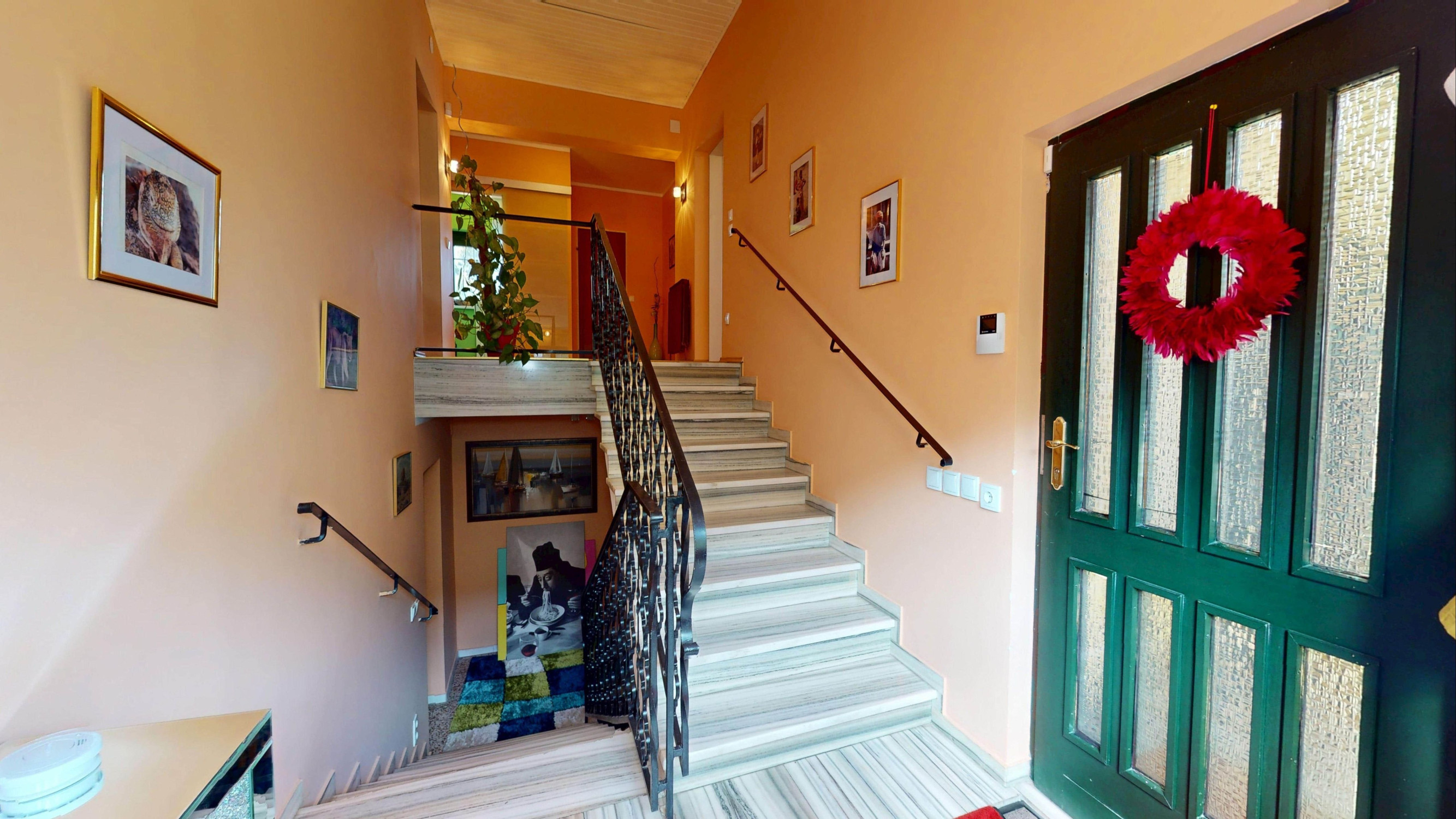 Cez vstupnú halu sa dostanete do pôsobivej obývacej izby so stropmi vysokými viac ako 3 metre, ktoré vytvárajú vzdušný a otvorený priestor.