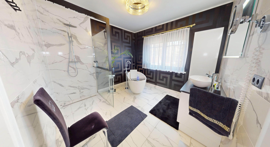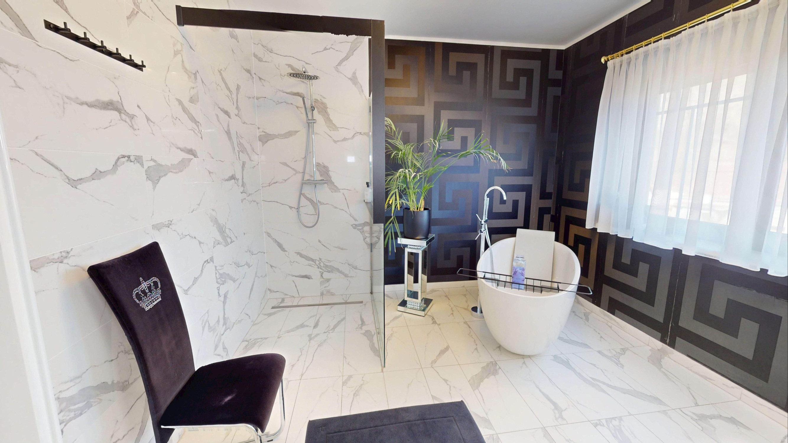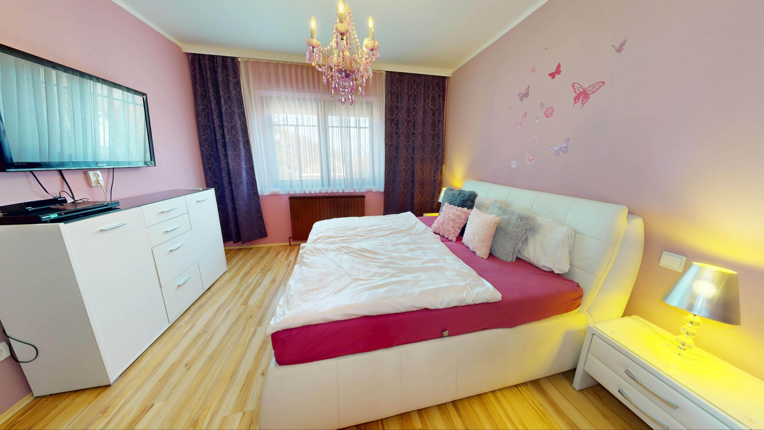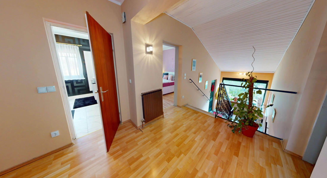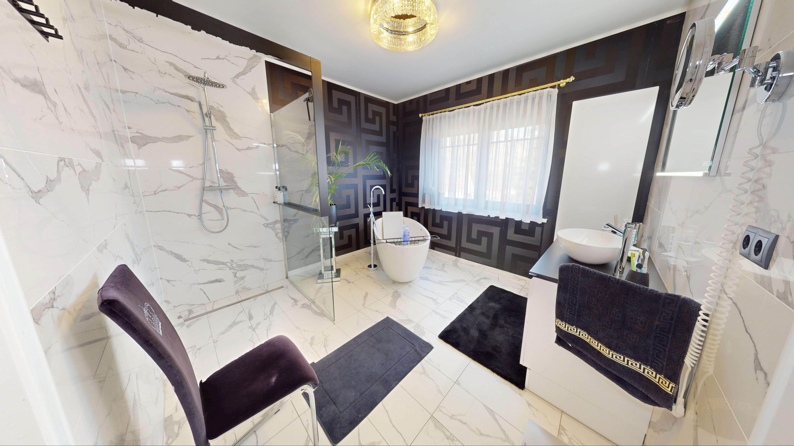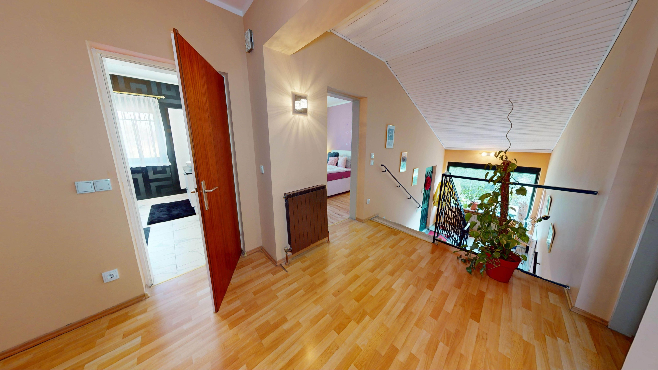 Na hornom podlaží sa nachádza priestranná hlavná spálňa s priamym vstupom do elegantnej kúpeľne. Tá disponuje voľne stojacou vaňou, veľkorysým walk-in sprchovým kútom a oknom, ktoré zabezpečuje dostatok denného svetla.