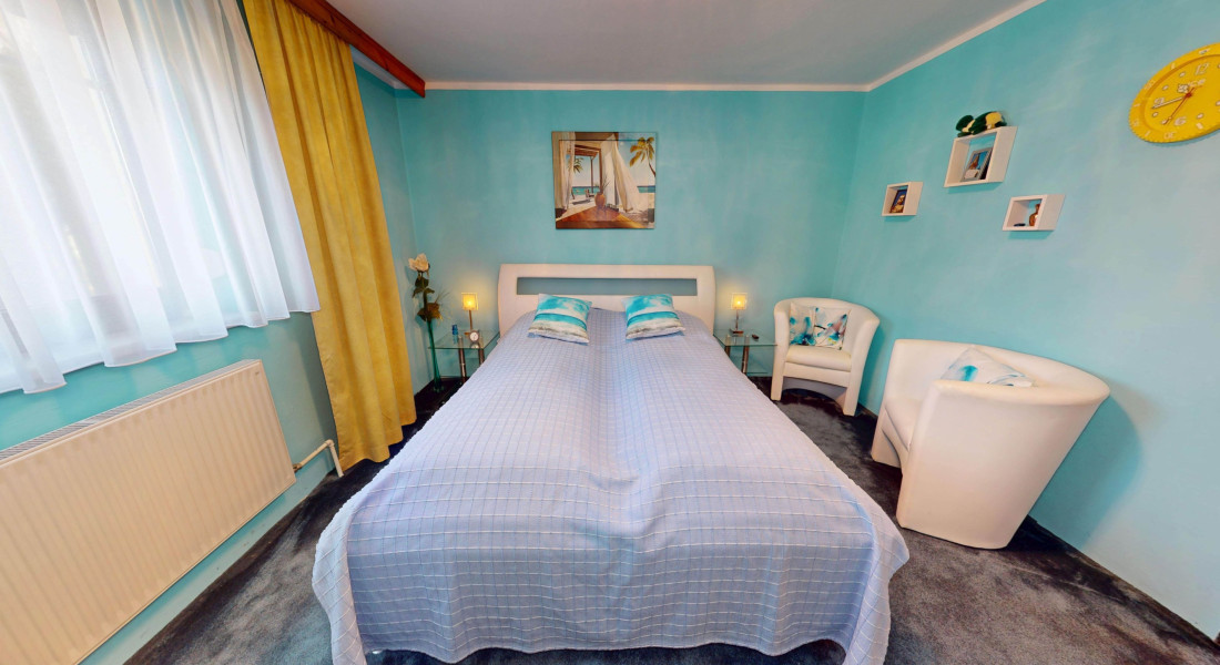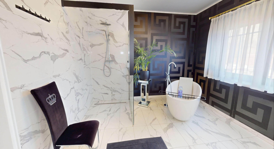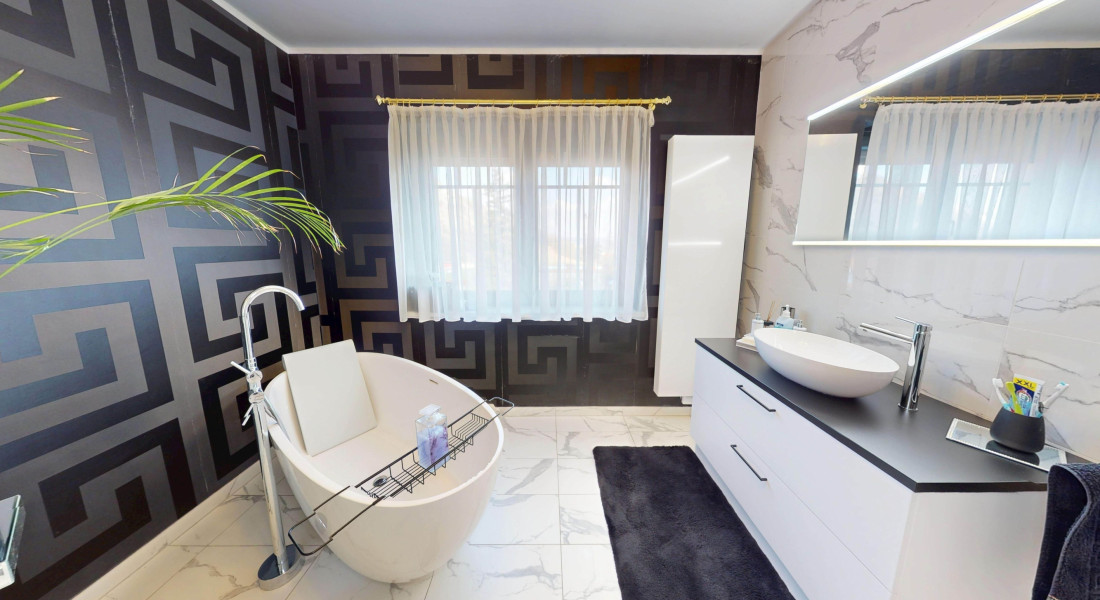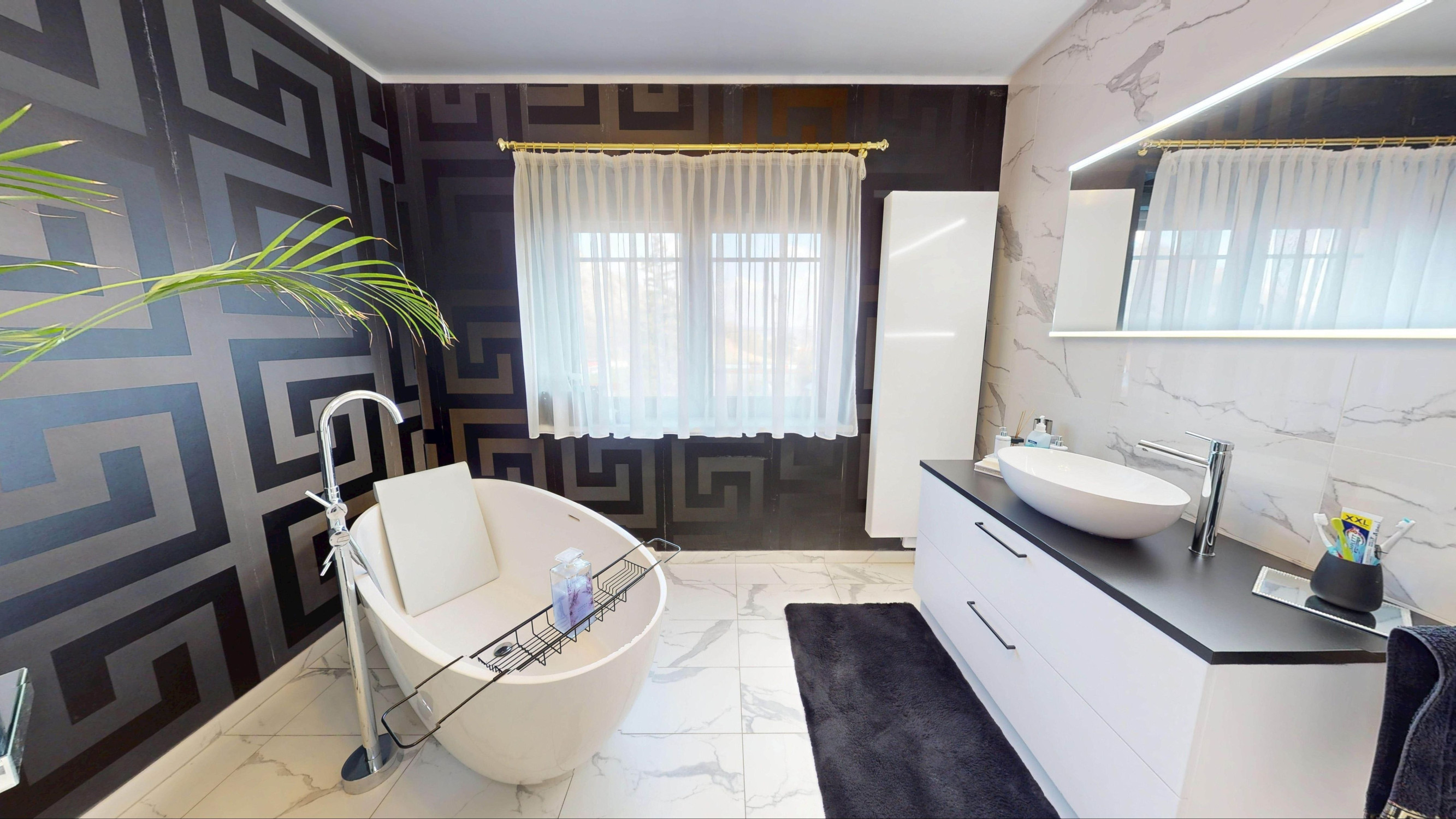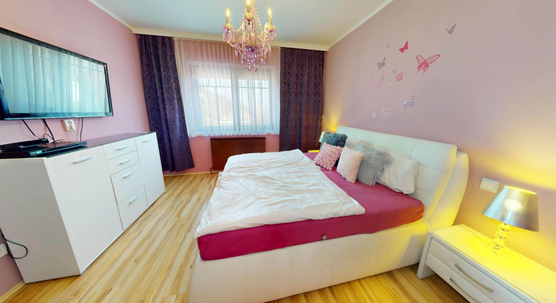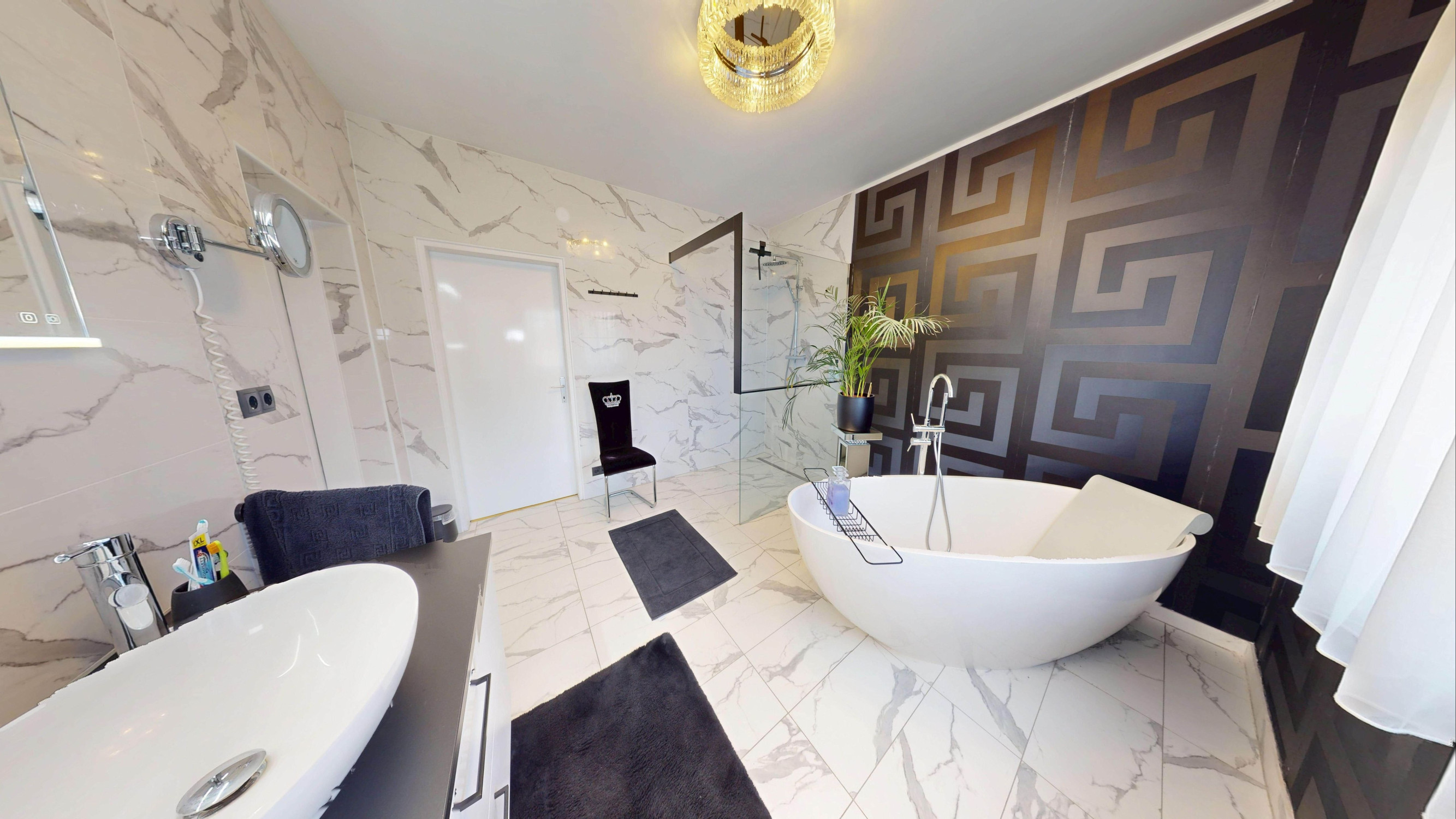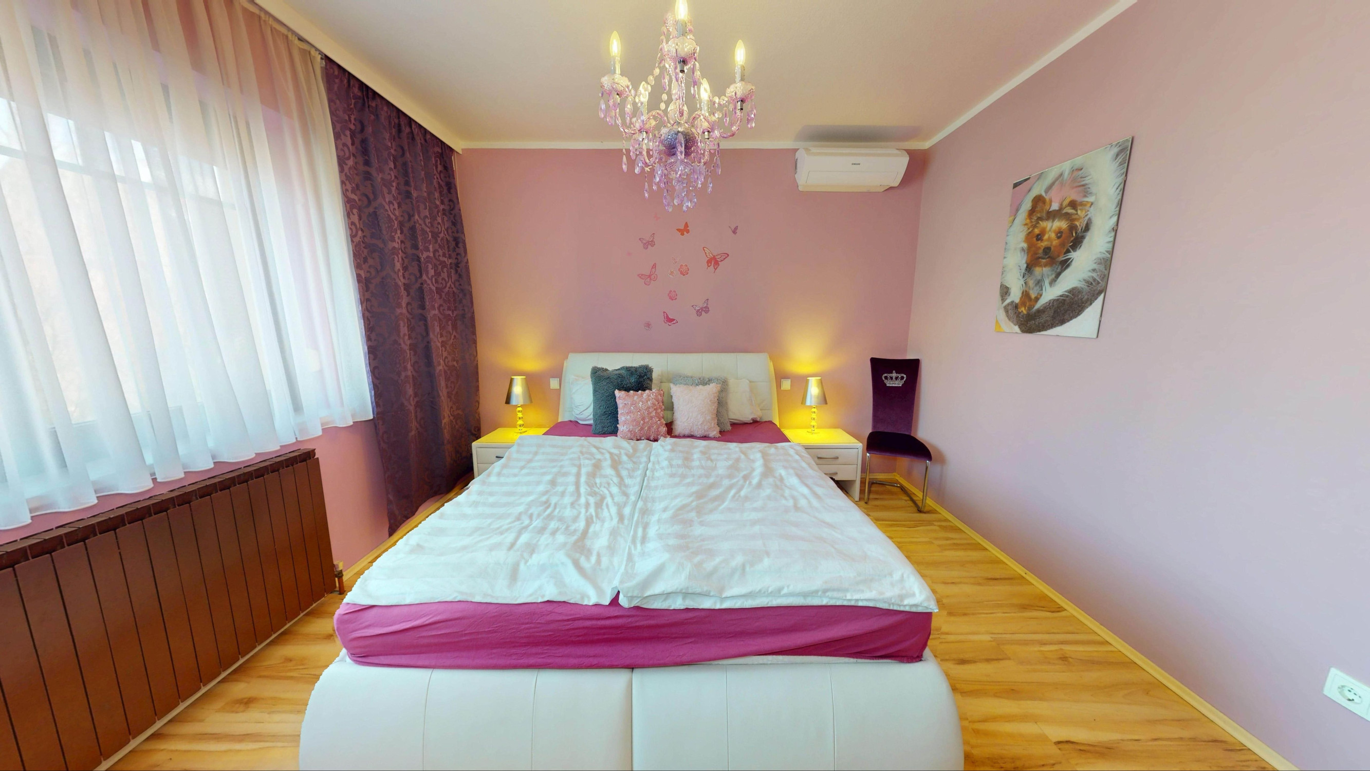 Na hornom podlaží sa nachádza priestranná hlavná spálňa s priamym vstupom do elegantnej kúpeľne. Tá disponuje voľne stojacou vaňou, veľkorysým walk-in sprchovým kútom a oknom, ktoré zabezpečuje dostatok denného svetla.
