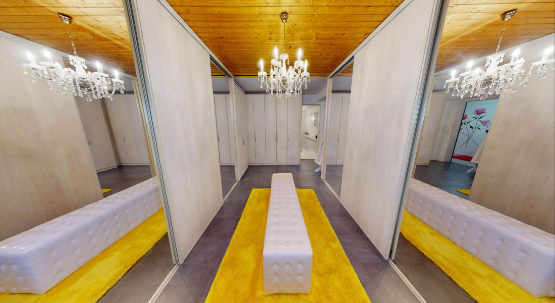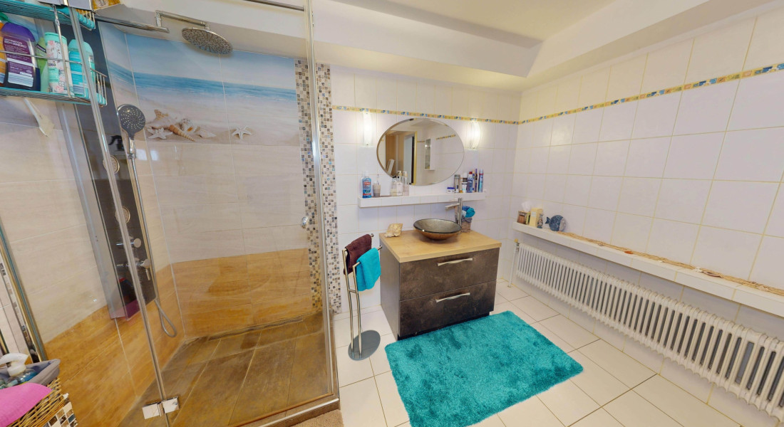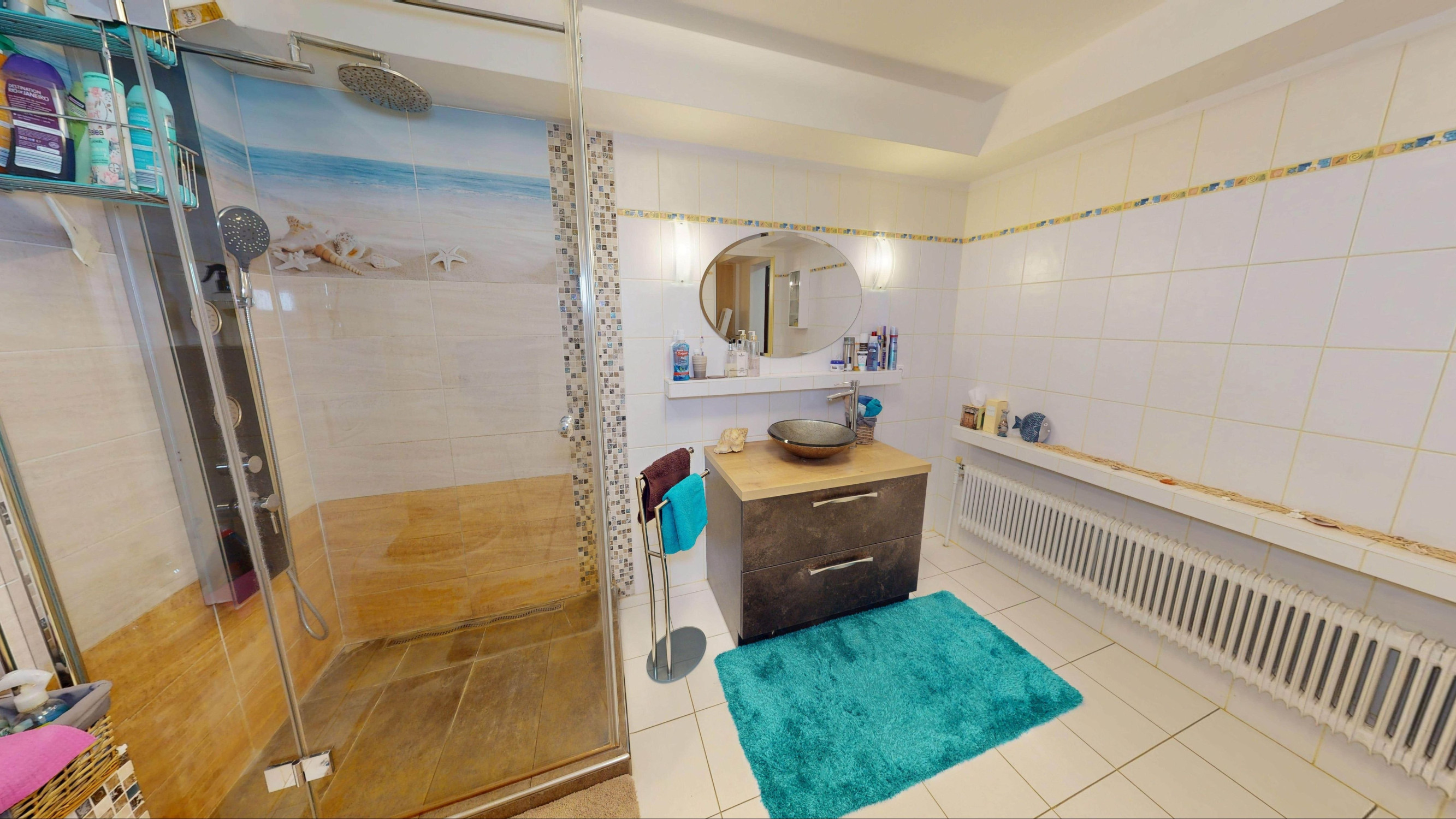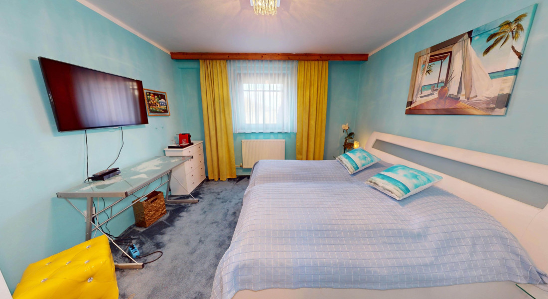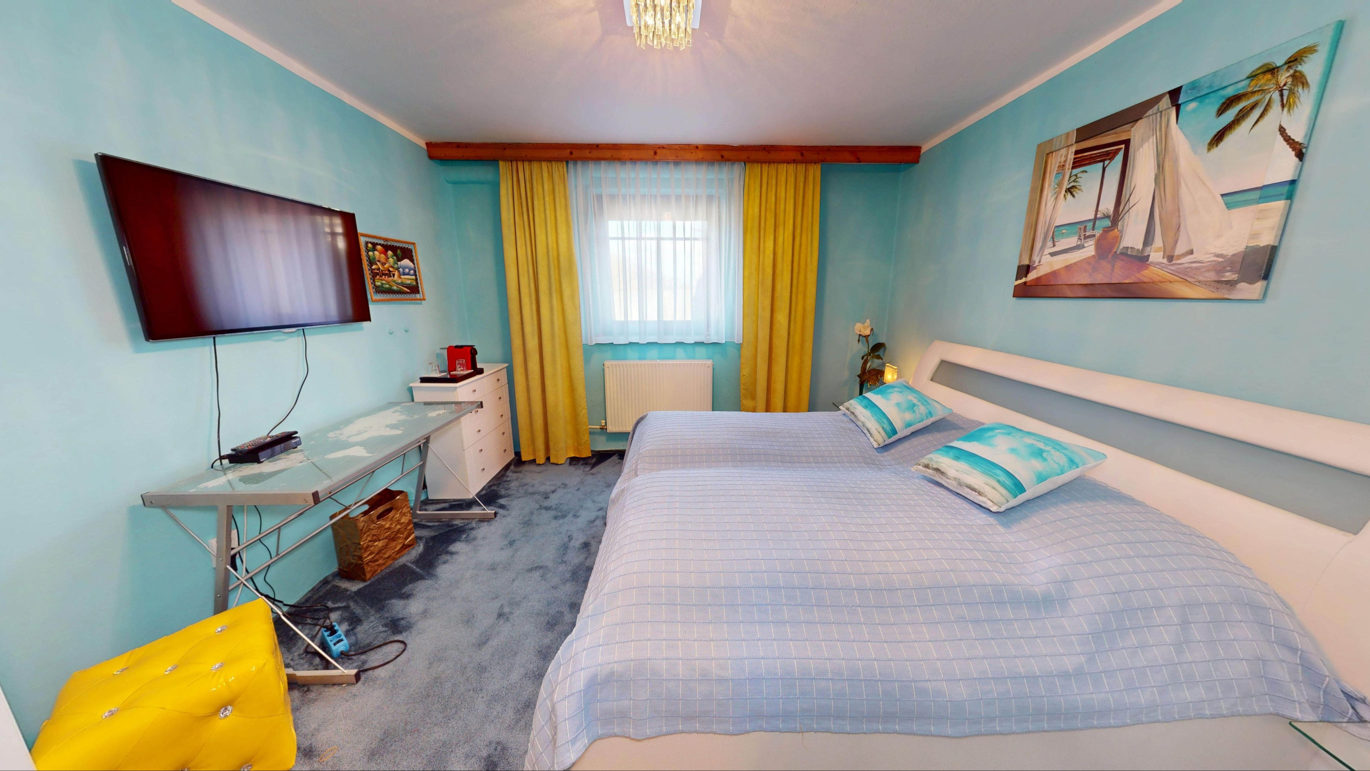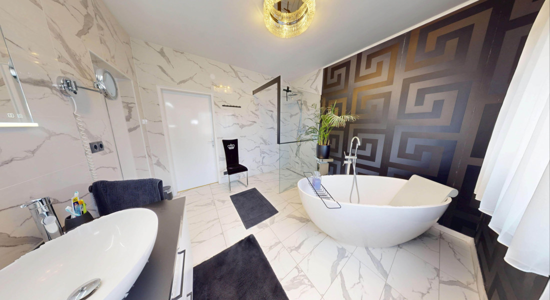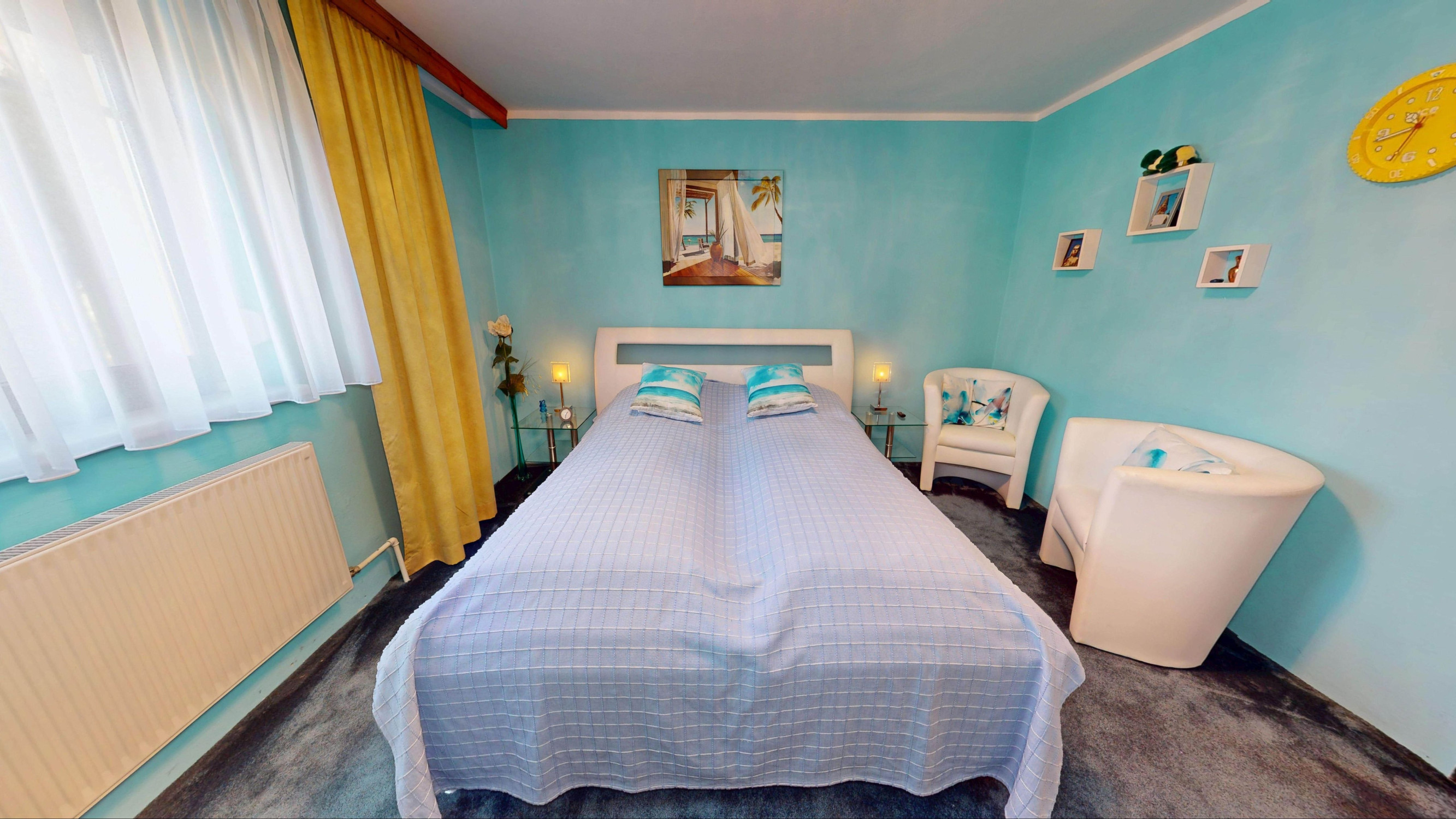 Na hornom podlaží sa nachádza priestranná hlavná spálňa s priamym vstupom do elegantnej kúpeľne. Tá disponuje voľne stojacou vaňou, veľkorysým walk-in sprchovým kútom a oknom, ktoré zabezpečuje dostatok denného svetla.