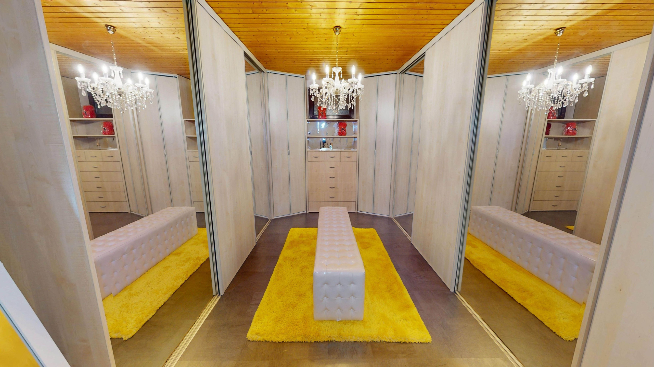 Na spodnom podlaží sa nachádza priestranná hosťovská izba s dostatkom svetla, veľký šatník so vstavanými skriňami