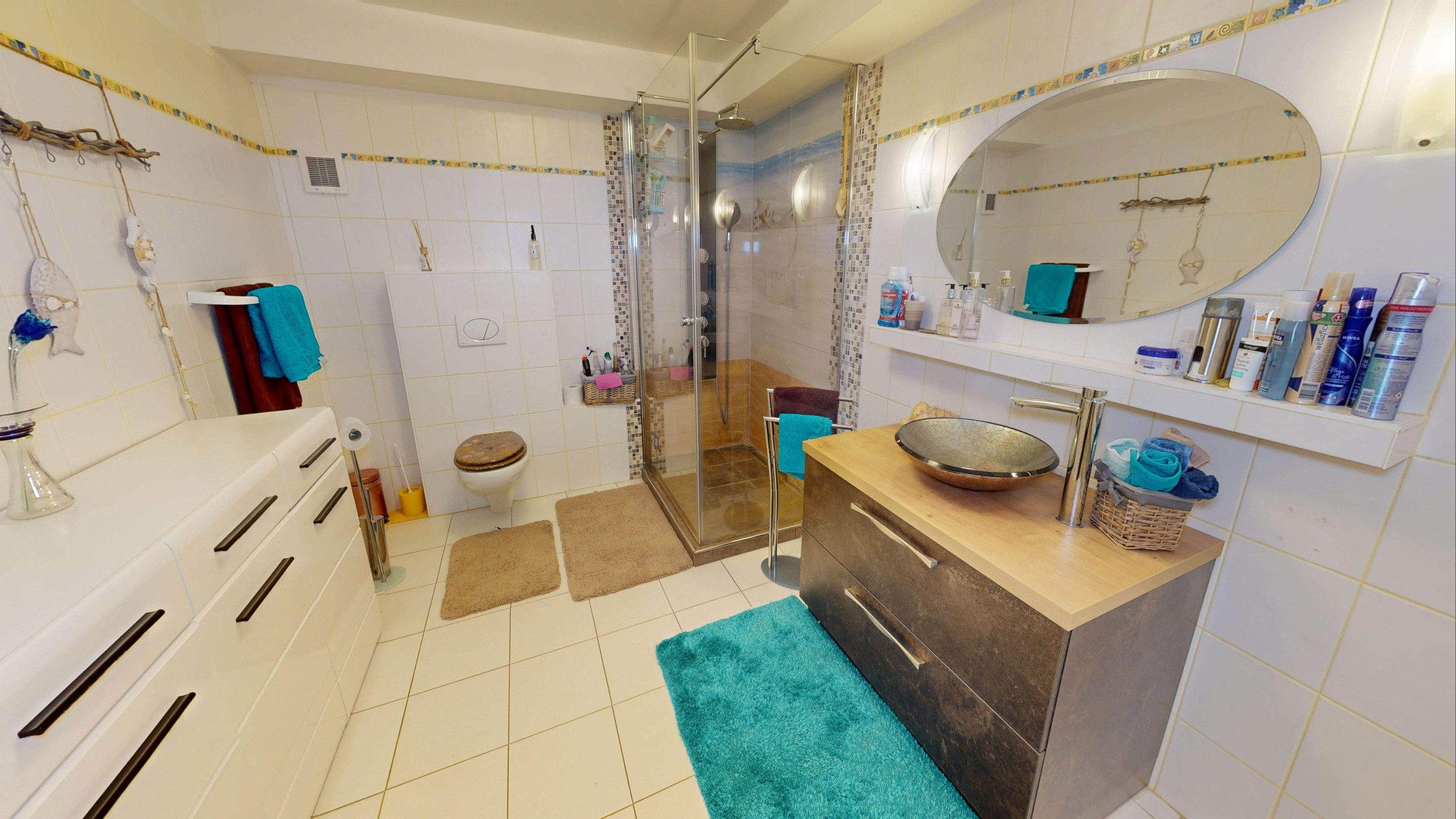 moderná hosťovská kúpeľňa s walk-in sprchou, WC a umývadlom, viacero skladových priestorov a praktická práčovňa.