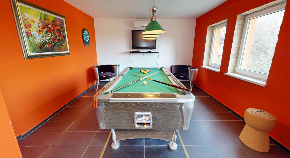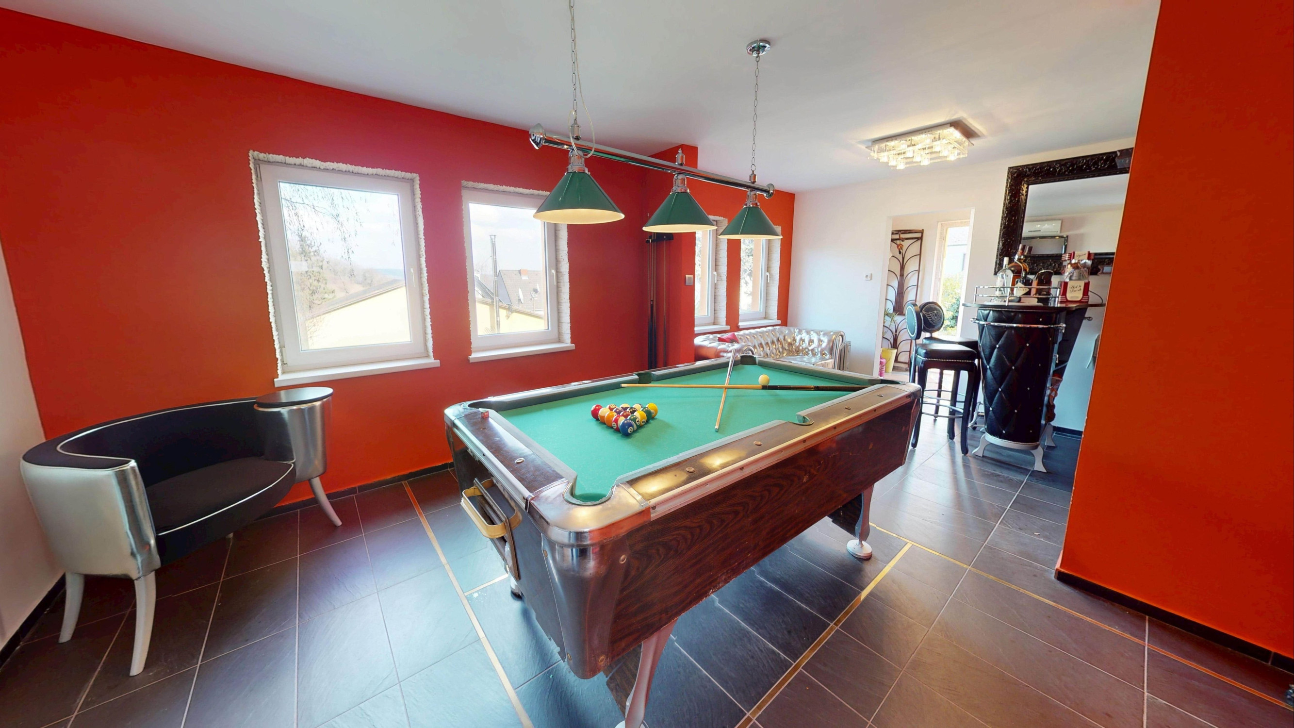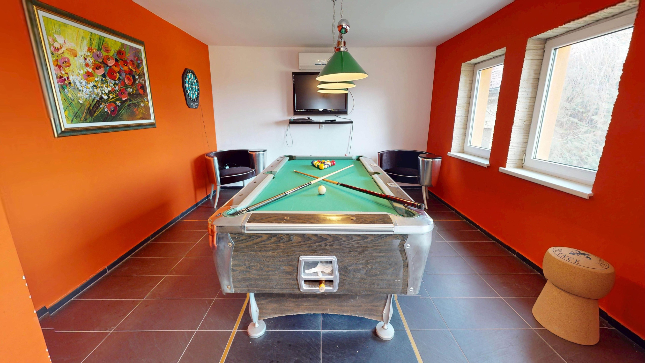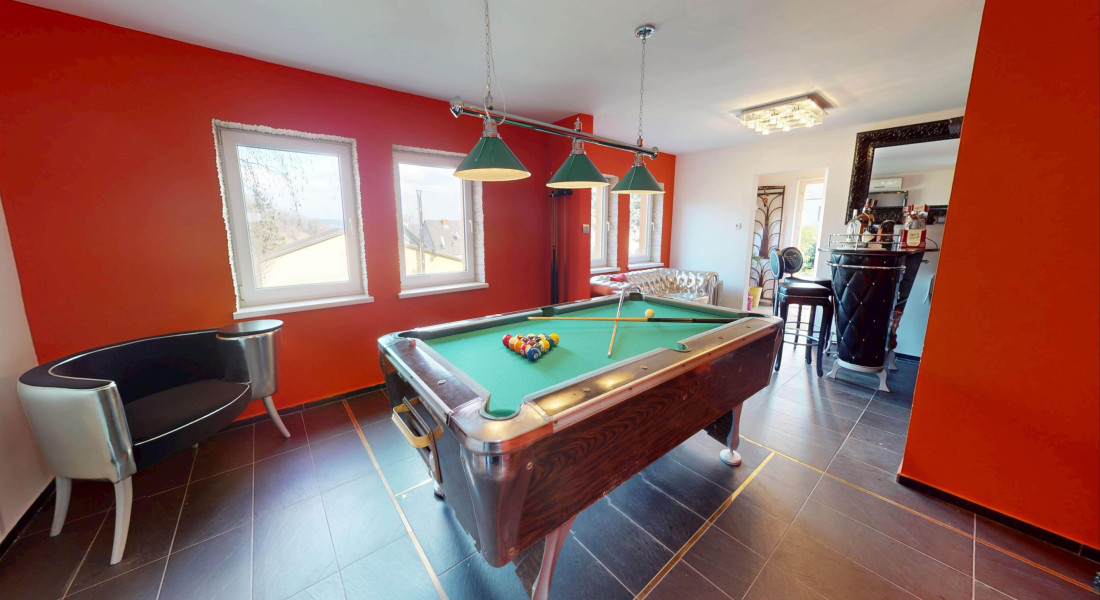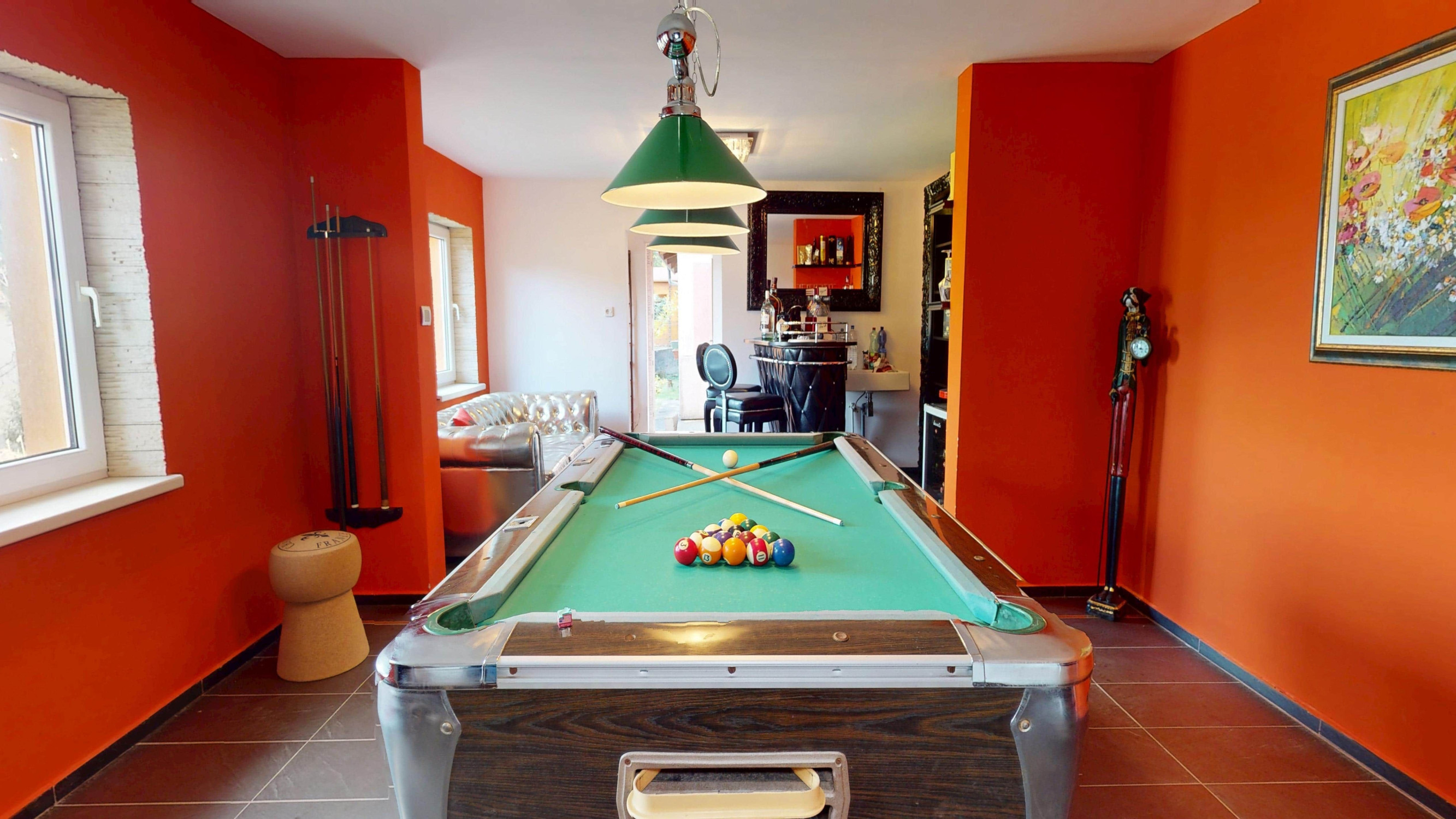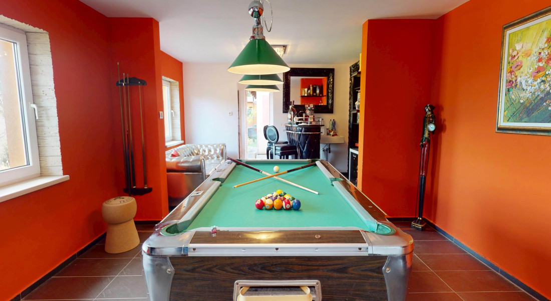 Skutočným bonusom je samostatný party domček v zadnej časti pozemku s vlastným barom, biliardovým stolom a klimatizáciou na kúrenie aj chladenie. Perfektný priestor na oslavy, spoločenské večery alebo exkluzívnu oddychovú zónu.