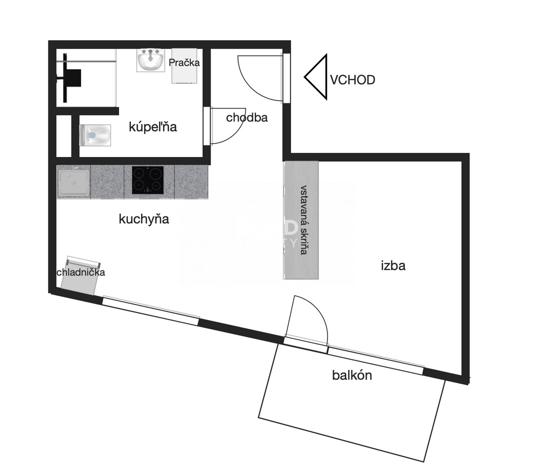 - vstupná chodba, priestranná kuchyňa, izba, kúpeľňa s wc