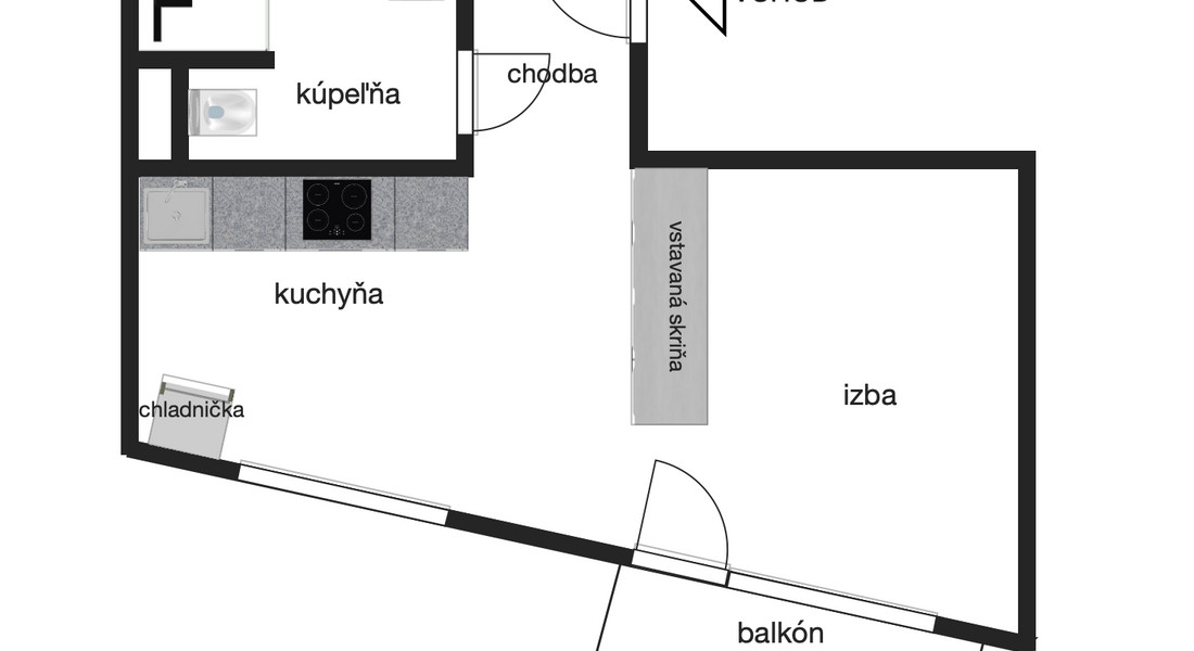 - vstupná chodba, priestranná kuchyňa, izba, kúpeľňa s wc