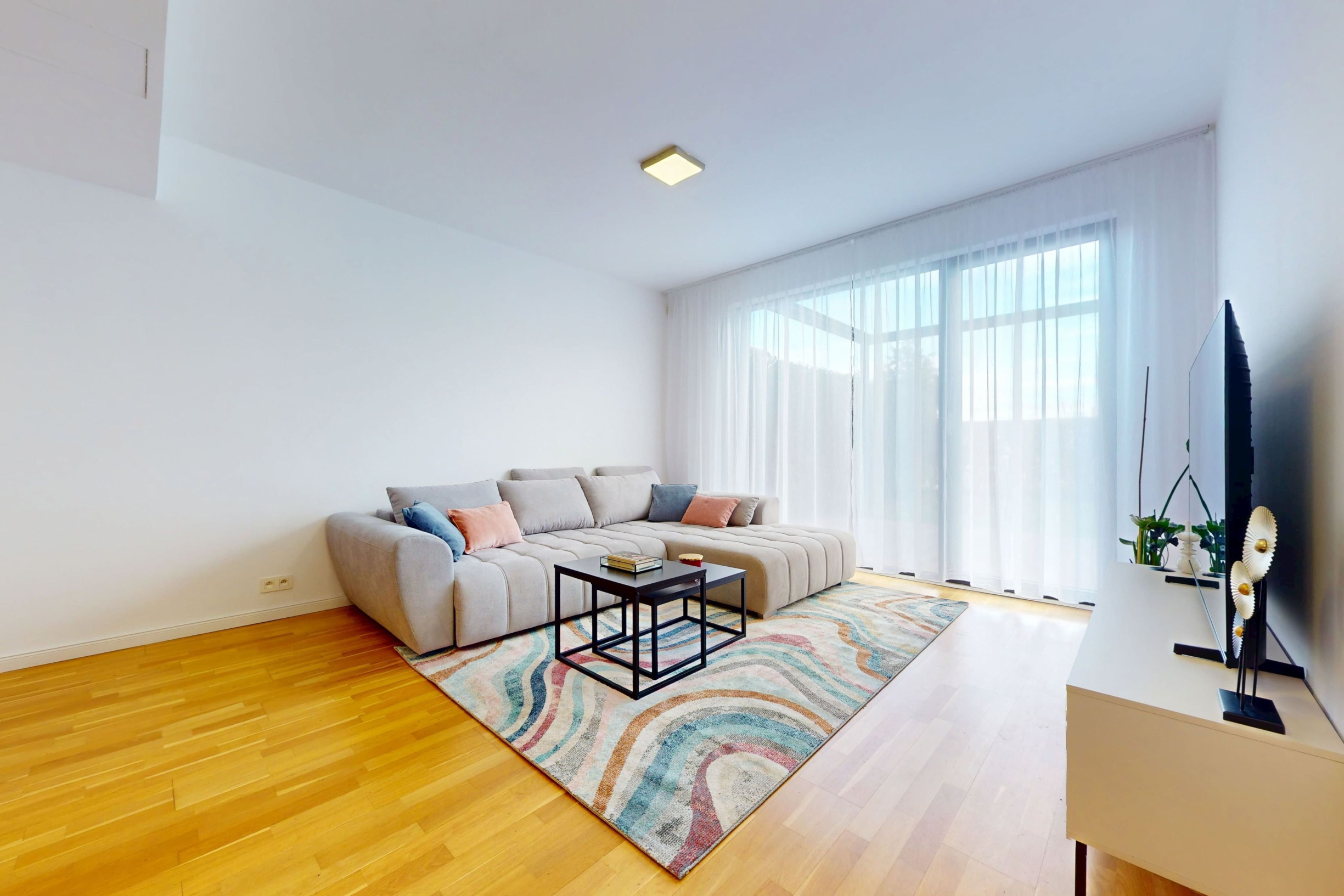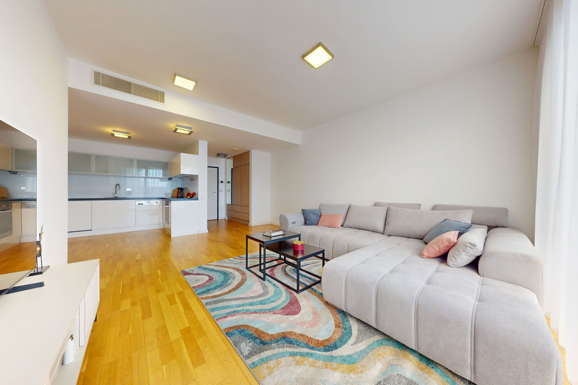 - living room connected to a modern kitchen (29.5 m²) equipped with built-in Miele appliances (electric oven, electric cooktop, extractor hood, dishwasher, fridge with freezer). The living area includes a dining table with chairs, a comfortable sofa bed, a coffee table, and an LCD TV,