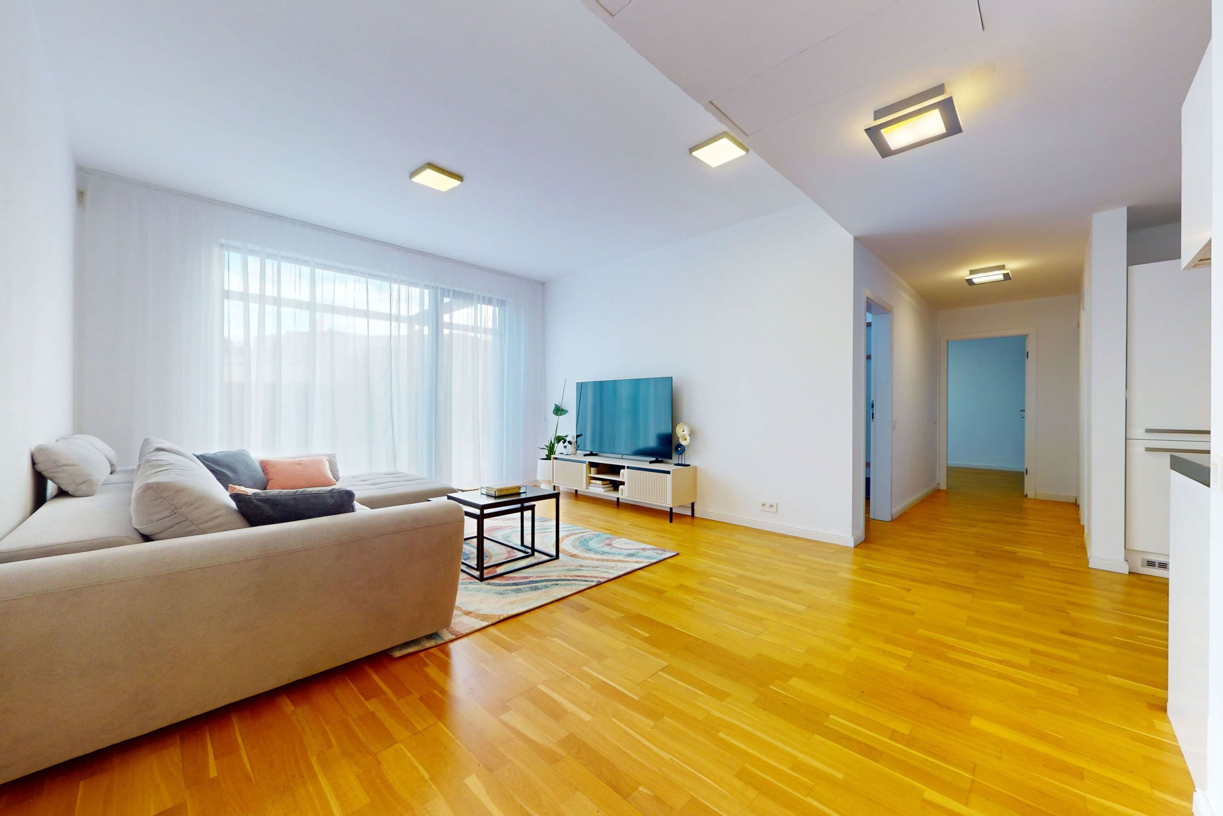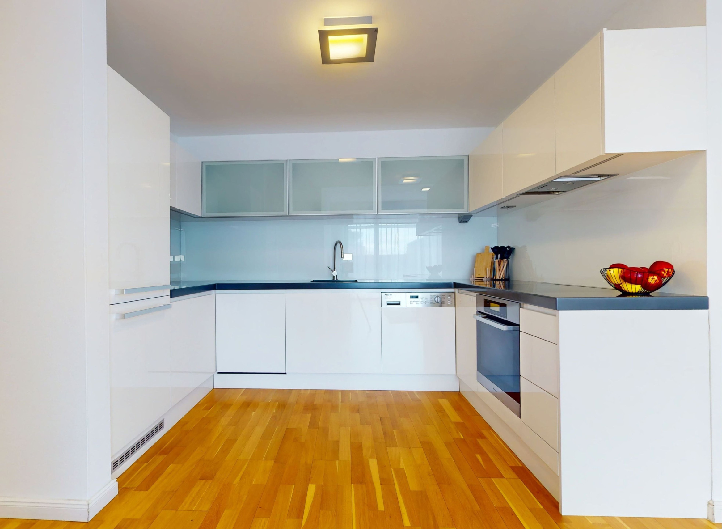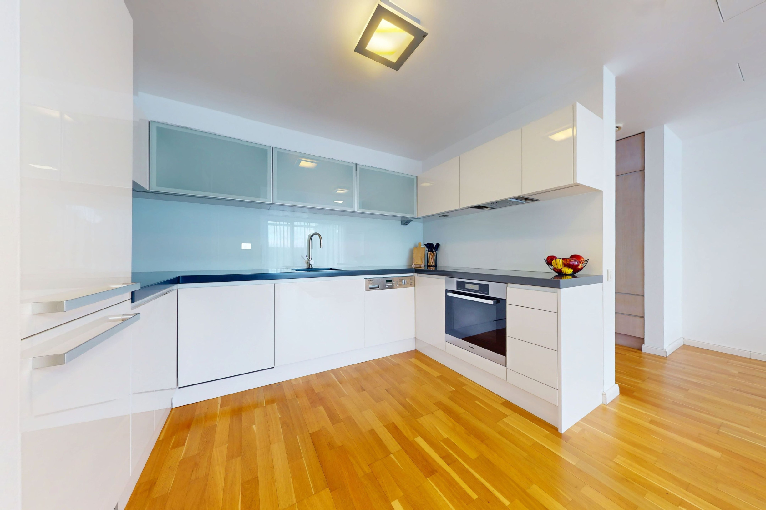 - wooden parquet floors in the living areas, kitchen, and hallway,