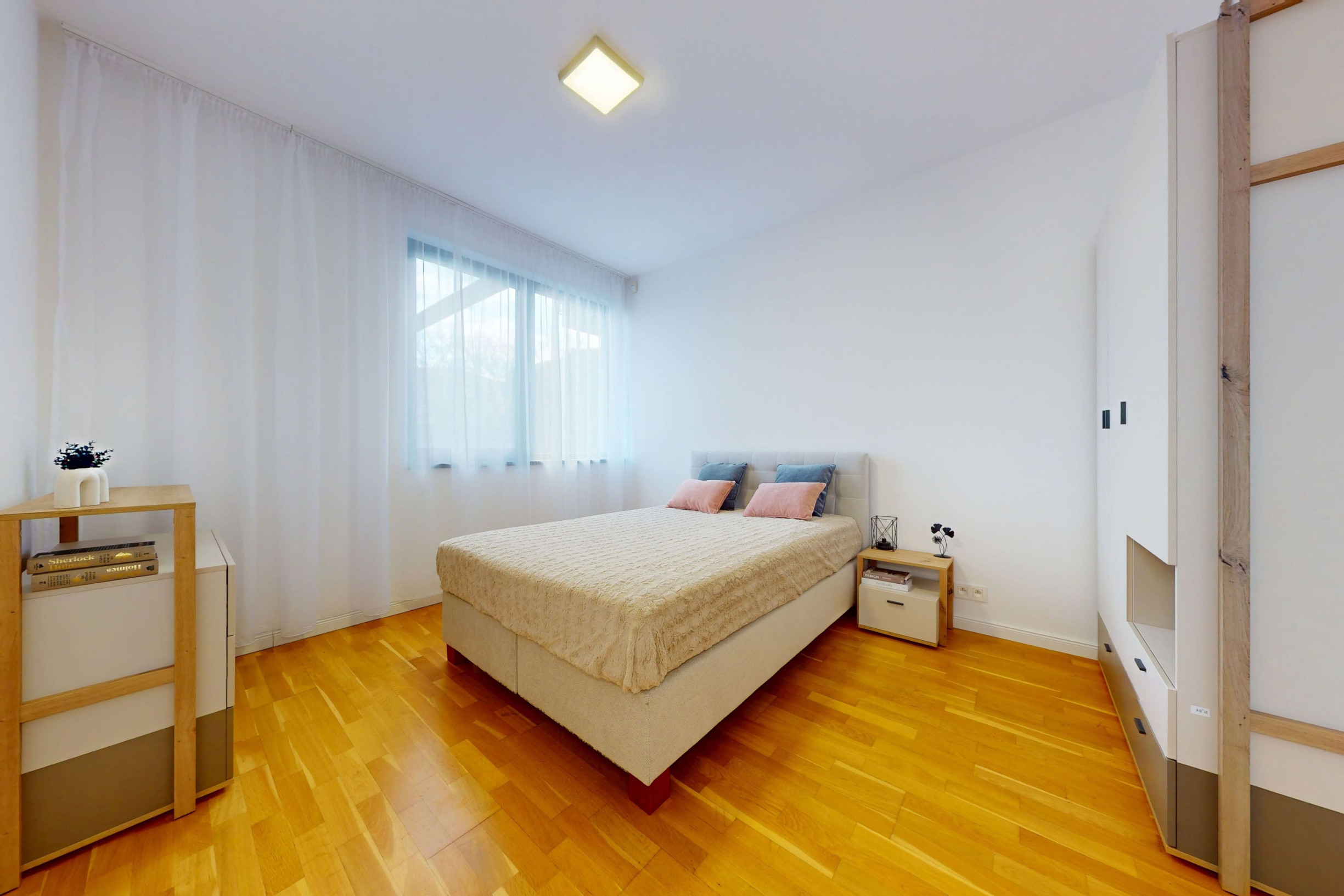 - 2 samostatné izby (12,87 m² a 17,22 m²). Väčšia spálňa je vybavená manželskou posteľou vo veľkosti 180cm x 200cm, nočným stolíkmi a veľkou vstavanou skriňou. Menšia spálňa disponuje manželskou posteľou vo veľkosti 140cm x 200cm , skriňou a úložnou komodou,