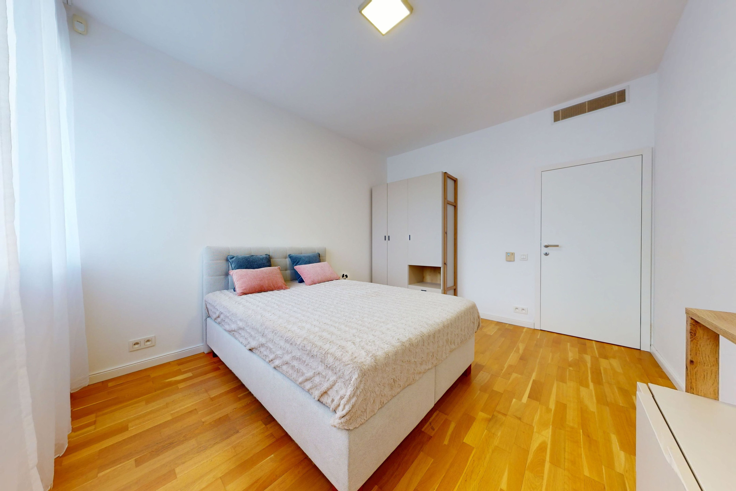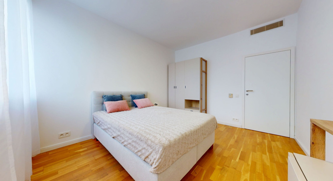 - 2 separate rooms (12.87 m² and 17.22 m²). The larger bedroom features a king-size bed (180cm × 200 cm), bedside tables, and a large built-in wardrobe. The smaller bedroom has a double bed (140cm × 200 cm), a wardrobe, and a storage chest of drawers,