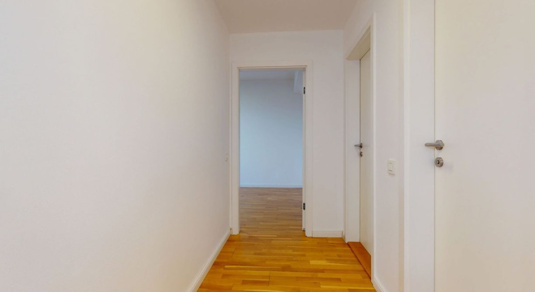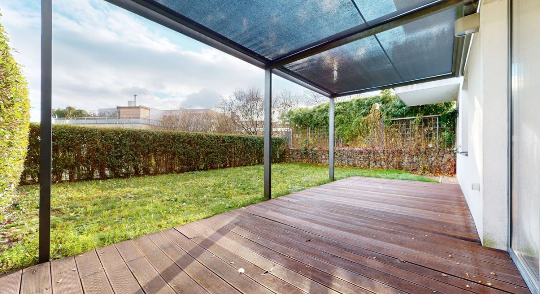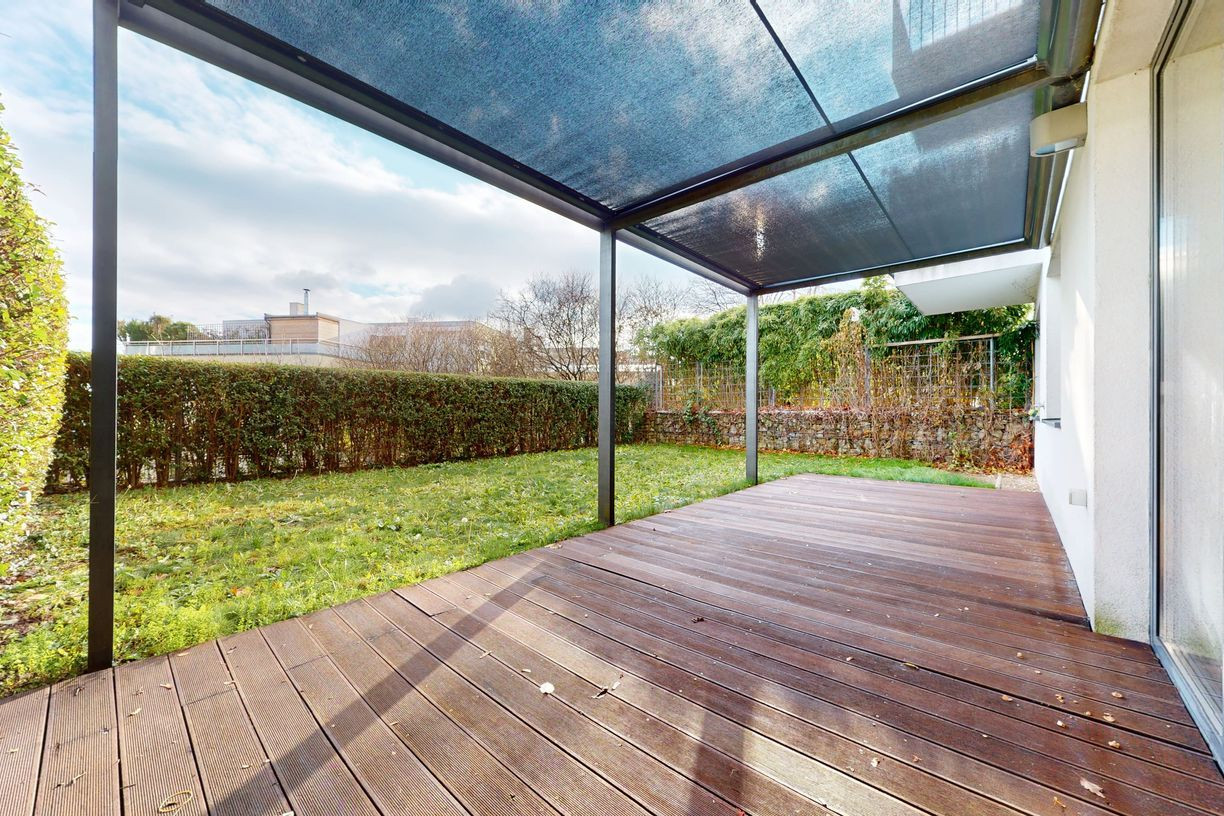 The apartment consists of three rooms, including the kitchen, a bathroom with a toilet, a separate toilet, a hallway, and a terrace with a generous garden. The total area of the apartment is 76.4 m² of interior space and 97 m² of exterior space. It is located on the lower floor and offers complete privacy. From the covered parking garage, you can walk barrier-free directly through the apartment into the large garden with a view of the city. The apartment is oriented to the southeast.