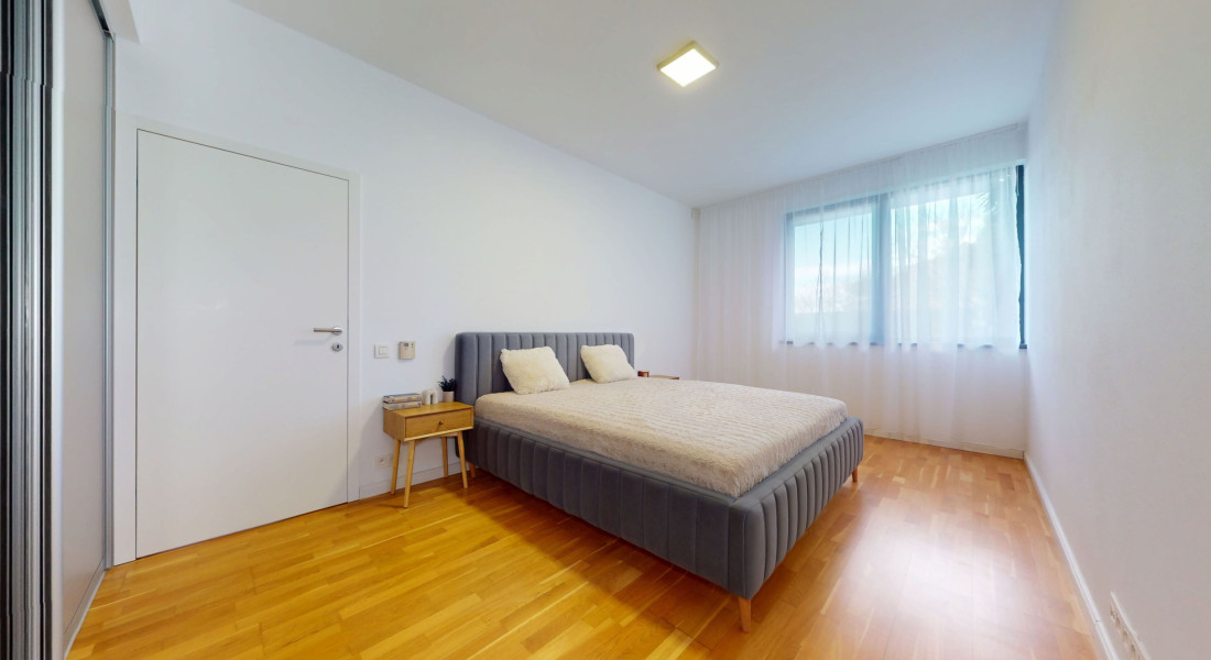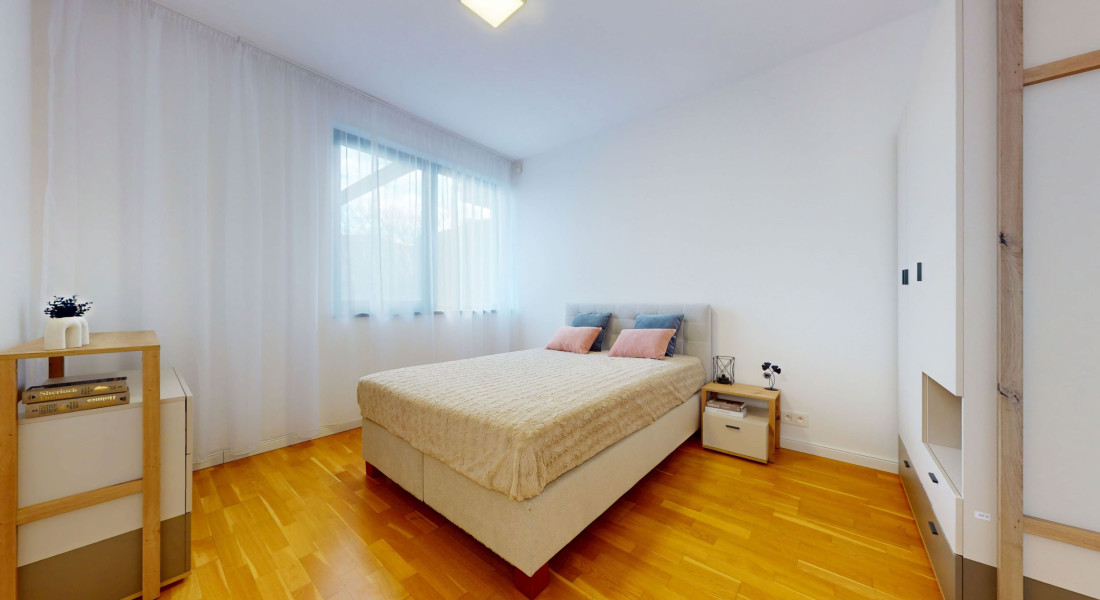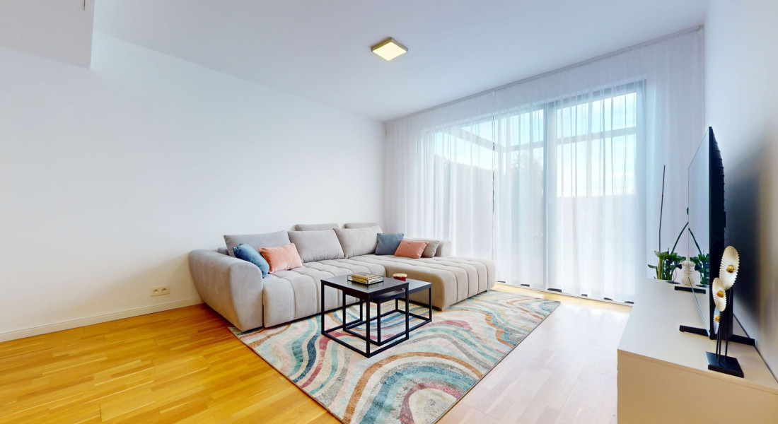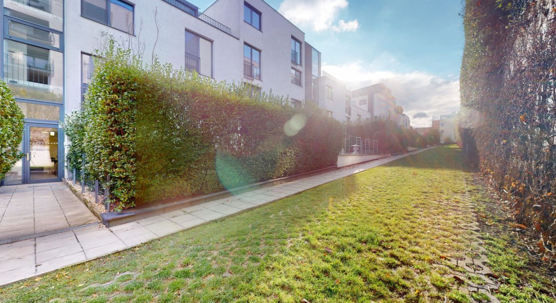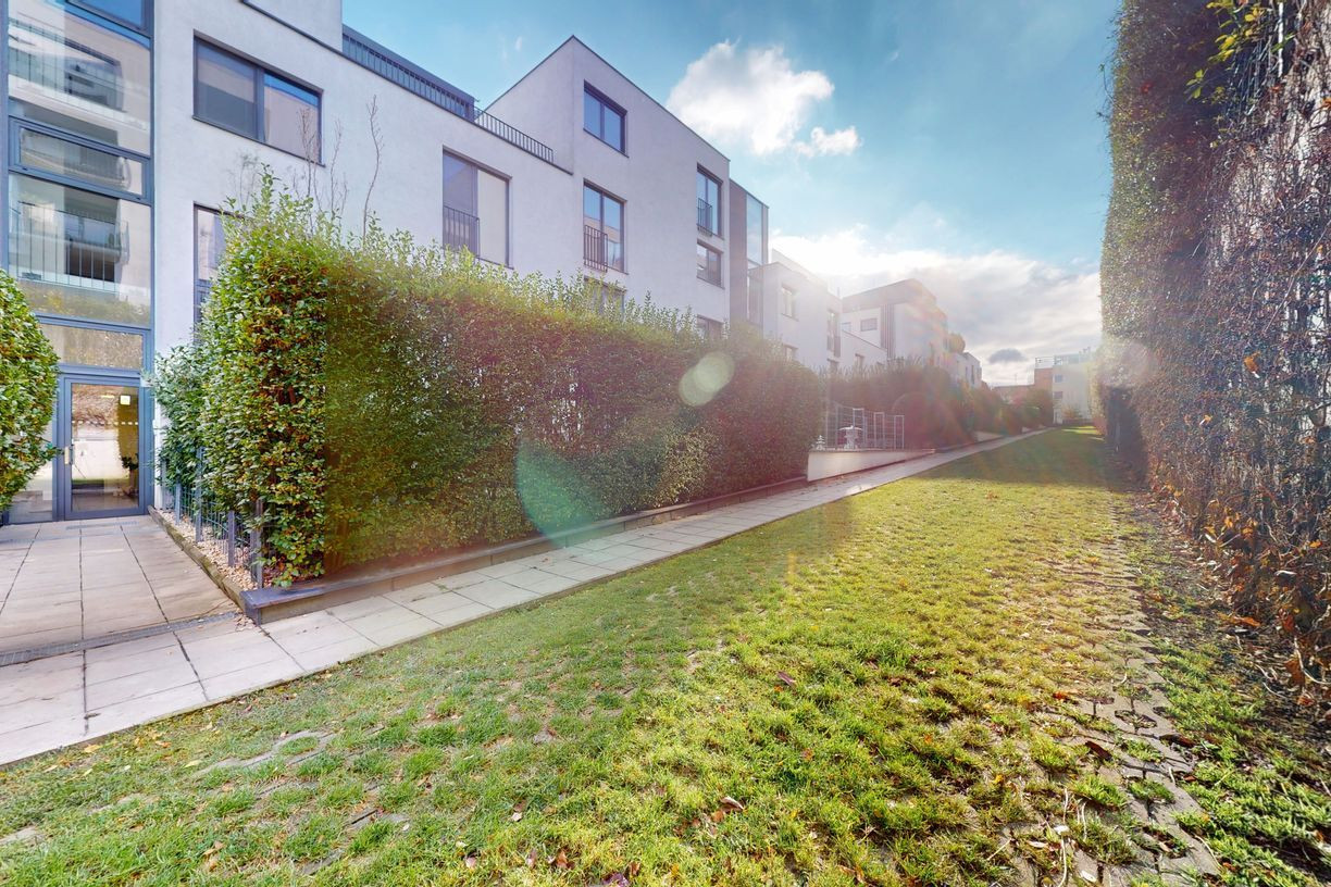 Byt pozostáva z troch obytných miestností vrátane kuchyne, kúpeľne s WC, samostatného WC, chodby a terasy s veľkorysou záhradou. Celková plocha bytu je 76,4 m² interiéru a 97 m² exteriéru. Nachádza sa na spodnom podlaží a poskytuje úplné súkromie. Z krytého parkoviska je možné bezbariérovo prejsť priamo cez byt do veľkej záhrady s výhľadom na mesto. Byt je orientovaný na juhovýchod.