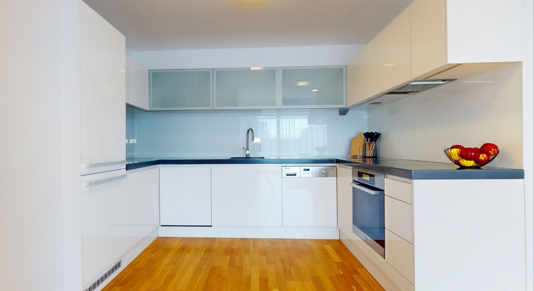 - obývacia izba prepojená s modernou kuchyňou (29,5 m²) vybavenou vstavanými spotrebičmi značky Miele (elektrická rúra, elektrická varná doska, odsávač pár, umývačka riadu, chladnička s mrazničkou). Jedálenský stôl so stoličkami, pohodlná rozťahovacia sedačka, konferenčný stolík a LCD televízor ako súčasť obývacej časti,