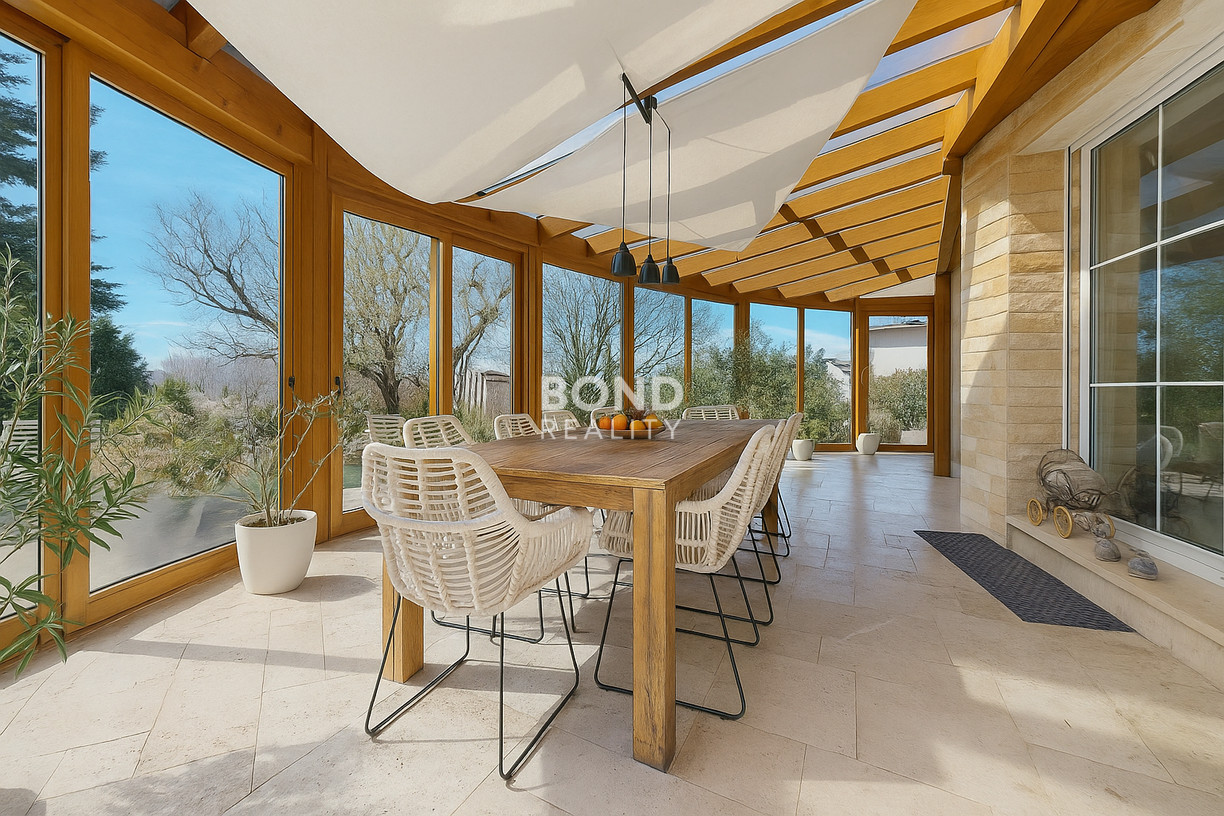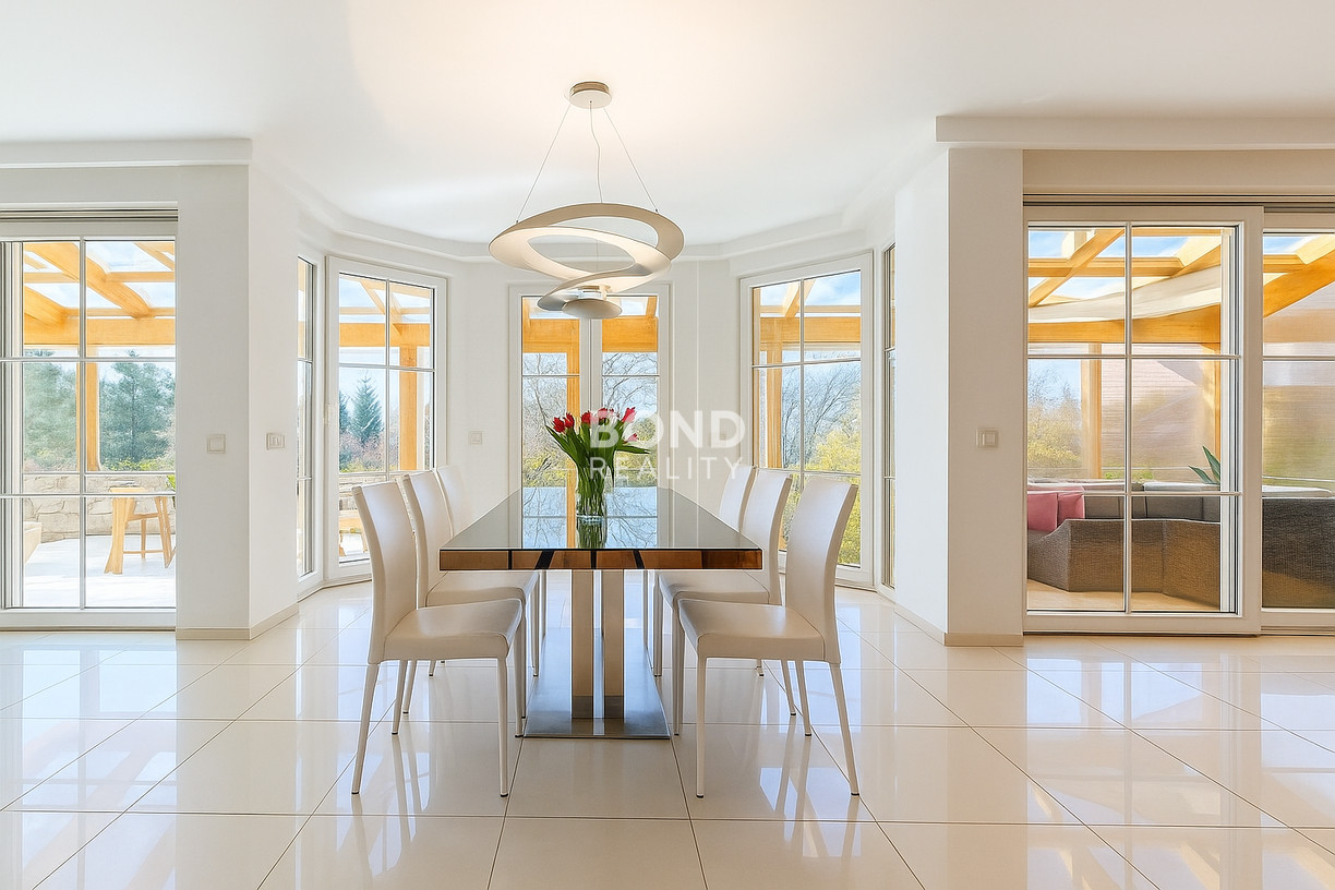 V polosuteréne sa nachádza wellness zóna so saunou, posilňovňou, sprchou a technickým zázemím. Veľkým benefitom je krytý bazén s priamym vstupom do záhrady. Exteriér ponúka altánok na rodinné posedenia, záhradný domček a dvojgaráž.