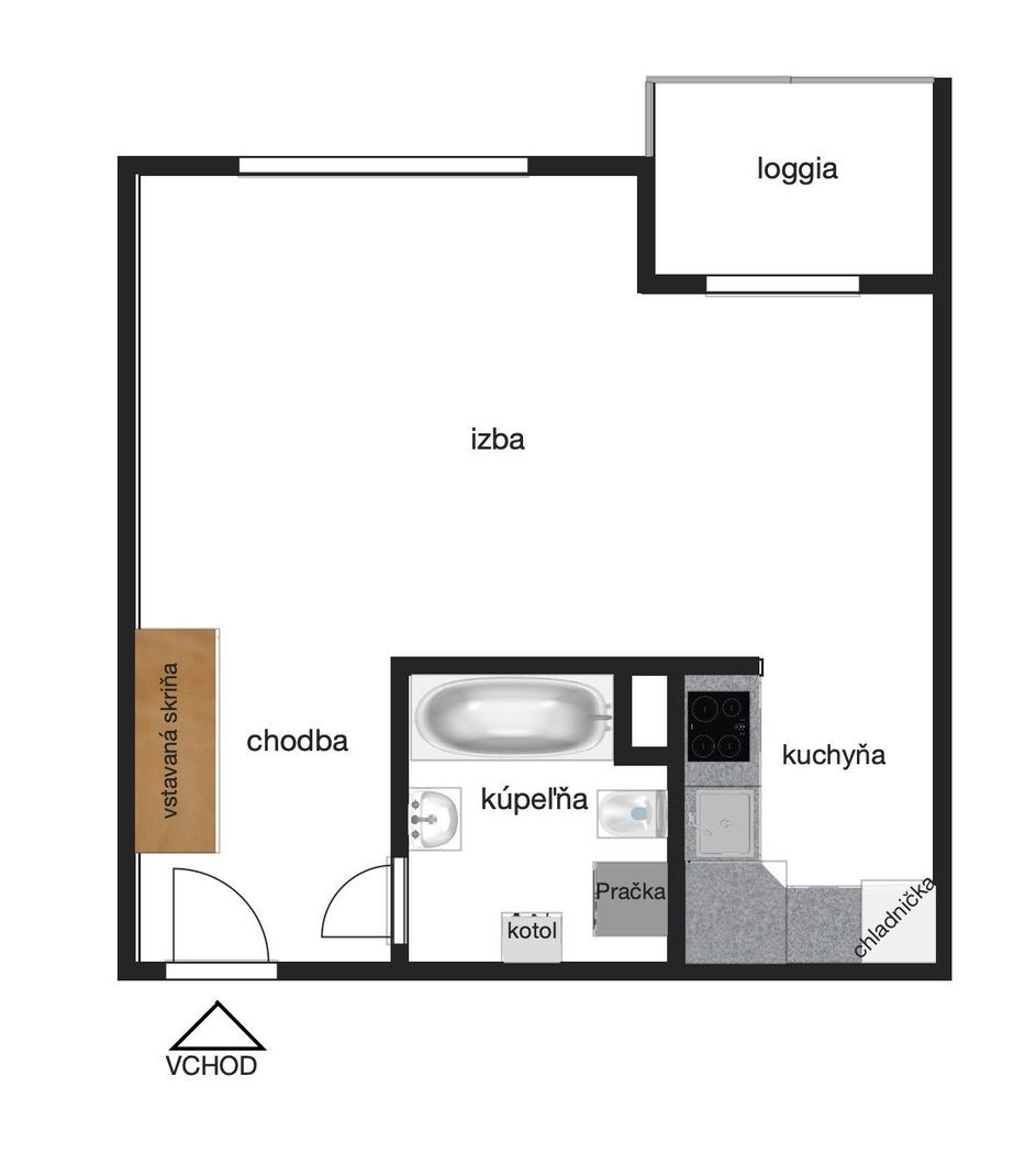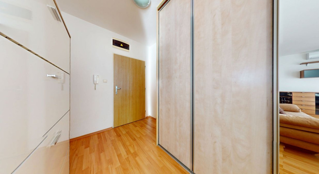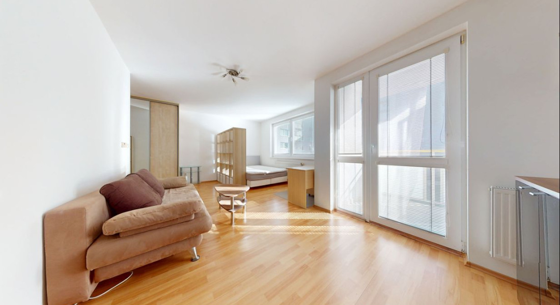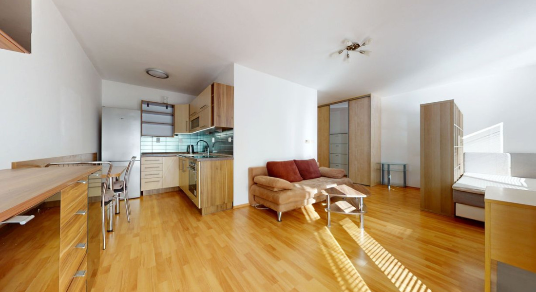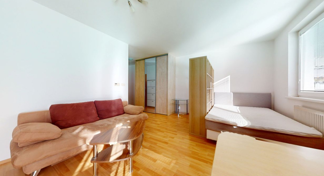Byt je dobre dispozične riešený, pozostáva zo vstupnej chodby so vstavanou skriňou, kúpeľne s vaňou a WC, spacieho kútu, obývačky spojenej s kuchyňou s výstupom na balkón a murovanej pivnice (2,1 m²).