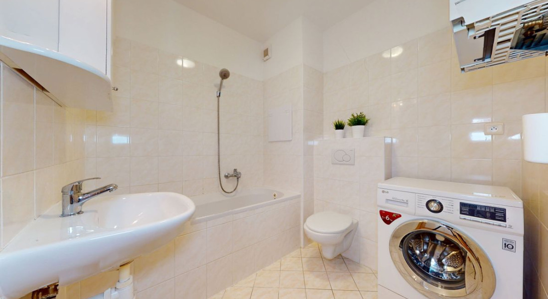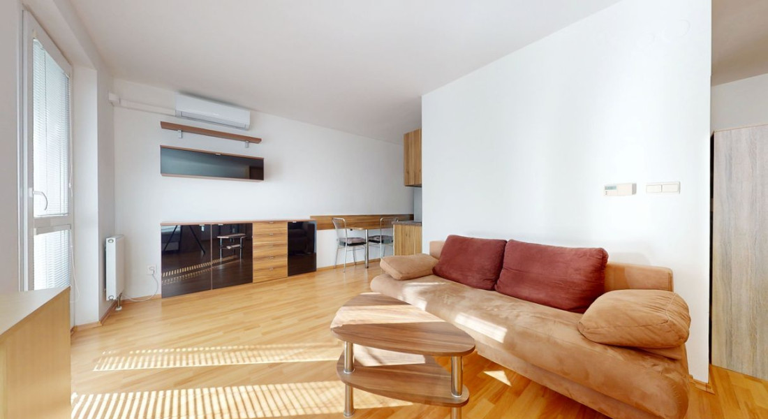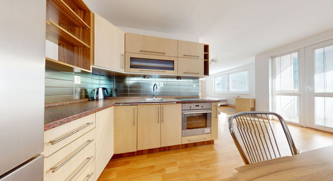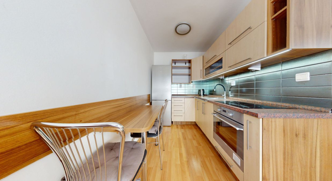 Byt je dokončený do štandardu — bezpečnostné vchodové dvere, interiérové dvere, podlahy, obklady, dlažba, sanita, kuchynská linka so zabudovanými spotrebičmi, klimatizácia a vlastný plynový kotol. Predáva sa vrátane zariadenia a spotrebičov.