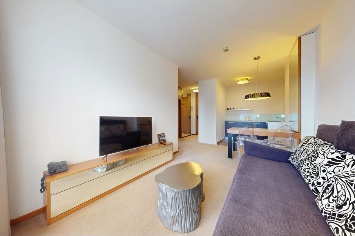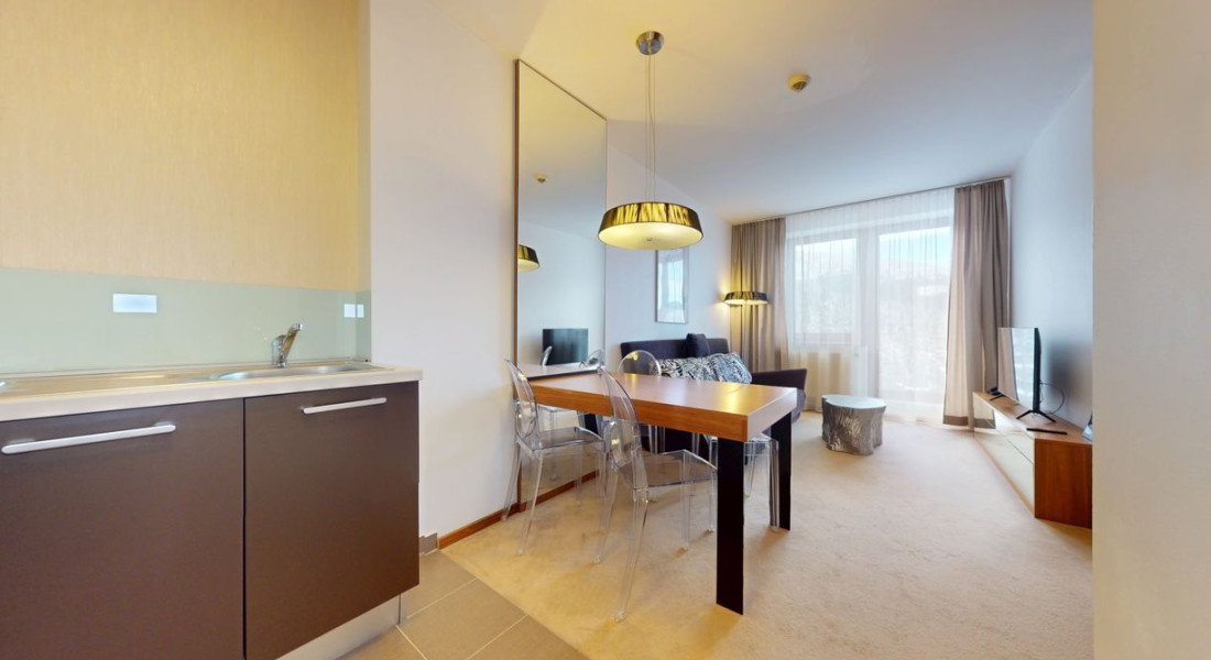 Dispozícia apartmánu : vstupná chodba so vstavanou skriňou, samostatná spálňa so vstupom na balkón, obývacia časť s otvorenou dispozíciou do kuchynskej časti, kúpeľňa s vaňou a toaletou.