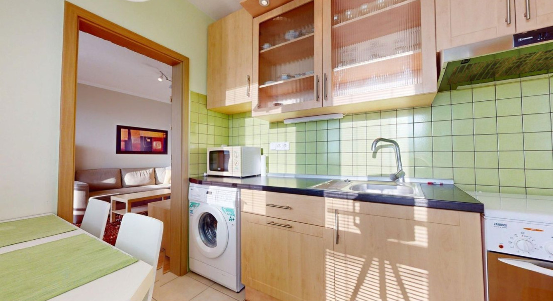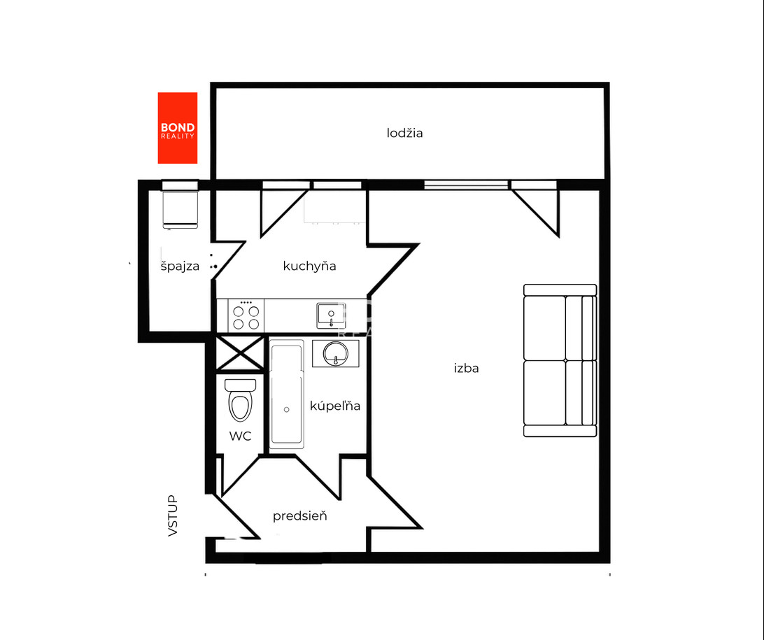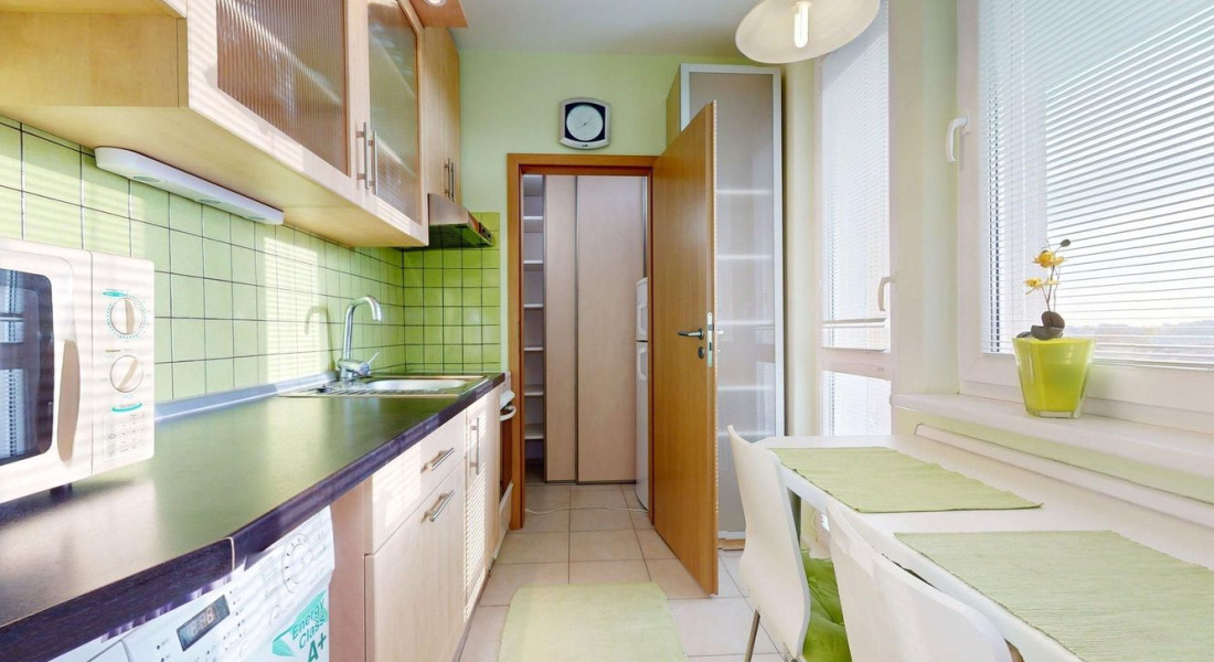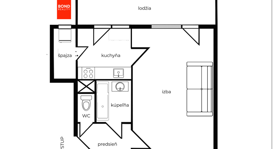 Dispozícia bytu umožňuje prerobenie na 1,5-izbový byt: vstupná chodba, samostatná kuchyňa so špajzou a vstupom na loggiu, izba s výstupom na loggiu, kúpeľňa s vaňou, samostatné WC a nadštandardne veľká pivnica.