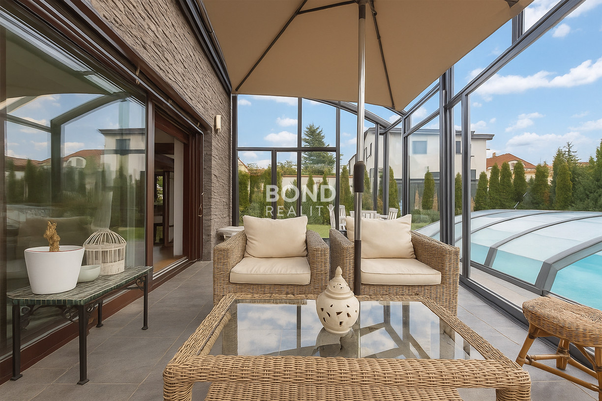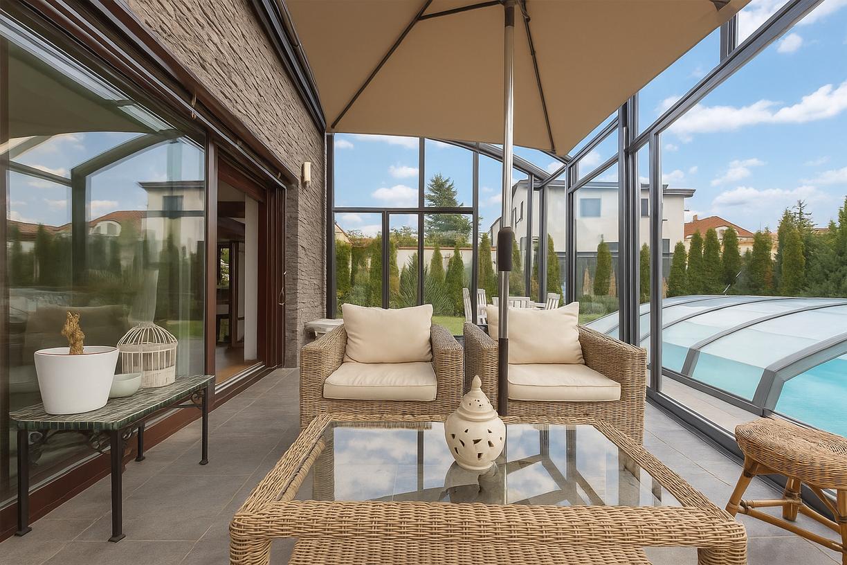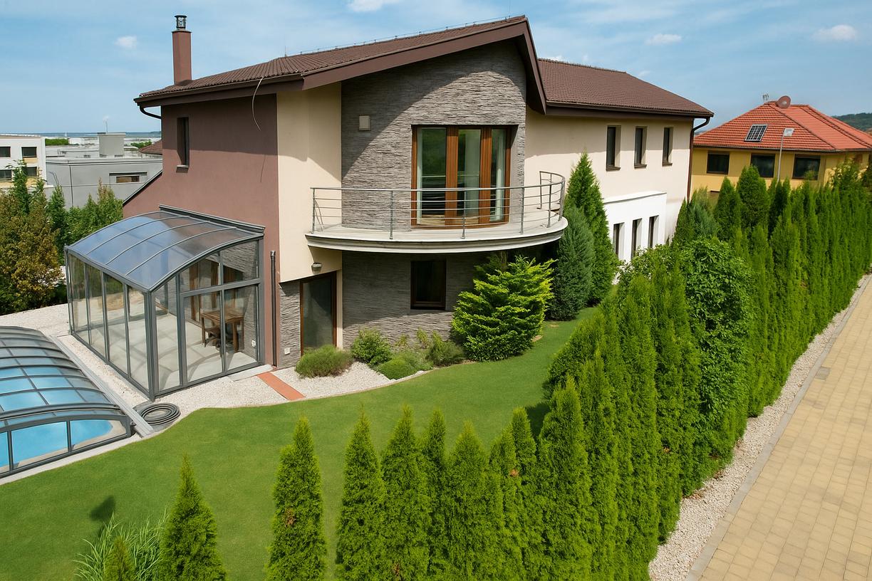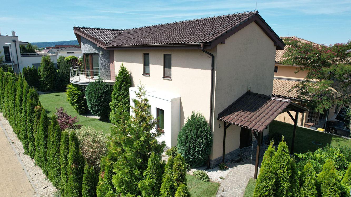 V exteriéri sa nachádza keramický bazén so zastrešením, zasklená plne otvárateľná terasa s hliníkovými profilmi, okrasná a udržiavaná záhrada so závlahou a garáž pre jedno auto. Celý pozemok pôsobí harmonicky a ponúka maximálne súkromie.