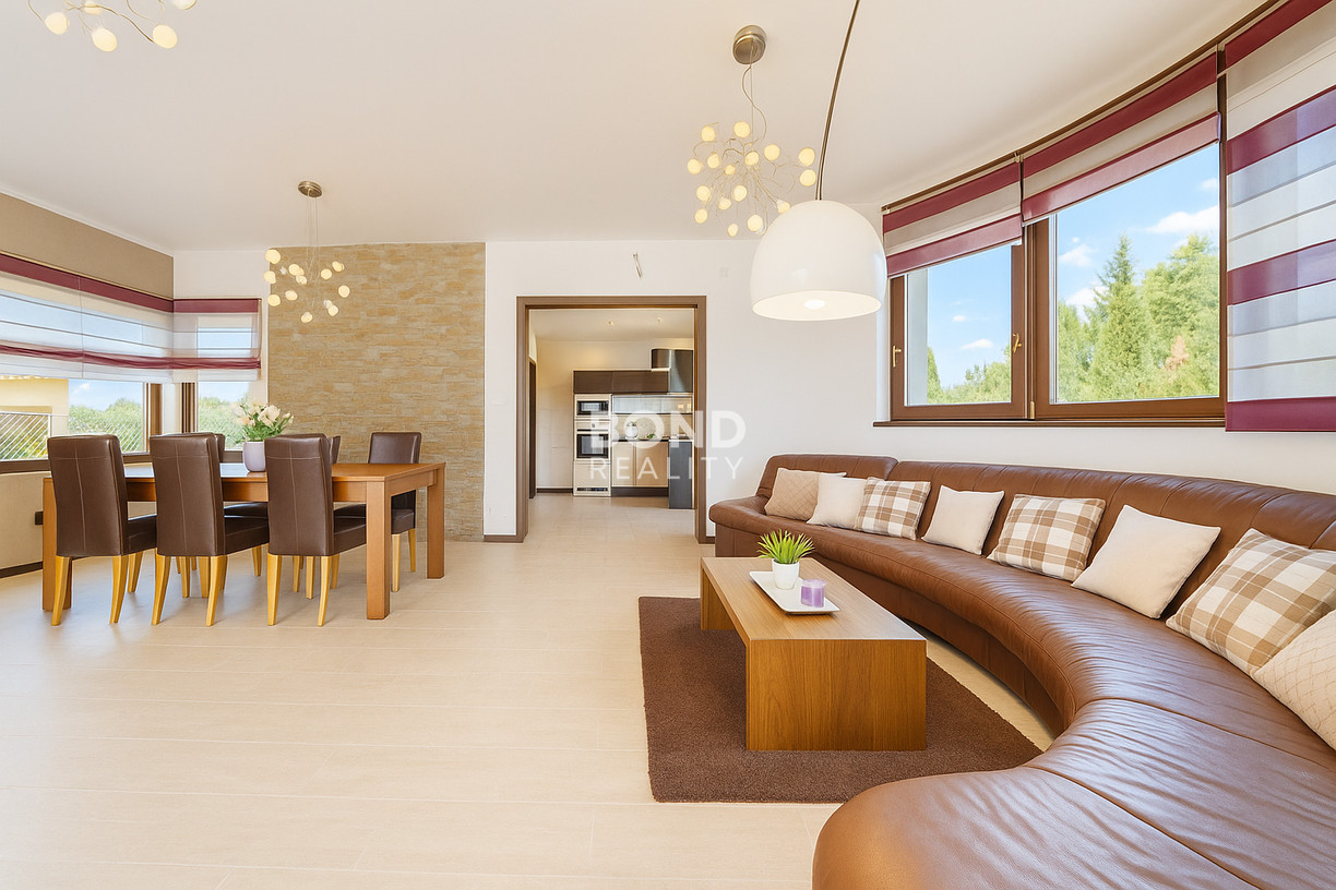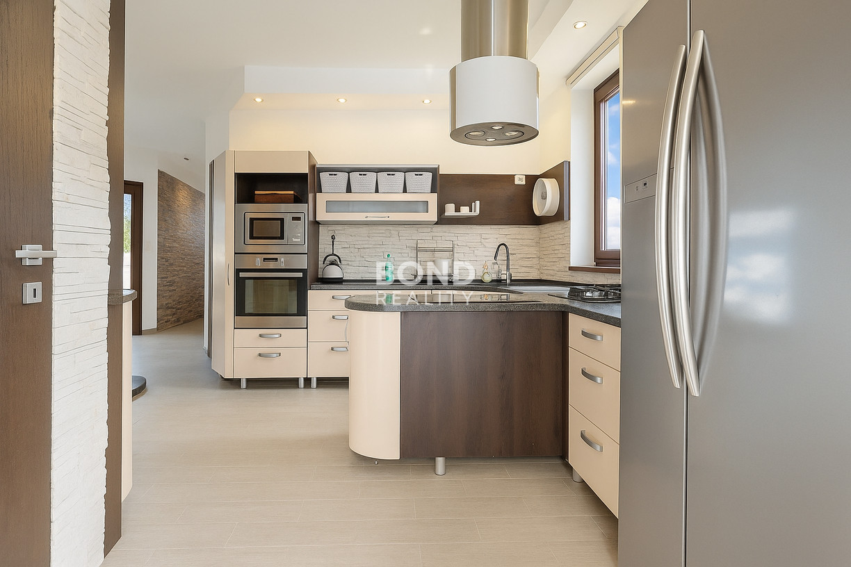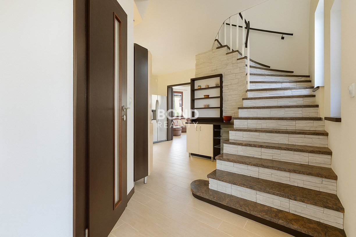 Dispozícia domu je rozdelená na dve podlažia. Na prízemí sa nachádza vstupná hala s veľkým samostatným šatníkom, predsieň, hosťovská izba, priestranná kúpeľňa s WC, kuchyňa so špajzou a veľká obývacia izba s krbom a priamym vstupom na terasu a do záhrady. Poschodie tvorí rodičovská spálňa s vaňou a vlastným šatníkom, dve samostatné izby, kúpeľňa, samostatné WC a vstavané rolldory.