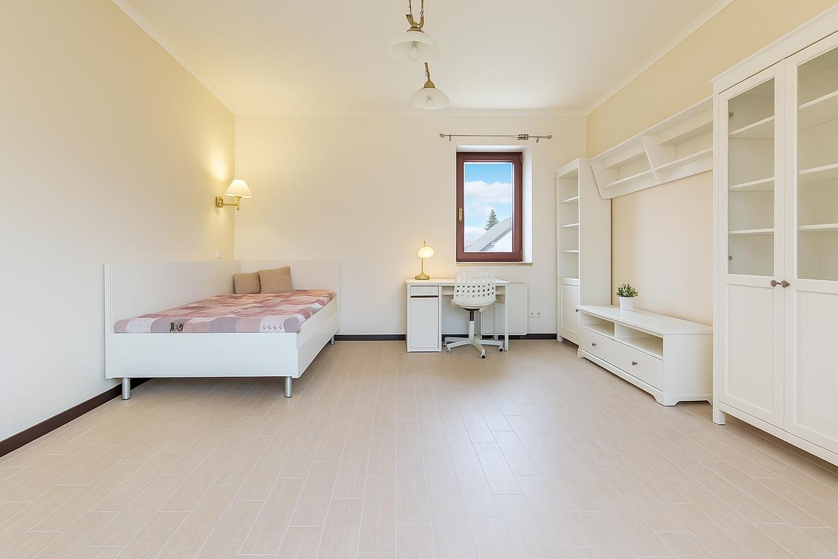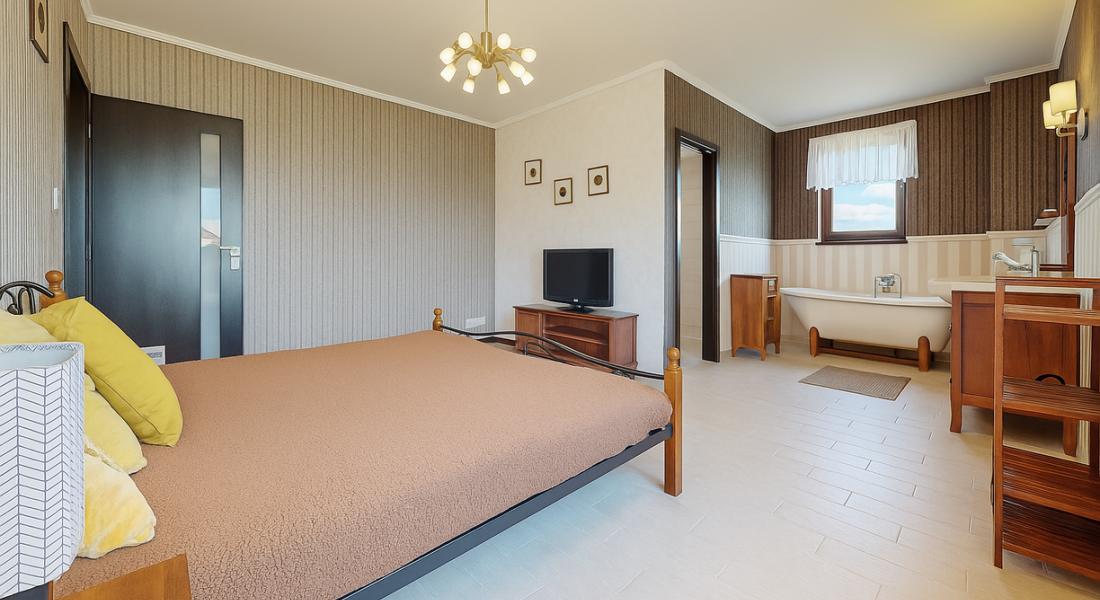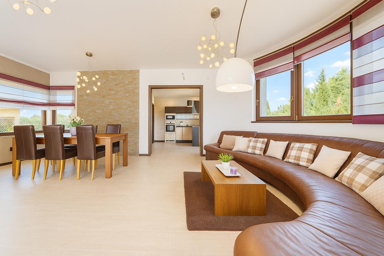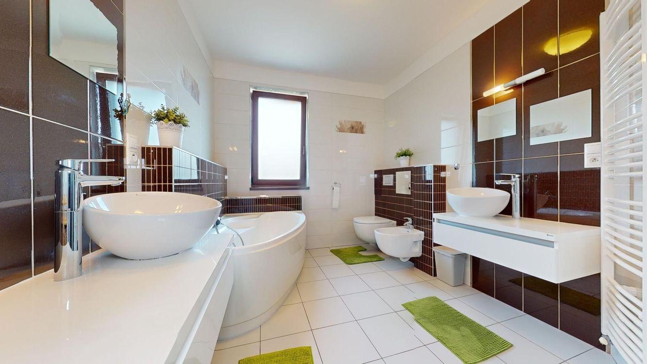 Dispozícia domu je rozdelená na dve podlažia. Na prízemí sa nachádza vstupná hala s veľkým samostatným šatníkom, predsieň, hosťovská izba, priestranná kúpeľňa s WC, kuchyňa so špajzou a veľká obývacia izba s krbom a priamym vstupom na terasu a do záhrady. Poschodie tvorí rodičovská spálňa s vaňou a vlastným šatníkom, dve samostatné izby, kúpeľňa, samostatné WC a vstavané rolldory.