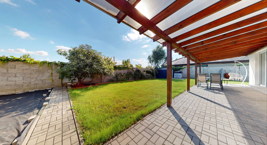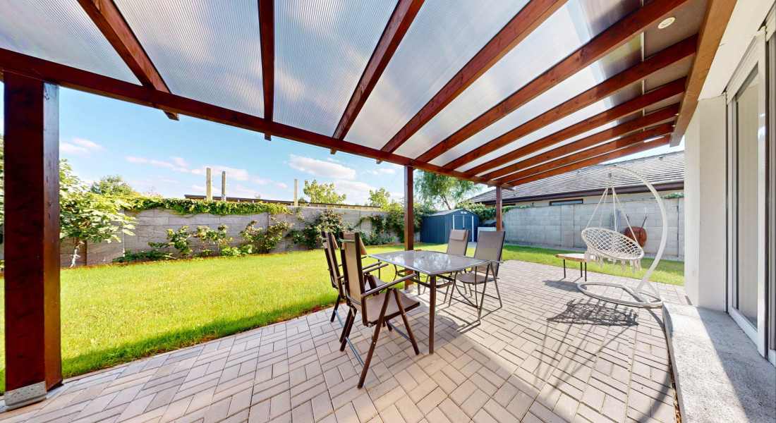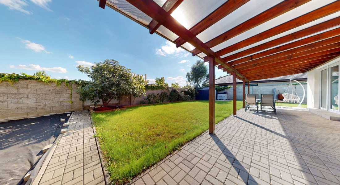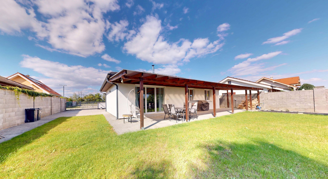 Z obývačky sa vychádza priamo na lexanom plne prestrešenú terasu s výhľadom na zrevitalizovanú záhradu, ktorá disponuje automatickou závlahou čerpajúcou vodu z vlastnej studne.