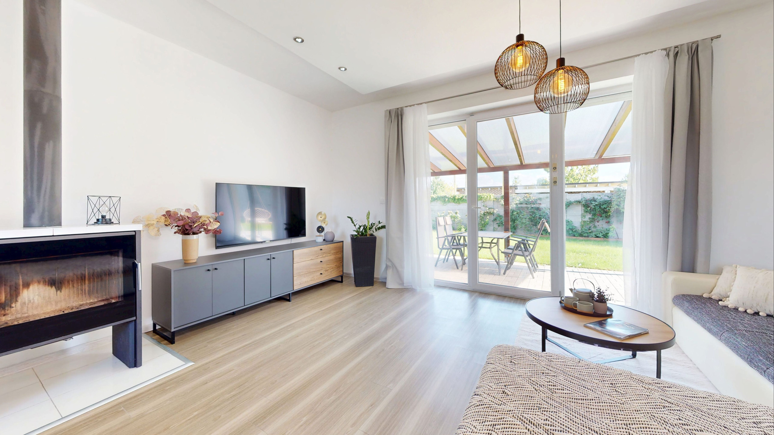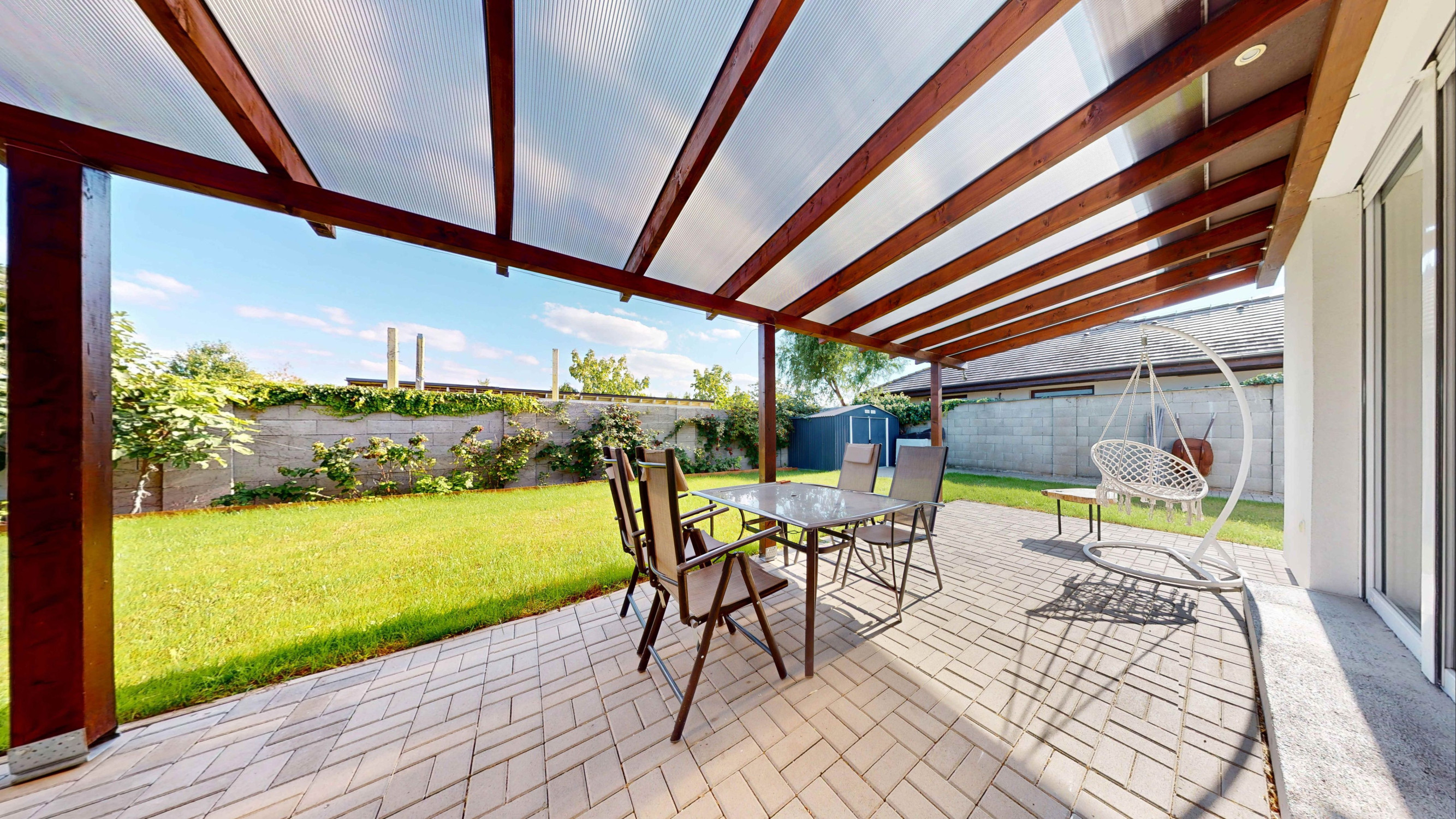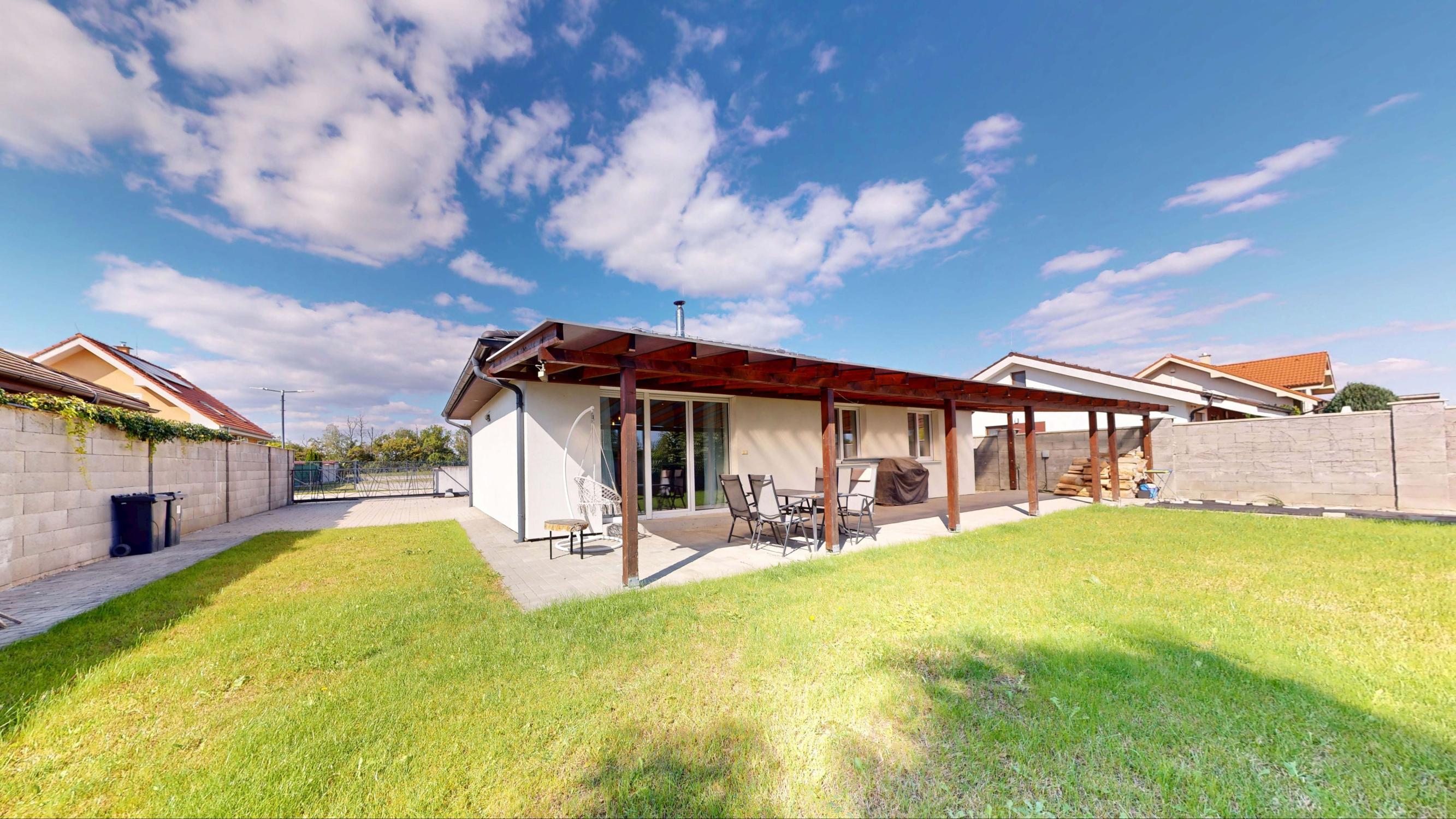 Z obývačky sa vychádza priamo na lexanom plne prestrešenú terasu s výhľadom na zrevitalizovanú záhradu, ktorá disponuje automatickou závlahou čerpajúcou vodu z vlastnej studne.
