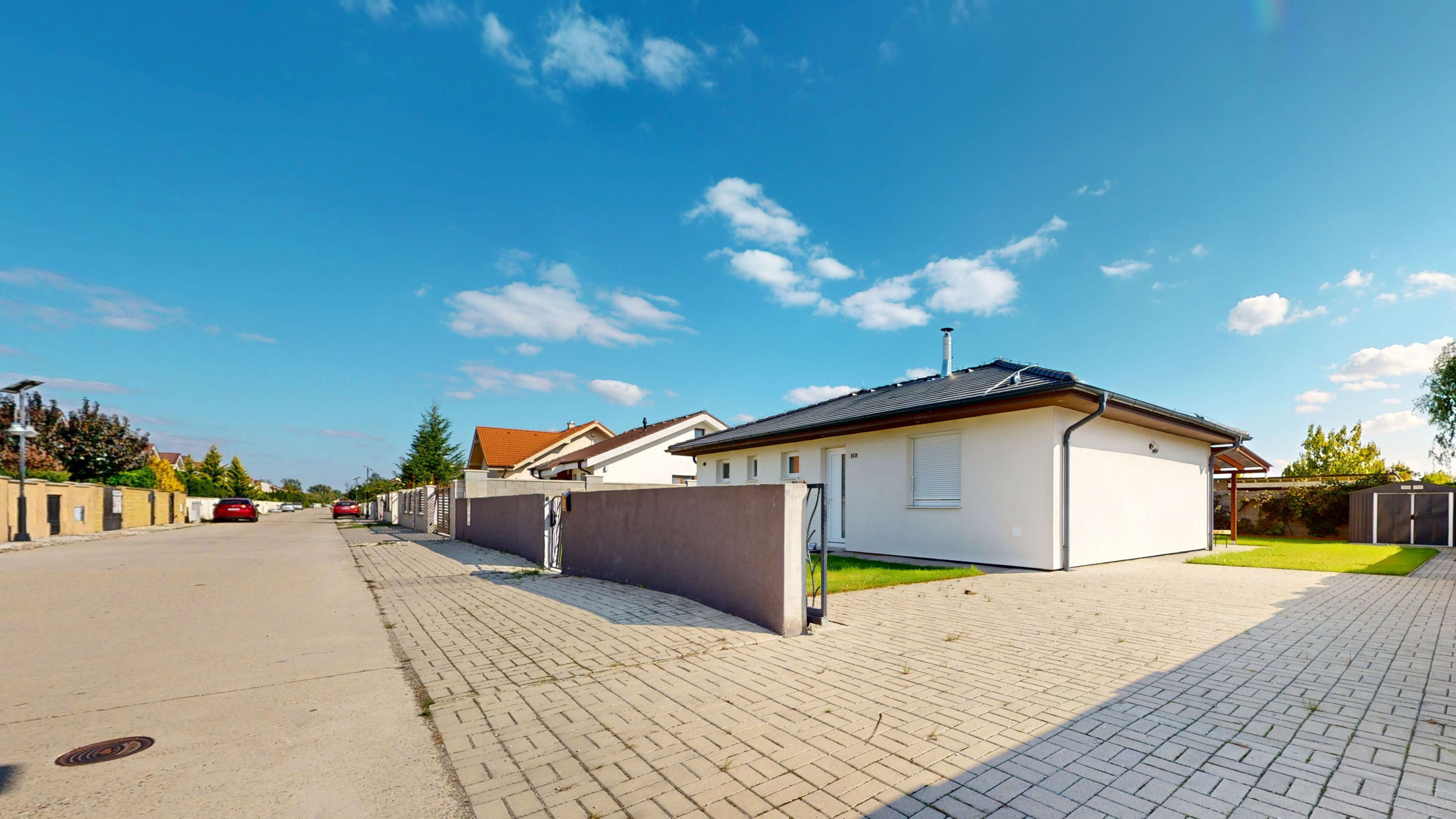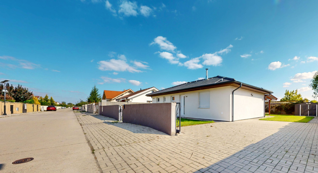 Terasa je pokrytá zámkovou dlažbou, rovnako ako predná časť pozemku a priestorov určených na parkovanie (2 parkovacie miesta priamo na pozemku, možnosť parkovania návštev v počte 3 parkovacích miest priamo pred bránou), brána je plne elektricky ovládateľná, na pozemku sa nachádza aj záhradný domček.