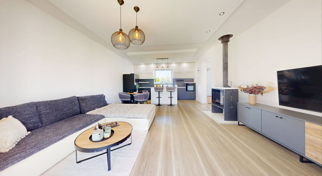 Priestranná obývačka ponúka krb, ktorý dodáva nie len teplo v chladných dňoch, ale dotvára aj unikátnu atmosféru počas sychravých dní. Krb prešiel tohto roku kompletnou revíziou a bol pravidelne kontrolovaný každú sezónu.