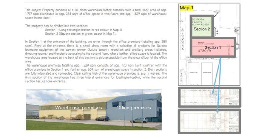 Charakteristika skladu – sklad pozostáva z 2 častí, v prvej časti o výmere 720m2 sa nachádza 3x vstupná rampa (+hygiena), druhá časť skladu má výmeru 609m2 a nemá samostatný vonkajší vchod. Výška oboch častí skladu je cca. 5m.