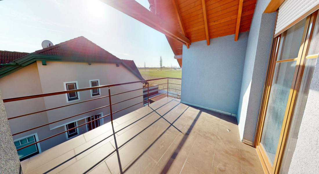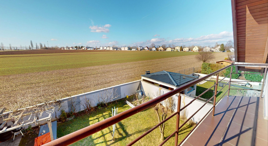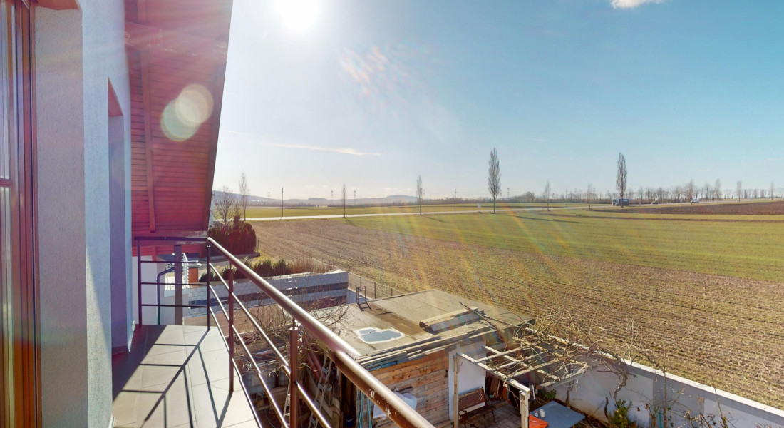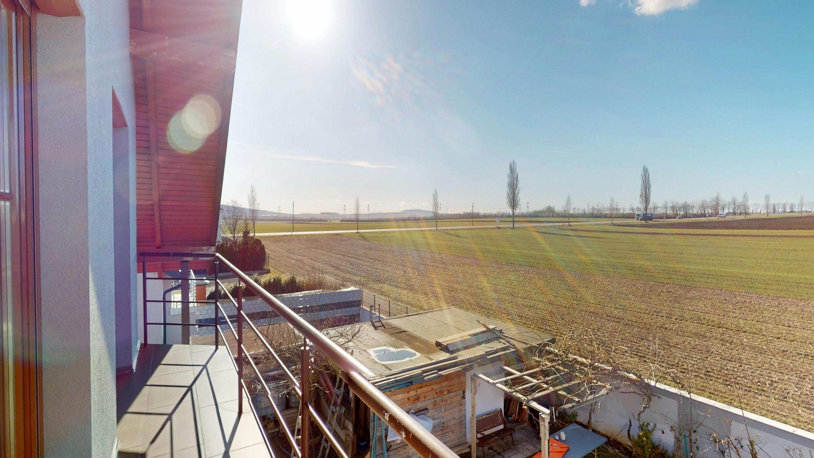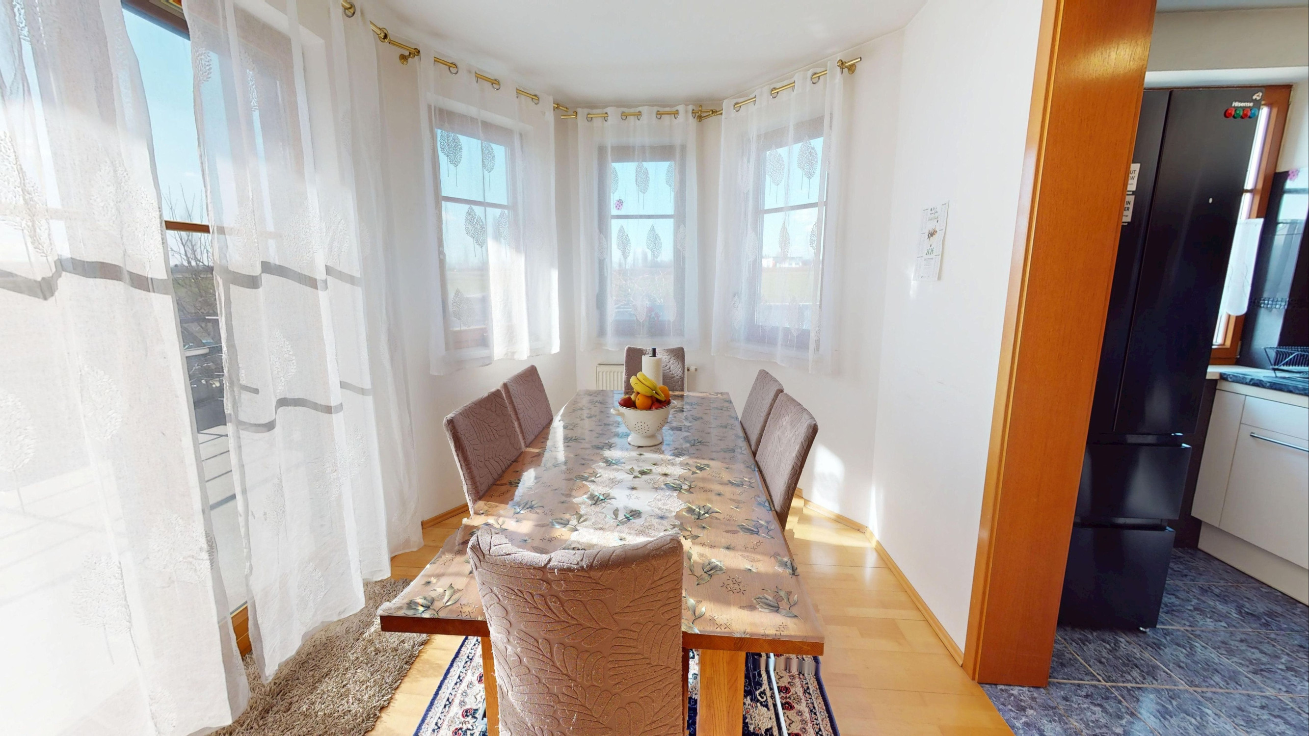 Samostatná kuchyňa je plne vybavená a plynulo nadväzuje na jedálenskú časť, odkiaľ sa otvára krásny výhľad na okolité polia Maria Ellend. Odtiaľ je zároveň vstup na balkón / terasu s priamym prístupom do záhrady.