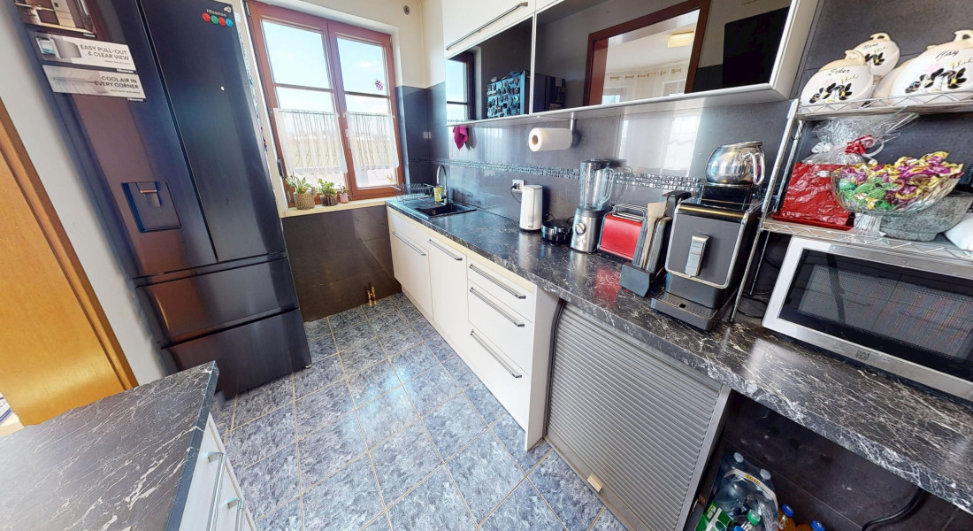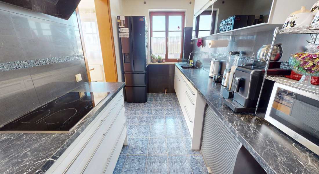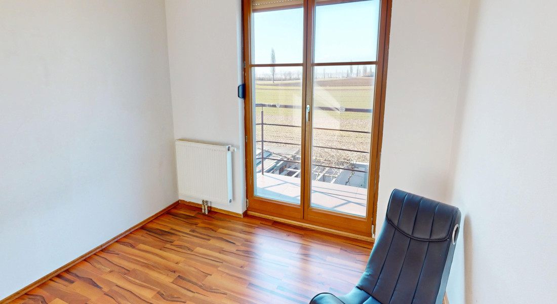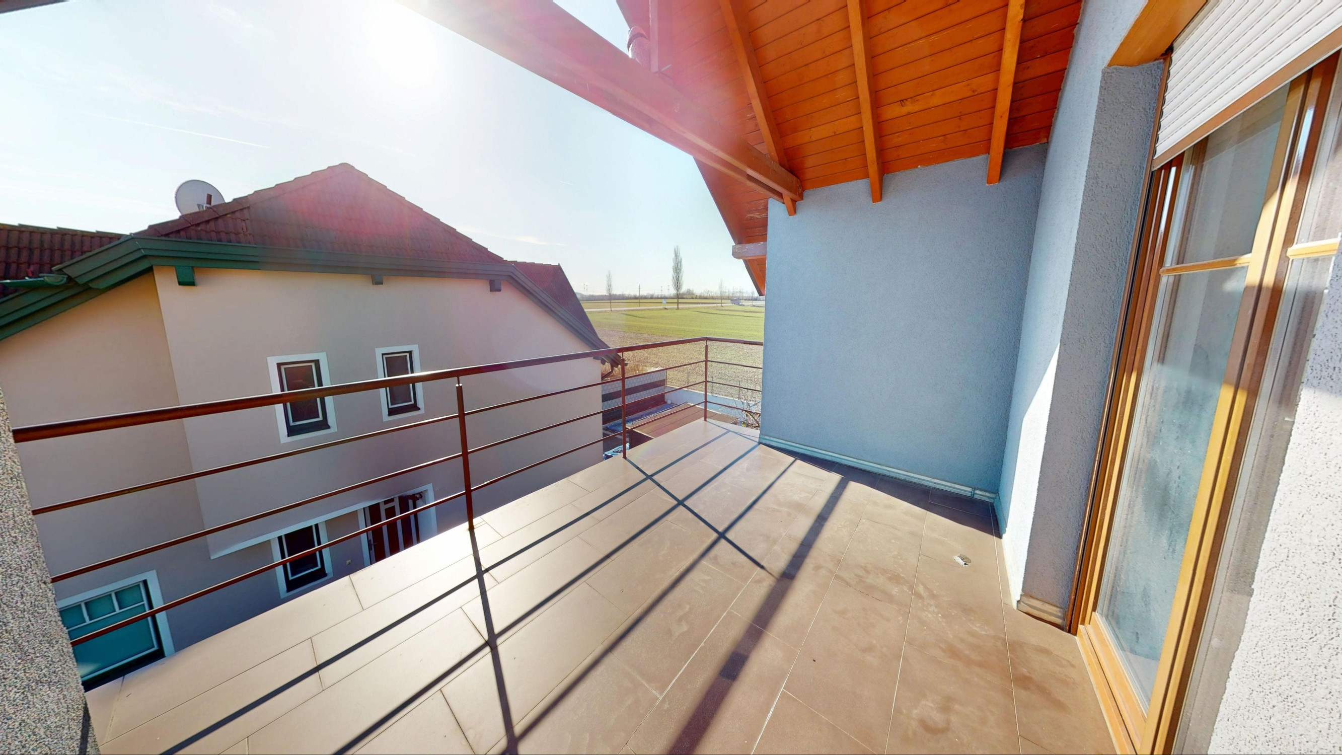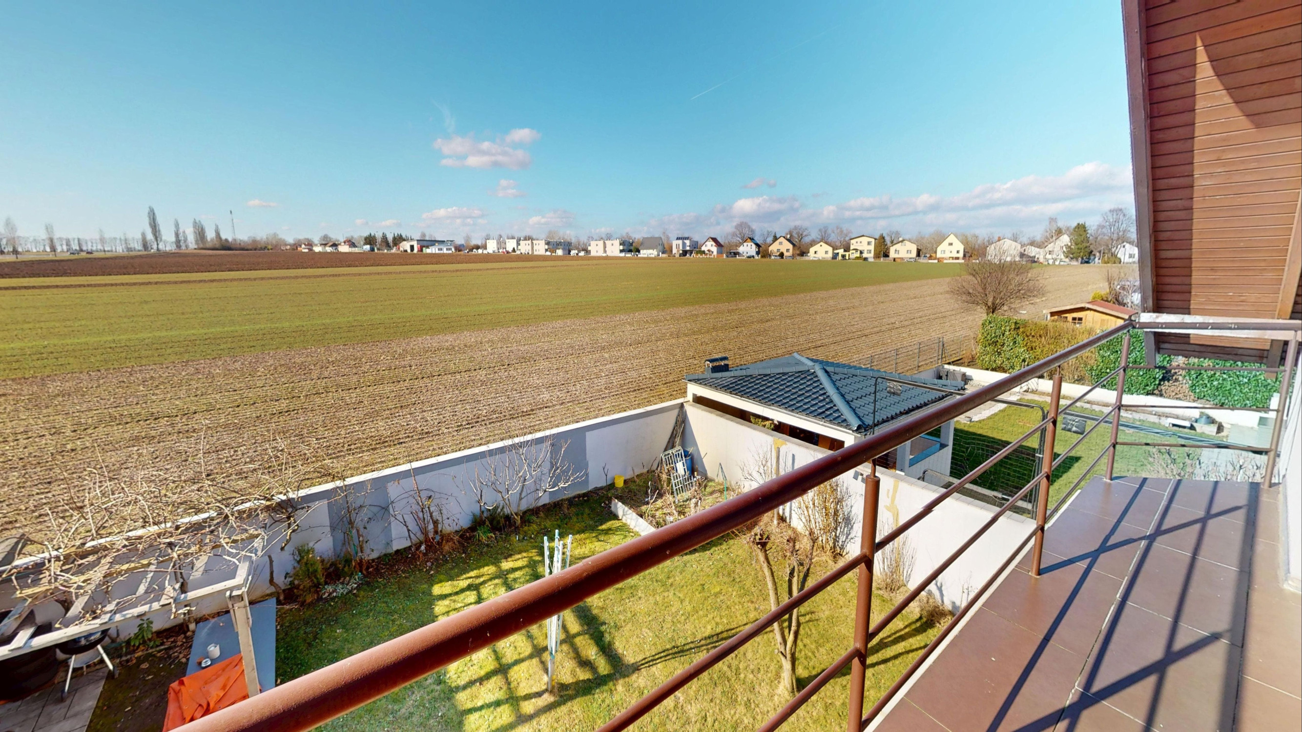 Samostatná kuchyňa je plne vybavená a plynulo nadväzuje na jedálenskú časť, odkiaľ sa otvára krásny výhľad na okolité polia Maria Ellend. Odtiaľ je zároveň vstup na balkón / terasu s priamym prístupom do záhrady.