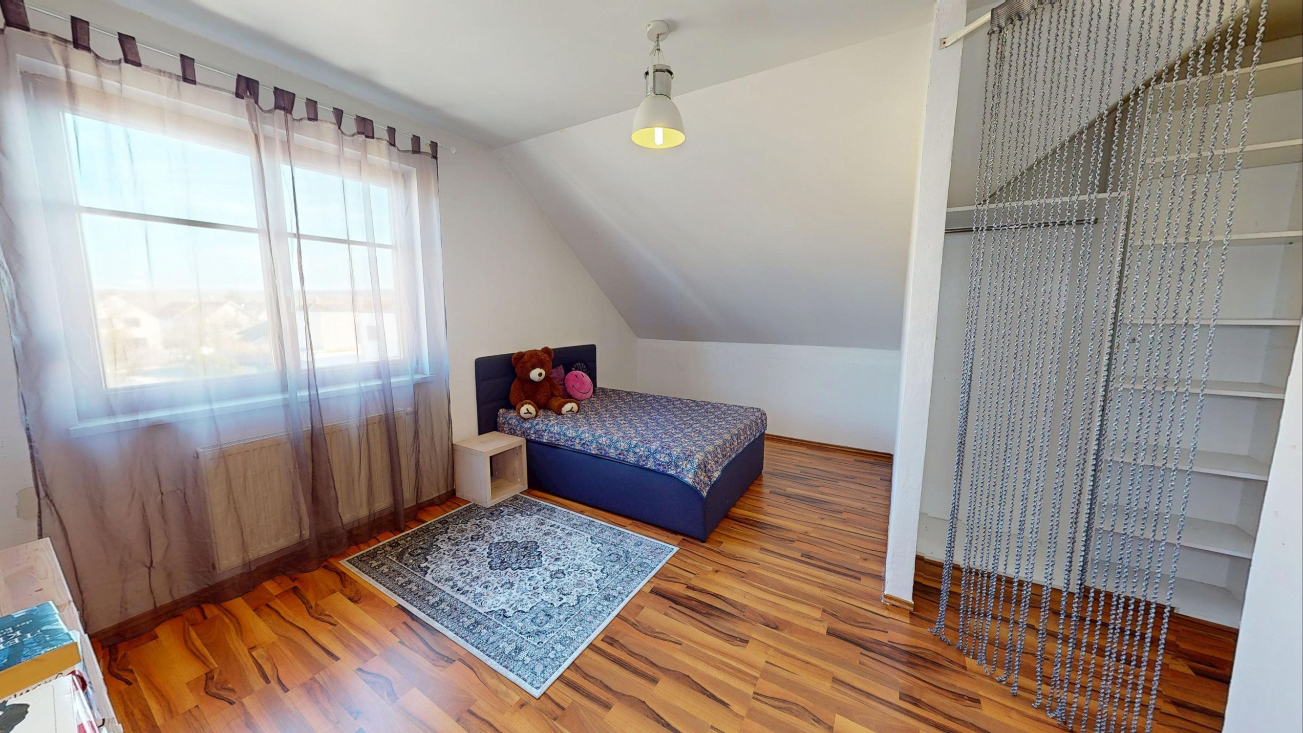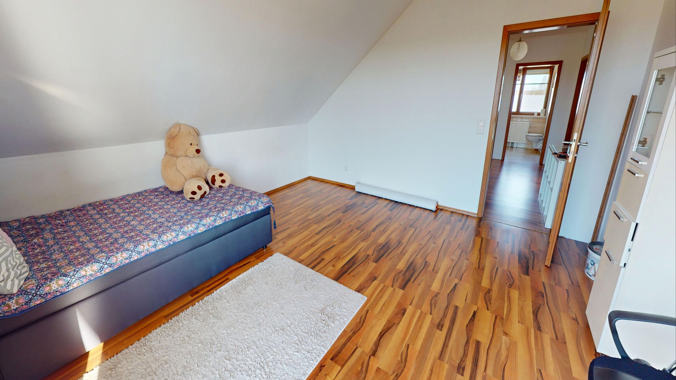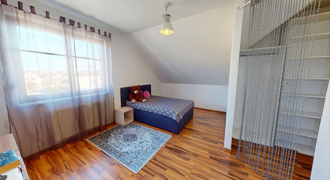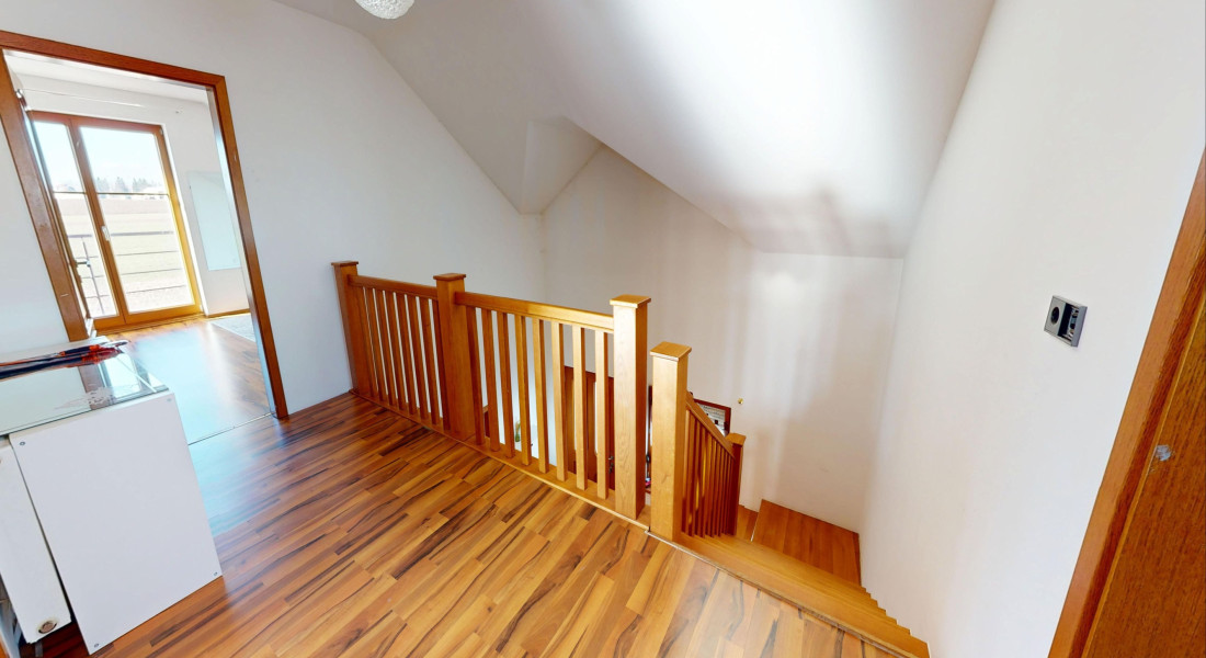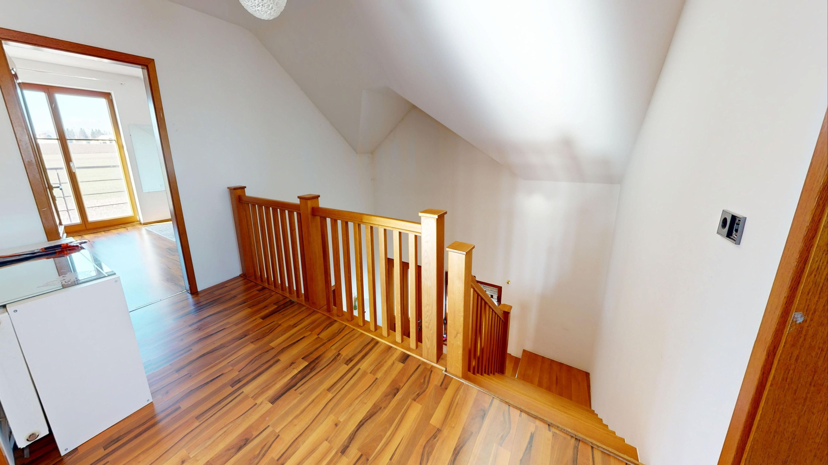 Horné podlažie ponúka viacero svetlých izieb a ideálne riešenie pre deti, hostí alebo samostatnú bytovú zónu.