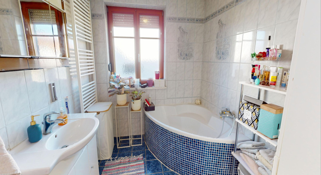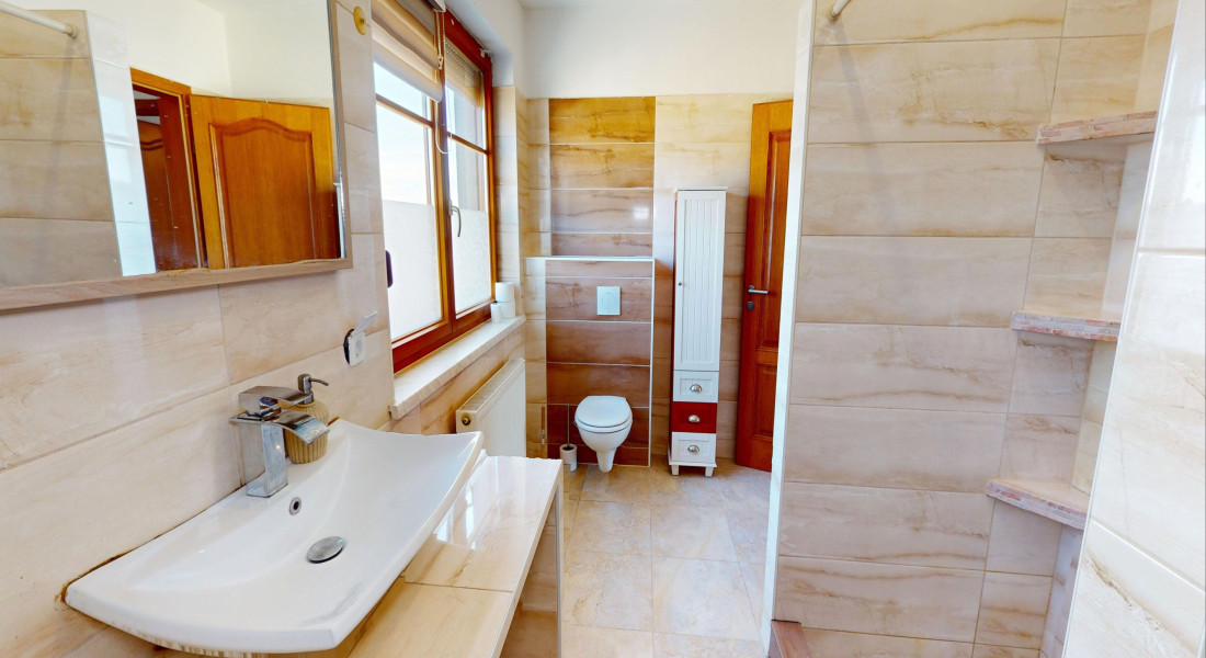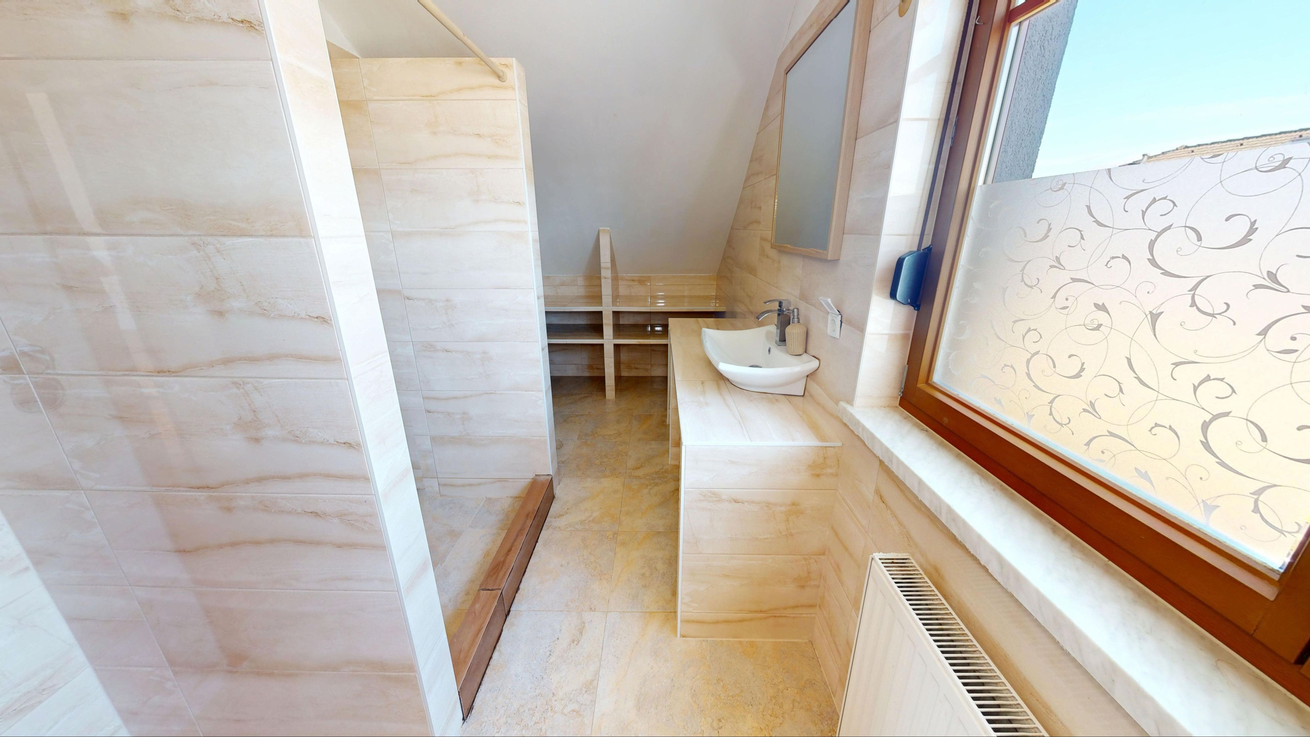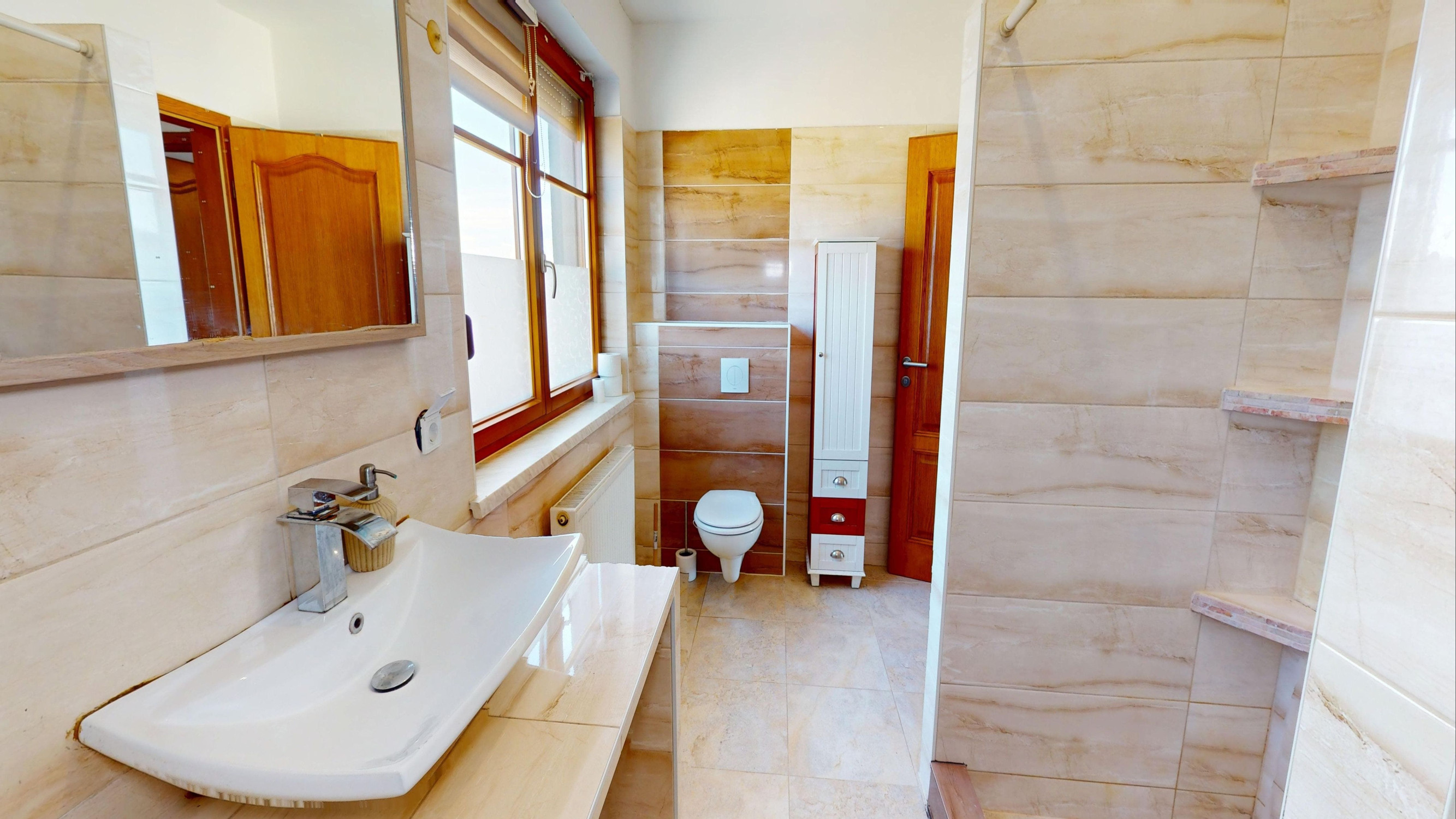 Na prízemí sa ďalej nachádza: veľká kúpeľňa s oknom, rohová vaňa aj sprchovací kút, hlavná spálňa a ďalšia izba vhodná ako hosťovská izba alebo pracovňa.