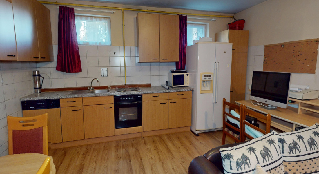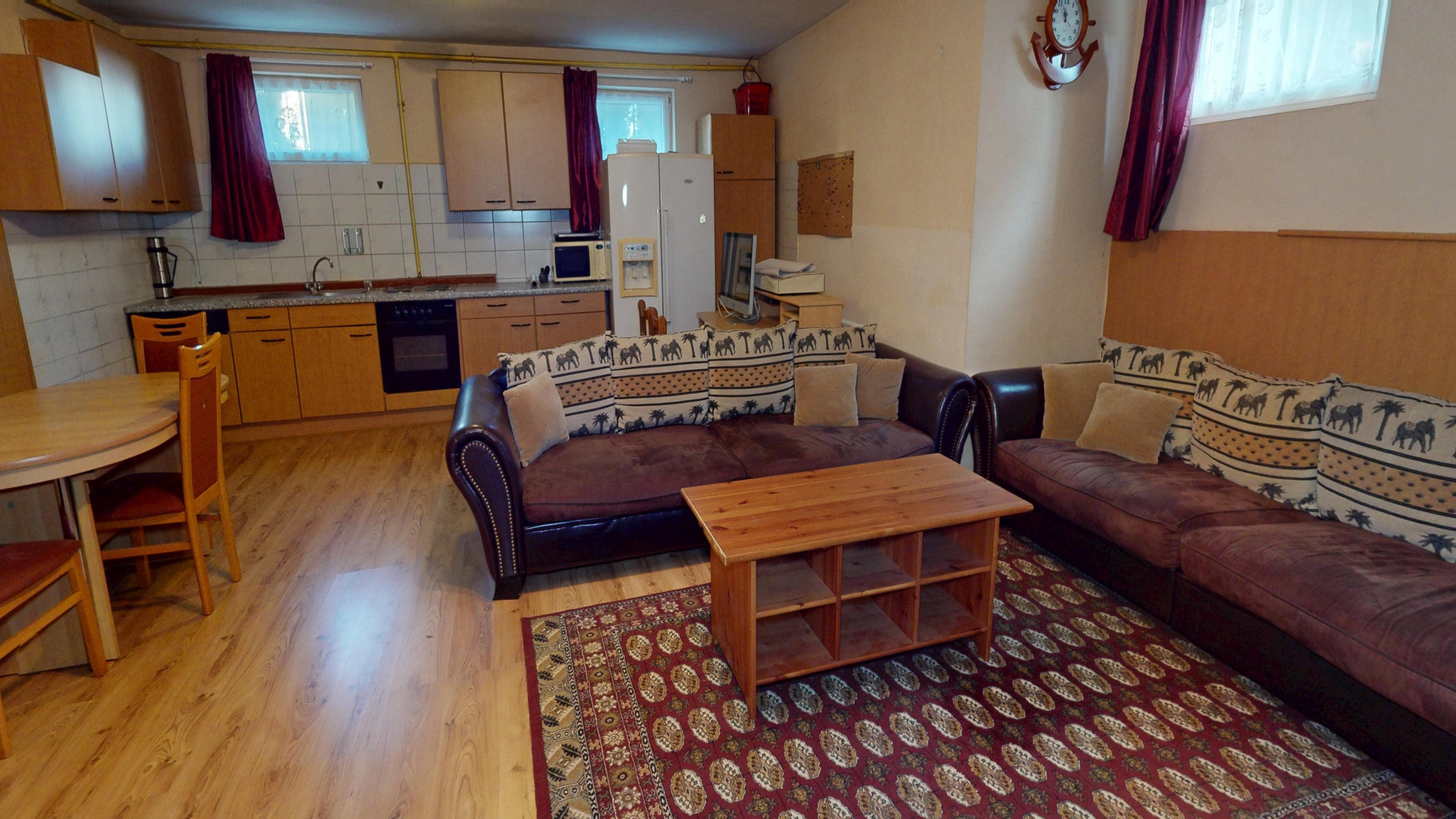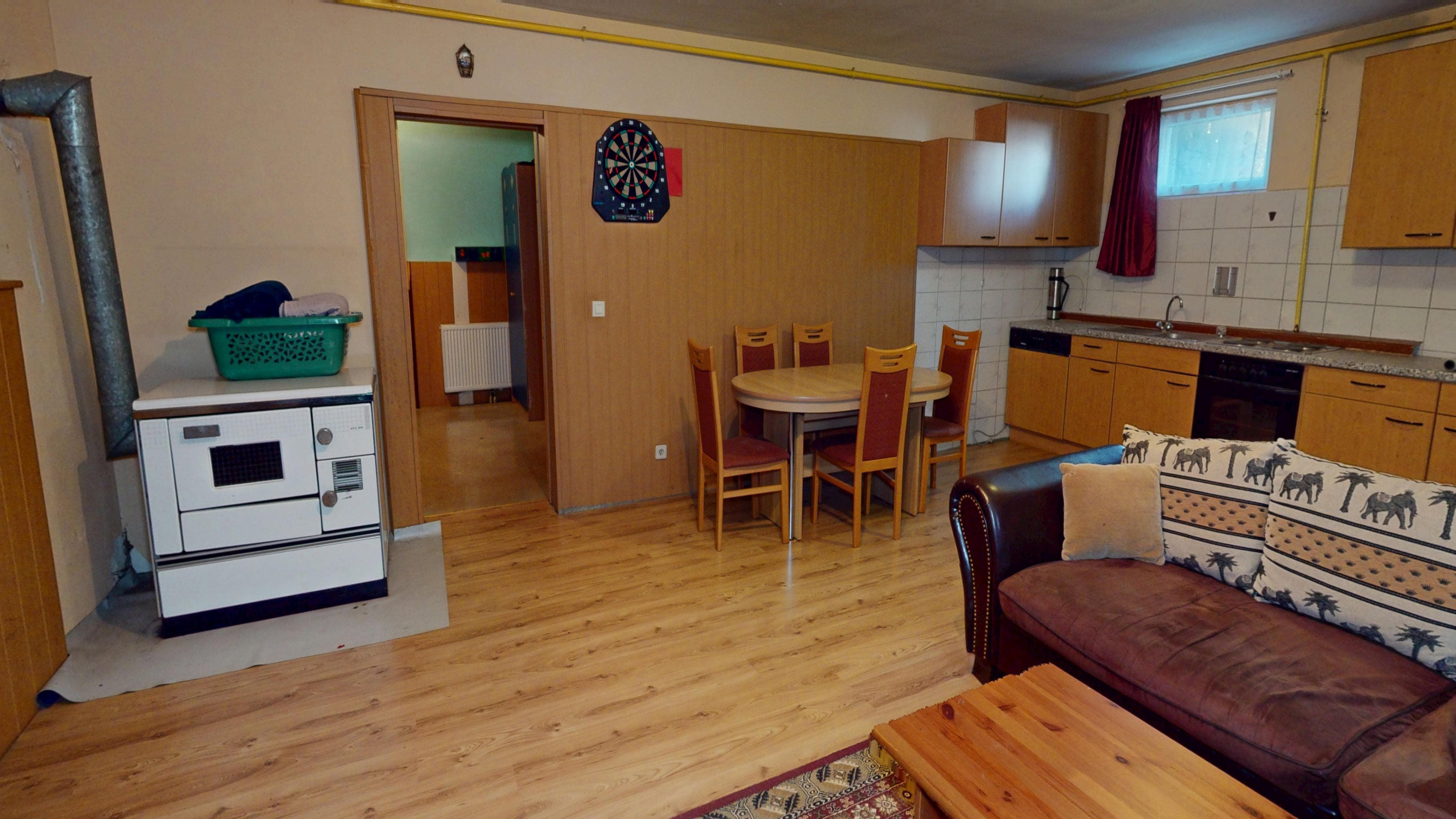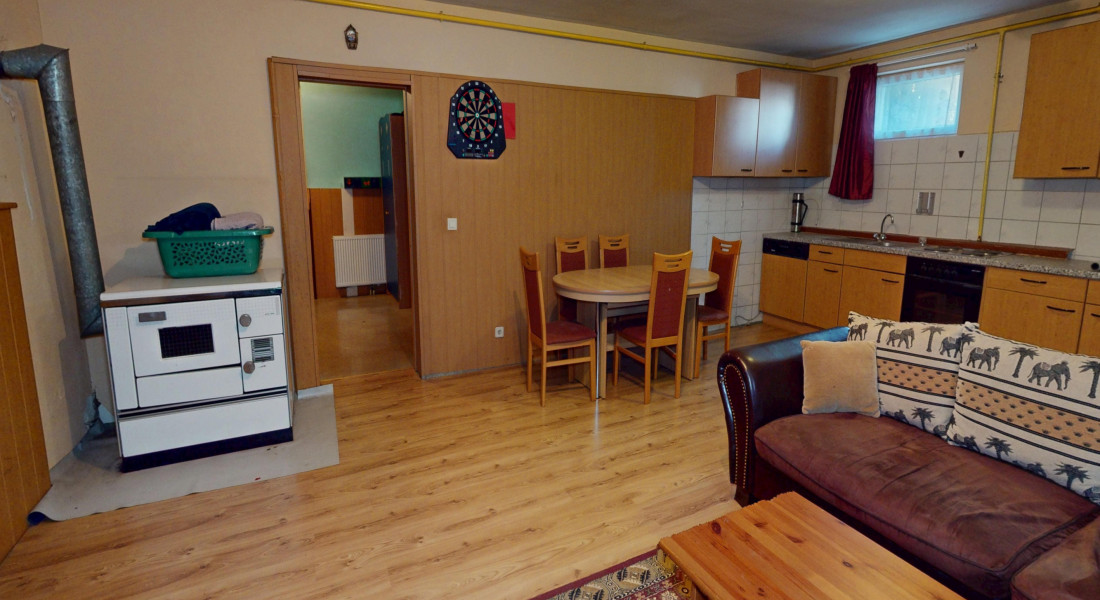 K dispozícii je veľká obývacia miestnosť s pieckou na drevo, plnohodnotná kuchyňa so sedením, technická miestnosť