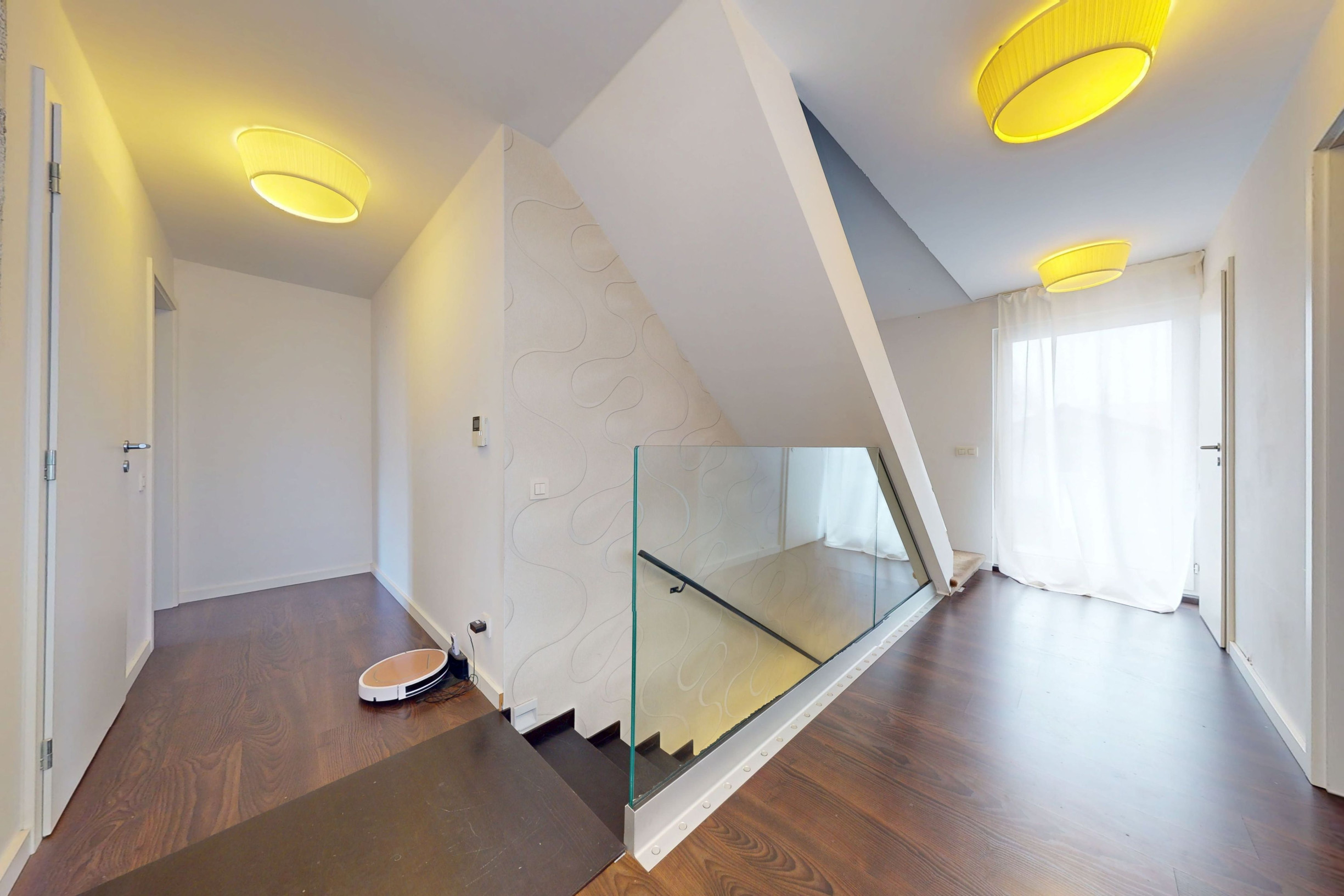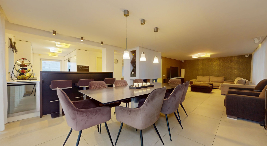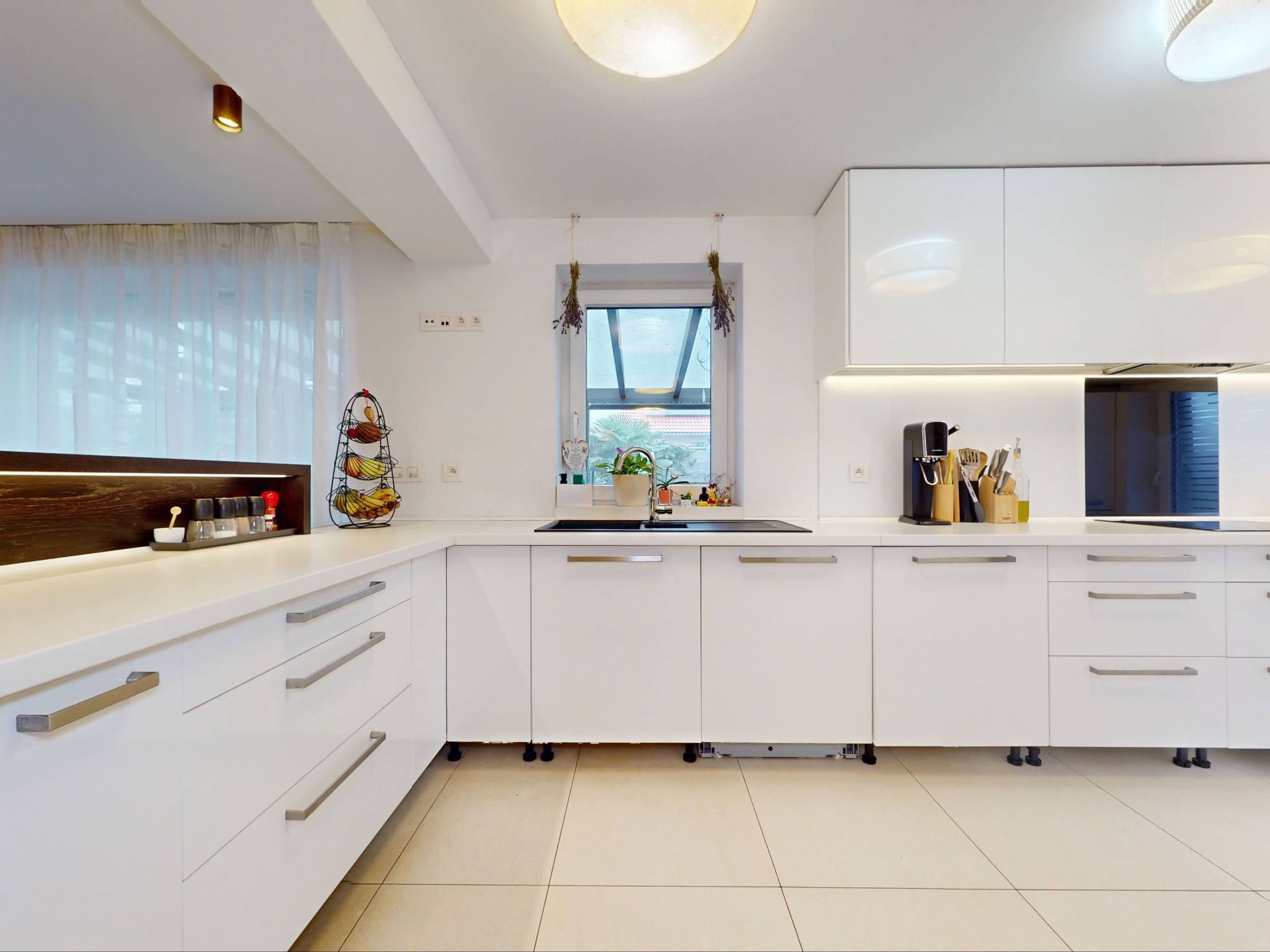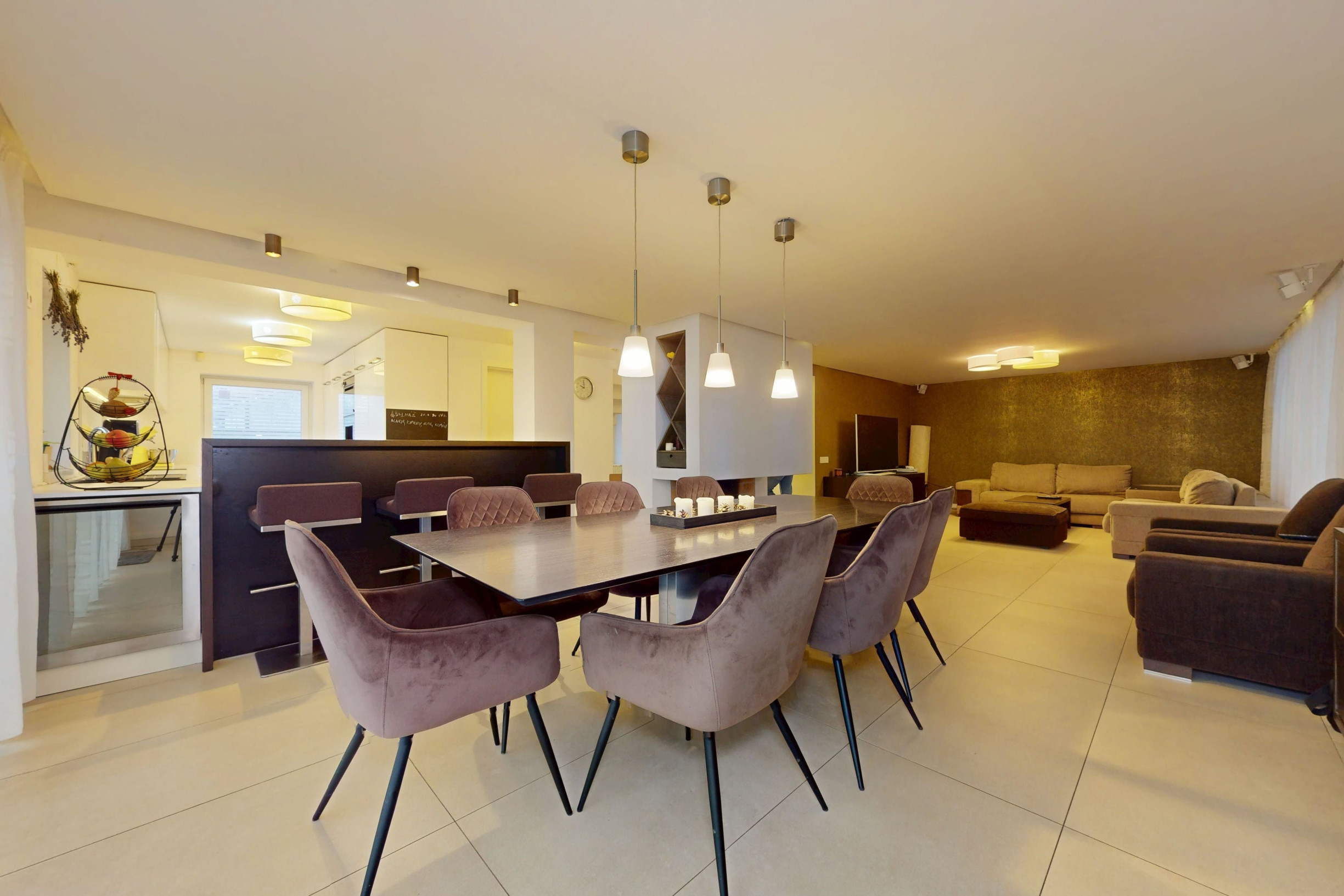 Dispozícia je logicky rozdelená na reprezentatívnu dennú časť a súkromnú nočnú zónu. Interiér pôsobí vzdušne, elegantne a nadčasovo, s dôrazom na komfort a funkčnosť. K dispozícii sú 3 kúpeľne, 4 toalety a dostatok úložného priestoru.