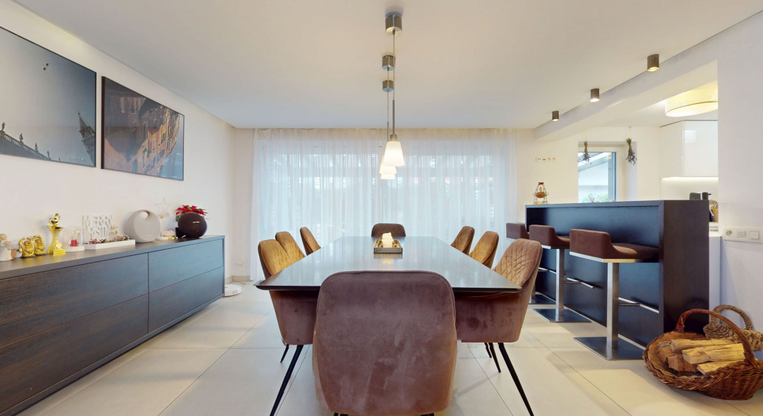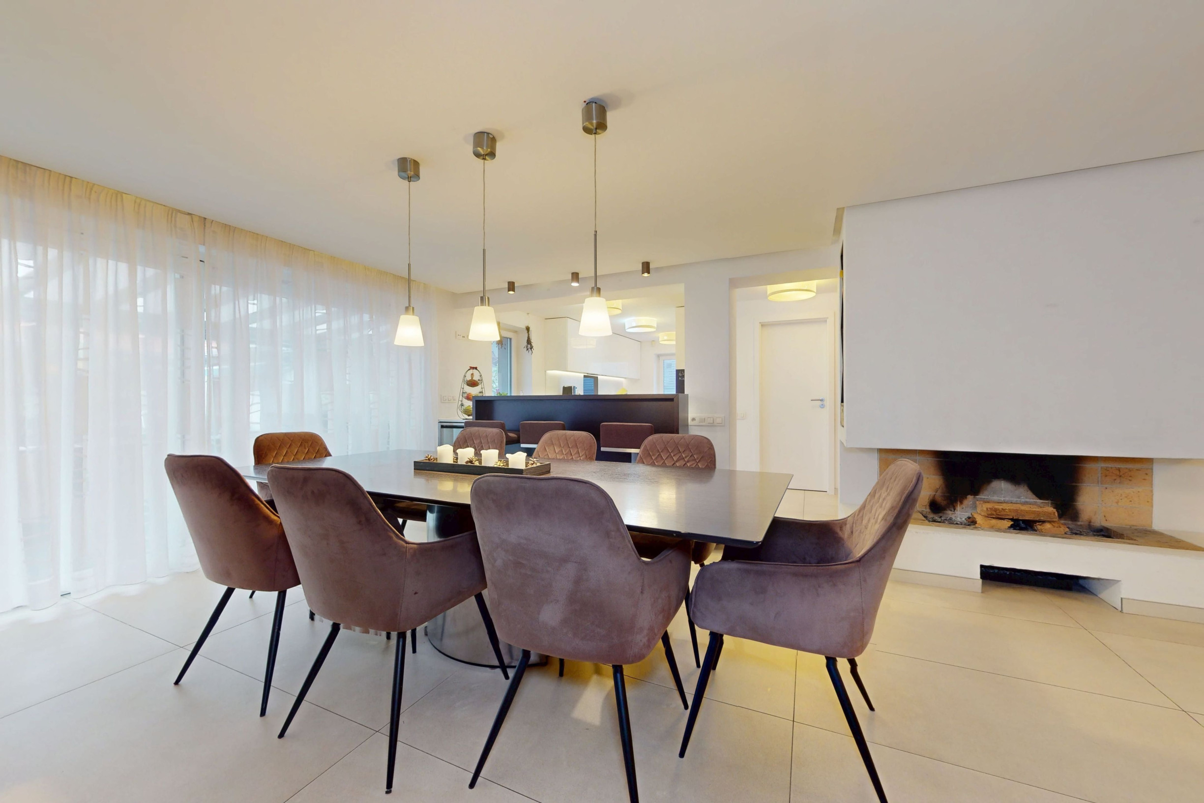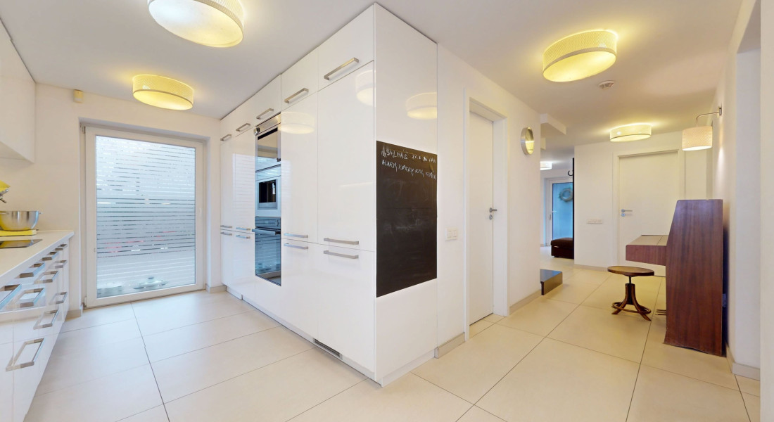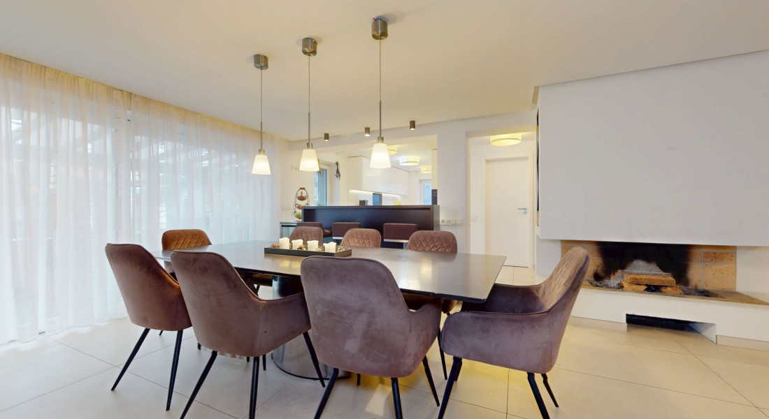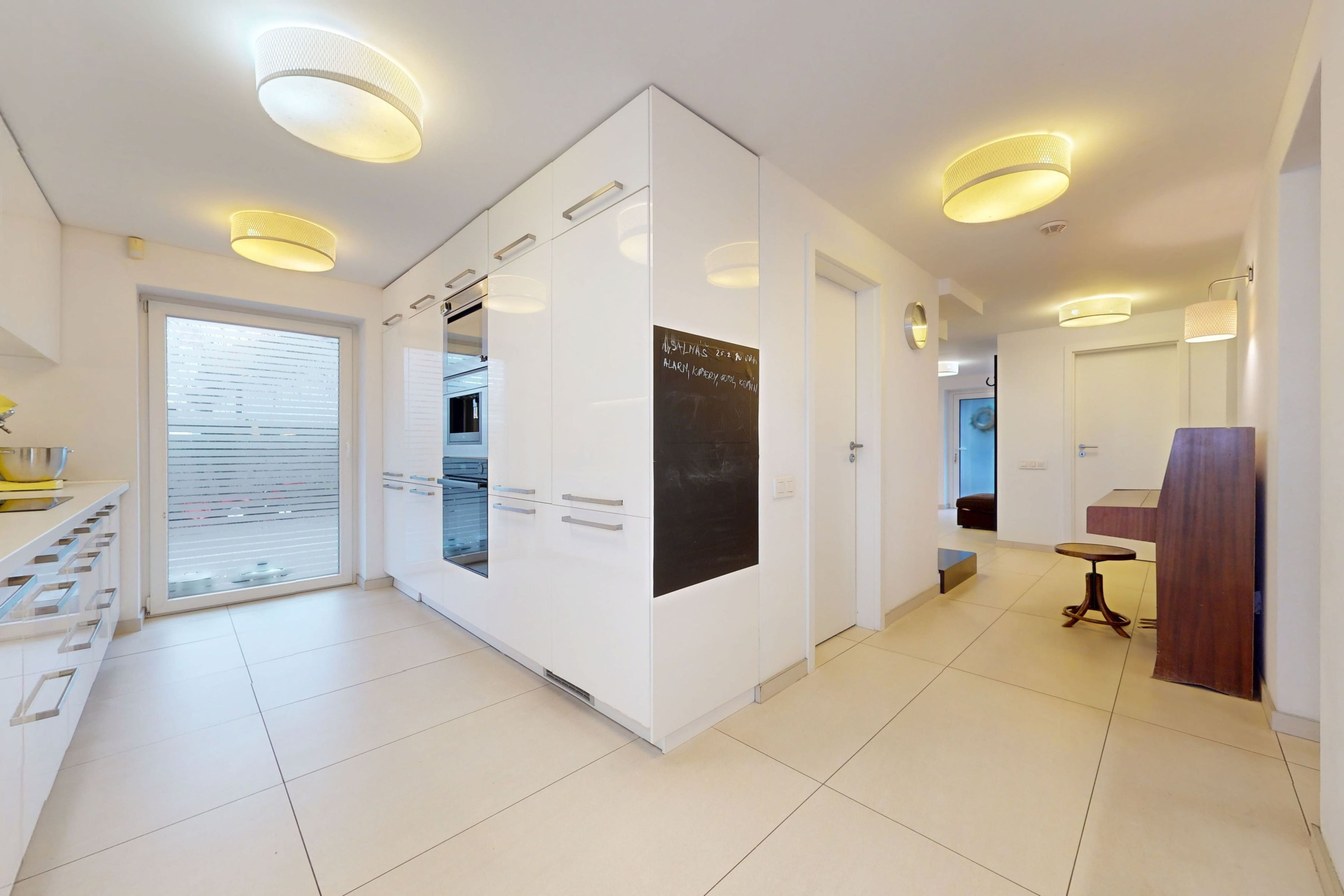 Dispozícia je logicky rozdelená na reprezentatívnu dennú časť a súkromnú nočnú zónu. Interiér pôsobí vzdušne, elegantne a nadčasovo, s dôrazom na komfort a funkčnosť. K dispozícii sú 3 kúpeľne, 4 toalety a dostatok úložného priestoru.