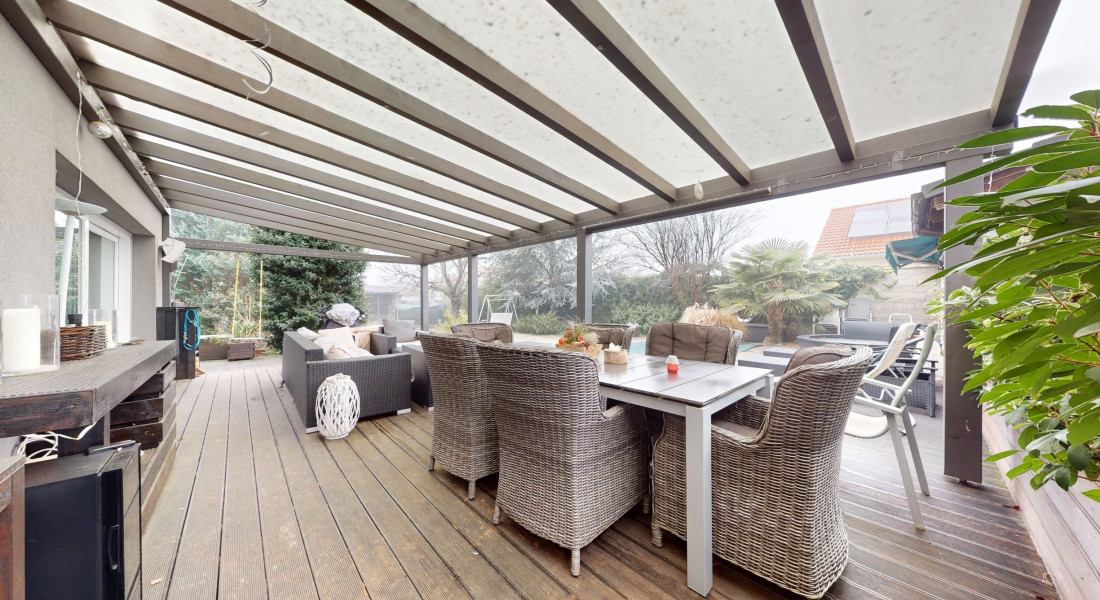 Úžitková plocha domu je cca 300m2, výmera pozemku 1000m2, výmera dvoj garáže 51m2 a výmera terasy 104m2.