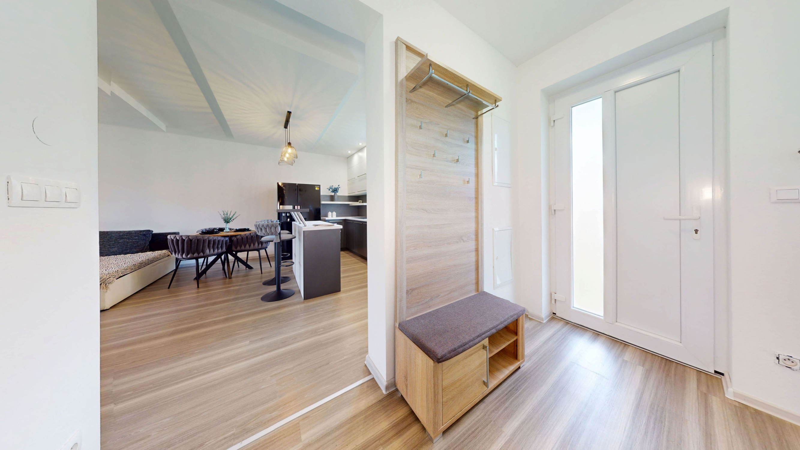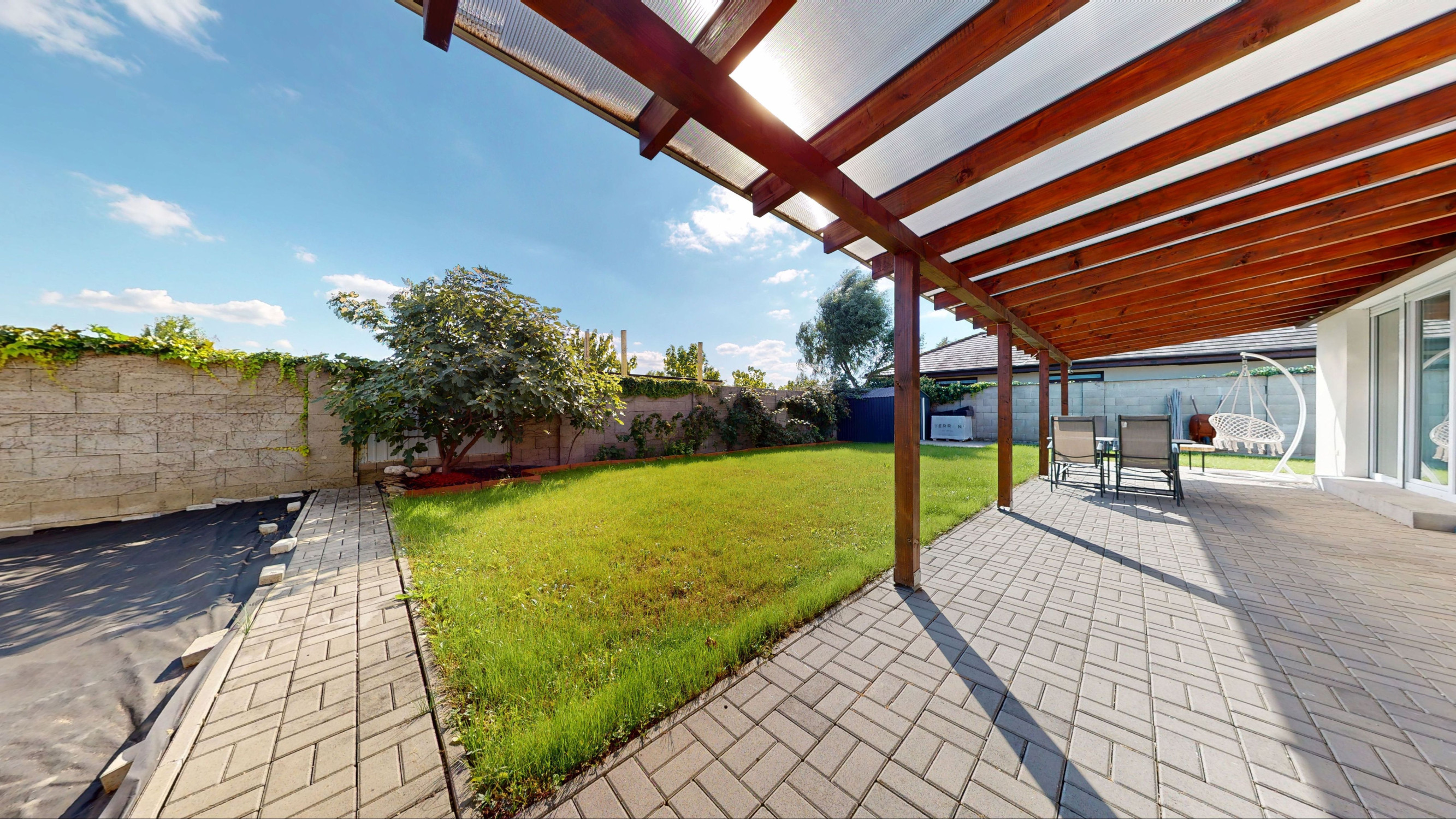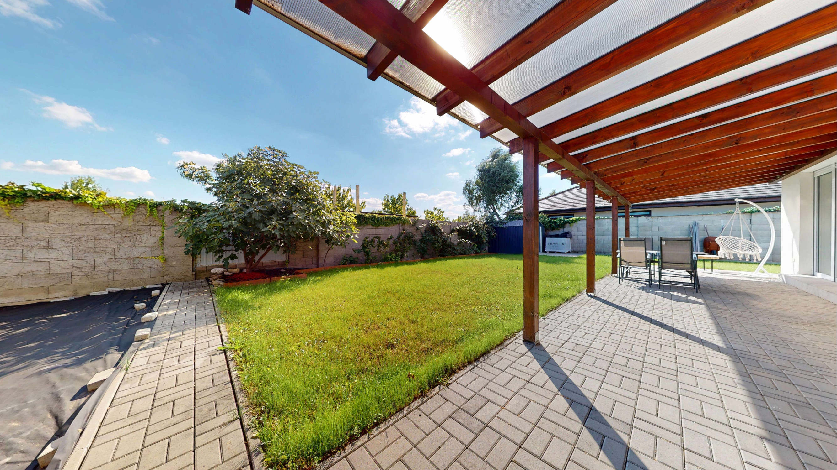 Z obývačky sa vychádza priamo na lexanom plne prestrešenú terasu s výhľadom na zrevitalizovanú záhradu, ktorá disponuje automatickou závlahou čerpajúcou vodu z vlastnej studne.