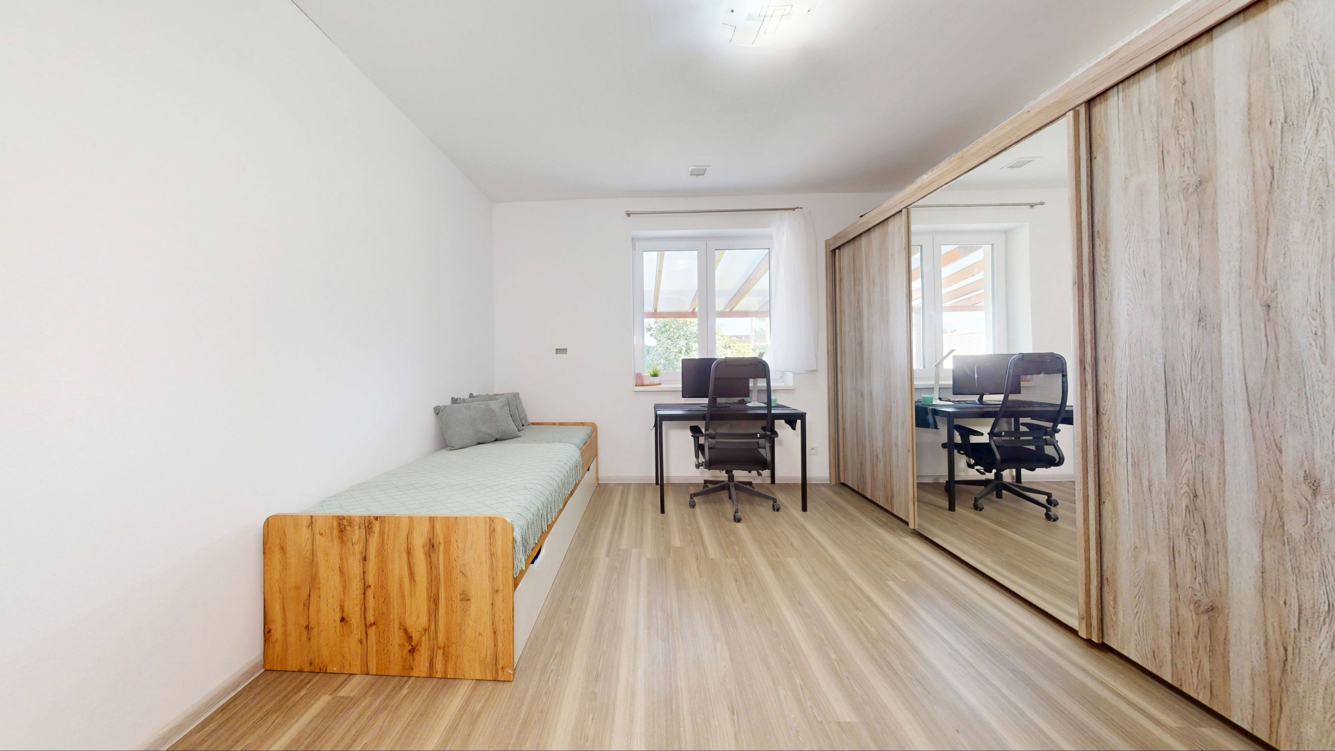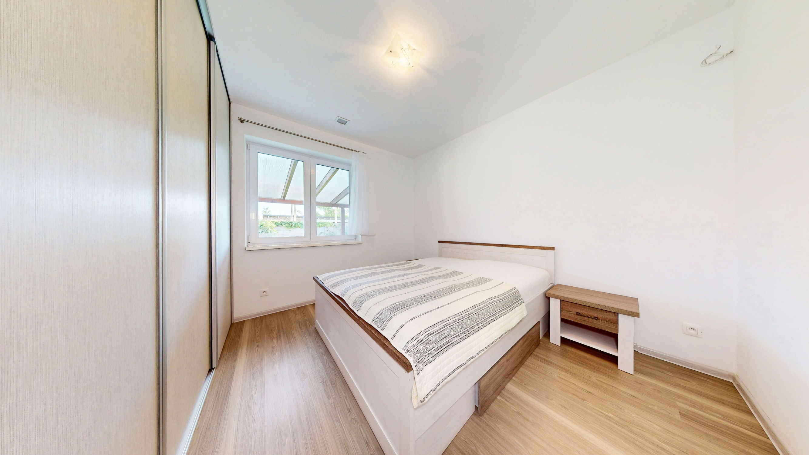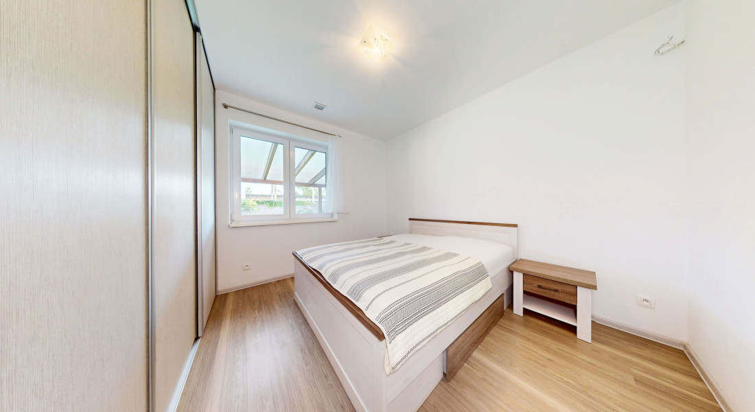 Z obývačky sa vychádza priamo na lexanom plne prestrešenú terasu s výhľadom na zrevitalizovanú záhradu, ktorá disponuje automatickou závlahou čerpajúcou vodu z vlastnej studne.