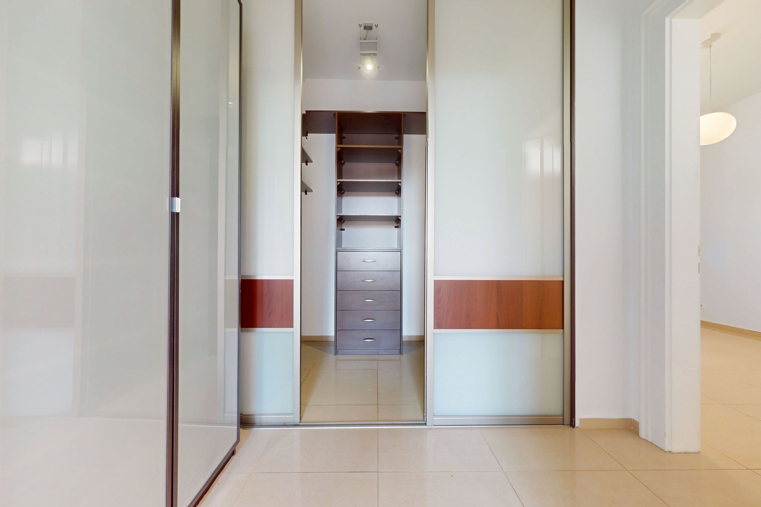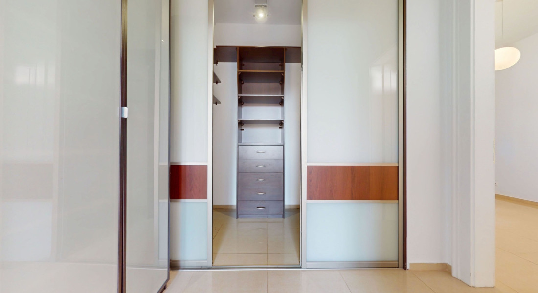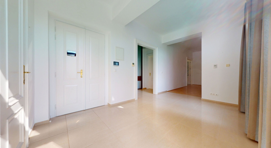 Dispozícia pozostáva zo vstupnej haly, kuchyne s jedálňou (36 m²), priestrannej obývačky (42 m²), 5 samostatných izieb, šatníka, dvoch kúpeľní, troch WC a balkóna o výmere 3,9 m². Byt je orientovaný na všetky štyri svetové strany a je jediným bytom na poschodí.