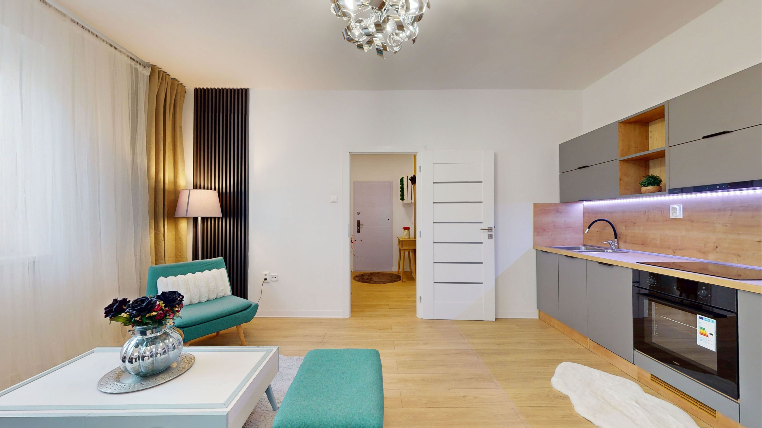 Dispozícia bytu: vstupná chodba, obývacia izba s kuchynským kútom, spálňa s východom na terasu, kúpeľňa so sprchovým kútom s WC.