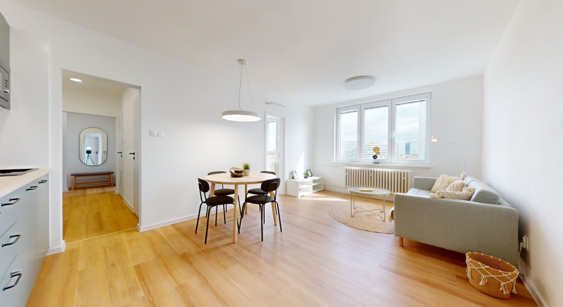 Je výborne dispozične riešený: vstupná chodba s bezpečnostnými dverami, kúpeľňa so sprchovacím kútom, samostatné WC, kuchyňa s jedálenským kútom a otvorenou dispozíciou do obývačky s výstupom na loggiu, spálňa, dve nepriechodné izby, balkón.