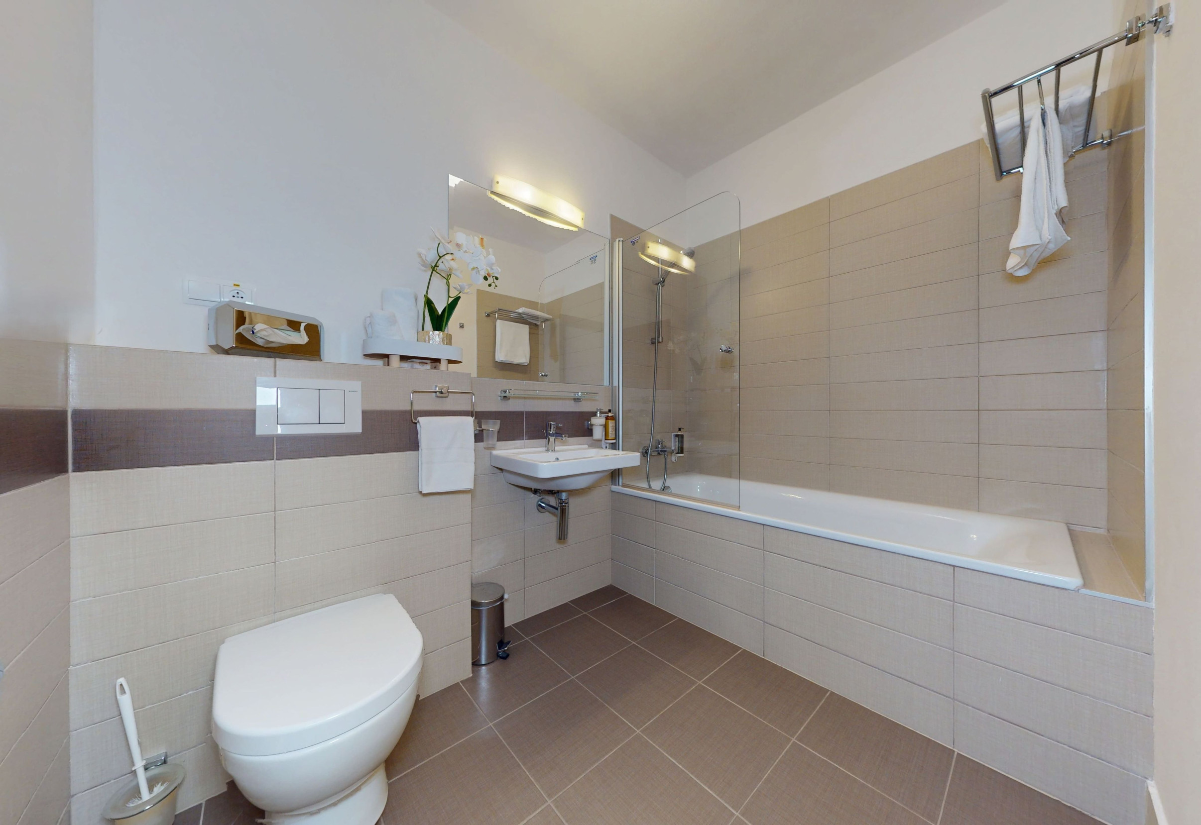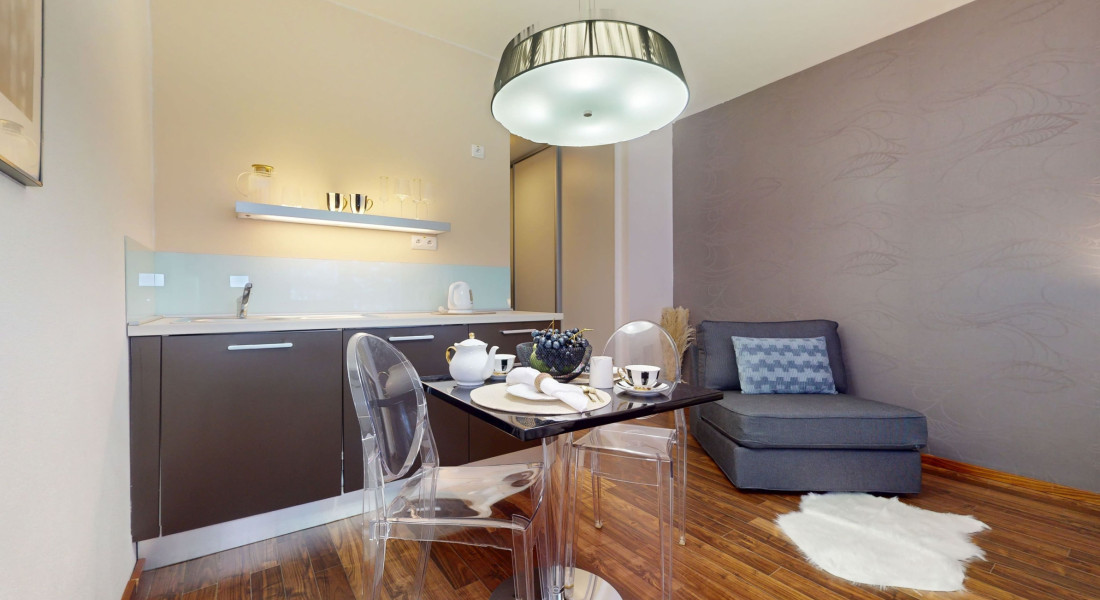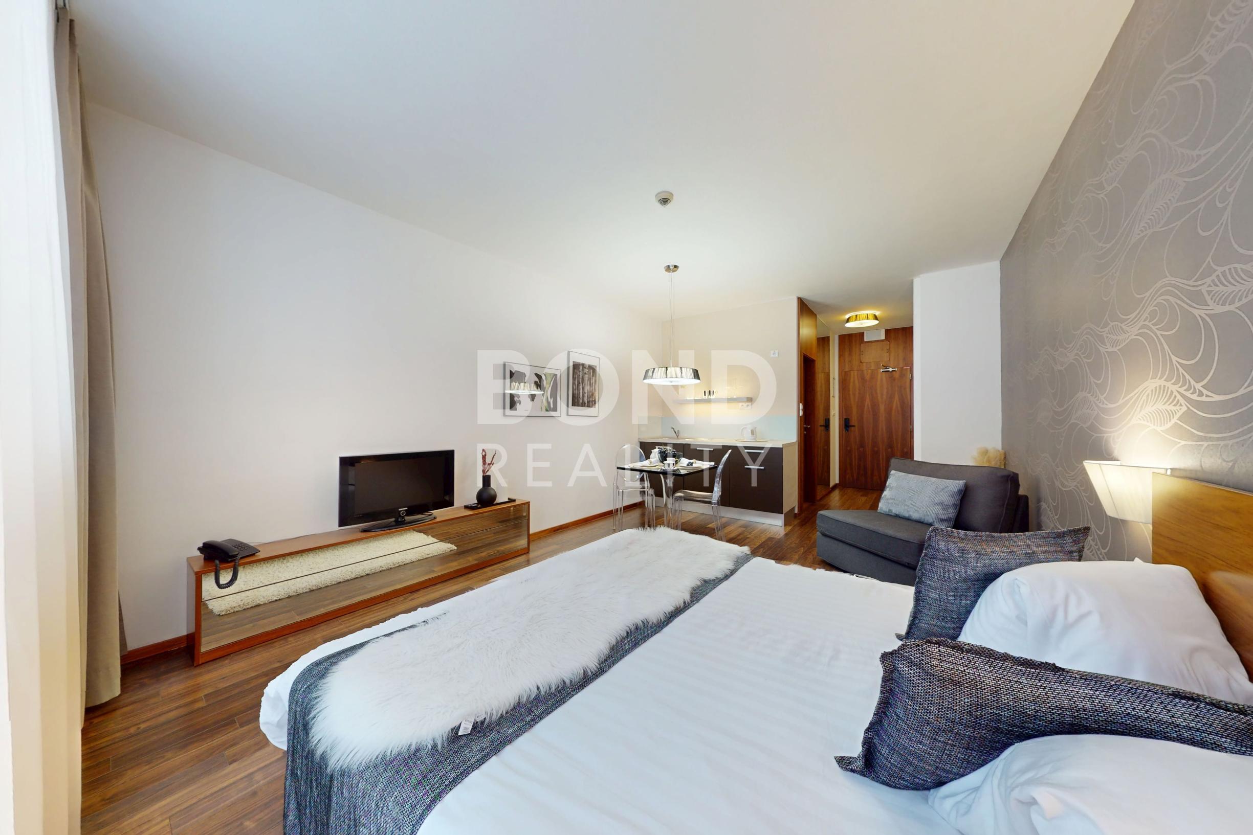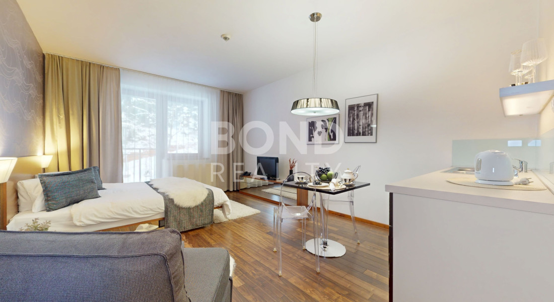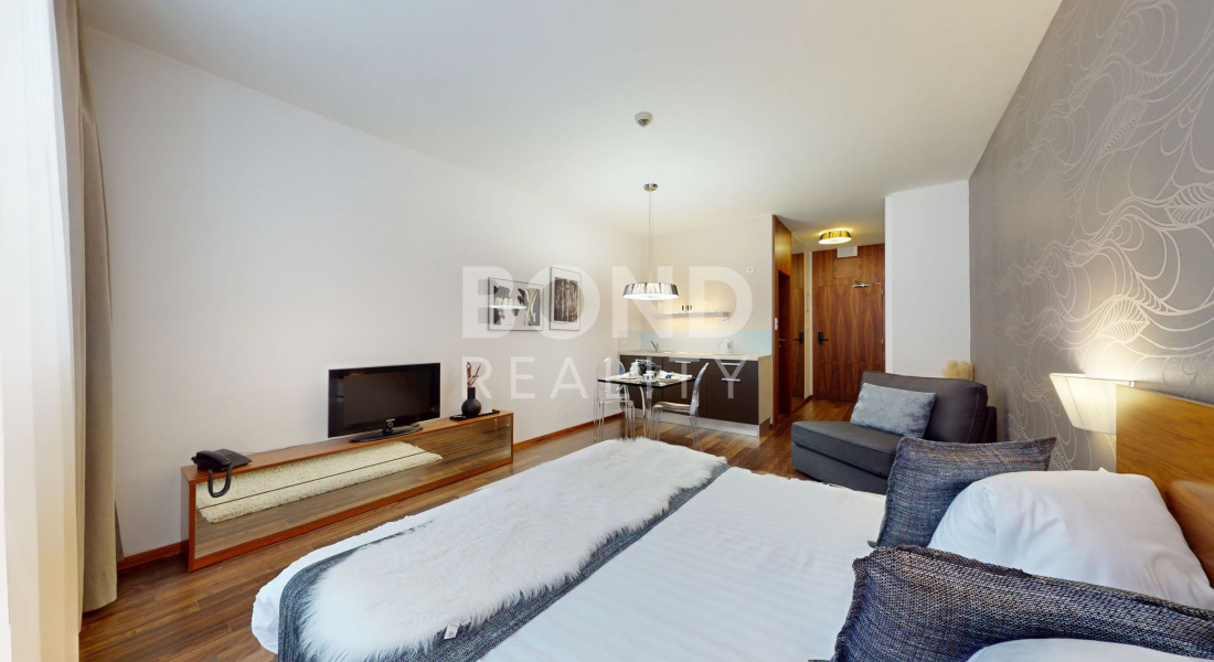 Celková výmera apartmánu je 31,74 m² (z toho 2,61 m² balkón) a je situované na 2. poschodí hotela, ktorý je vybavený výťahom. Apartmán ponúka praktickú dispozíciu pozostávajúcu zo vstupnej chodby, otvoreného obytného priestoru s posteľou a oddychovou časťou, kuchynského kúta a kúpeľne s vaňou a toaletou a balkónu. Apartmán sa predáva plne zariadený, možnosť ihneď využívať / prenajímať.
