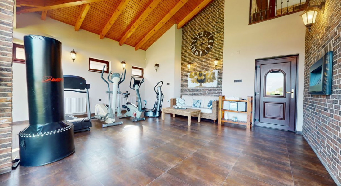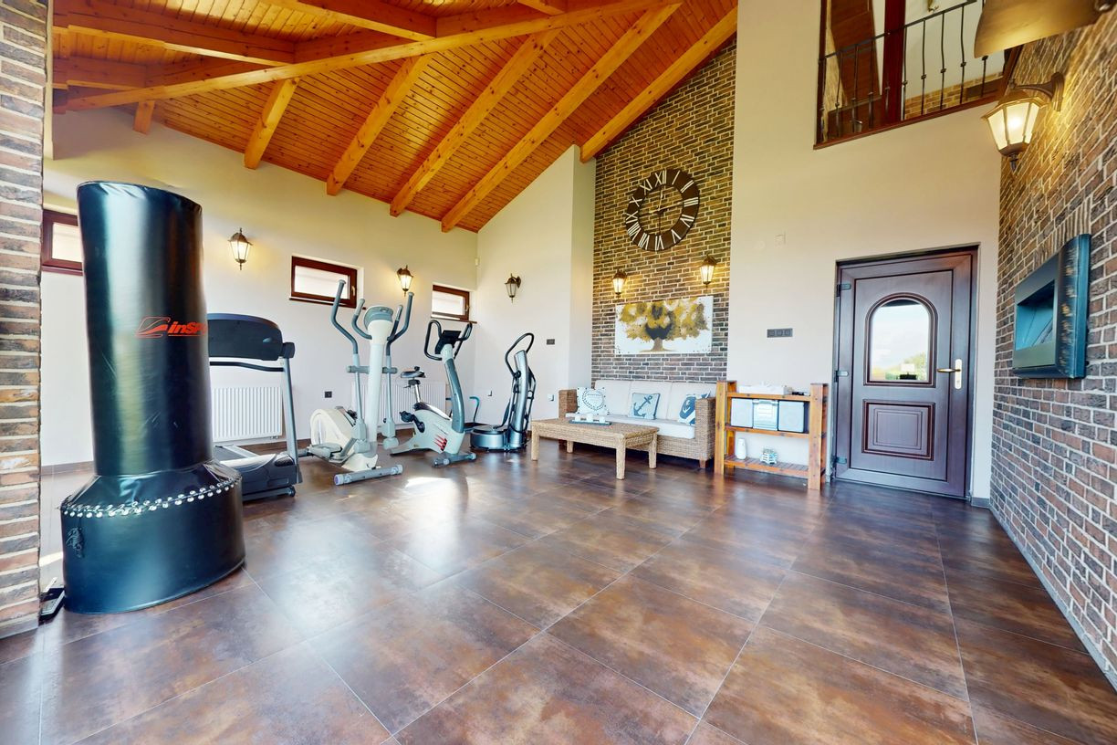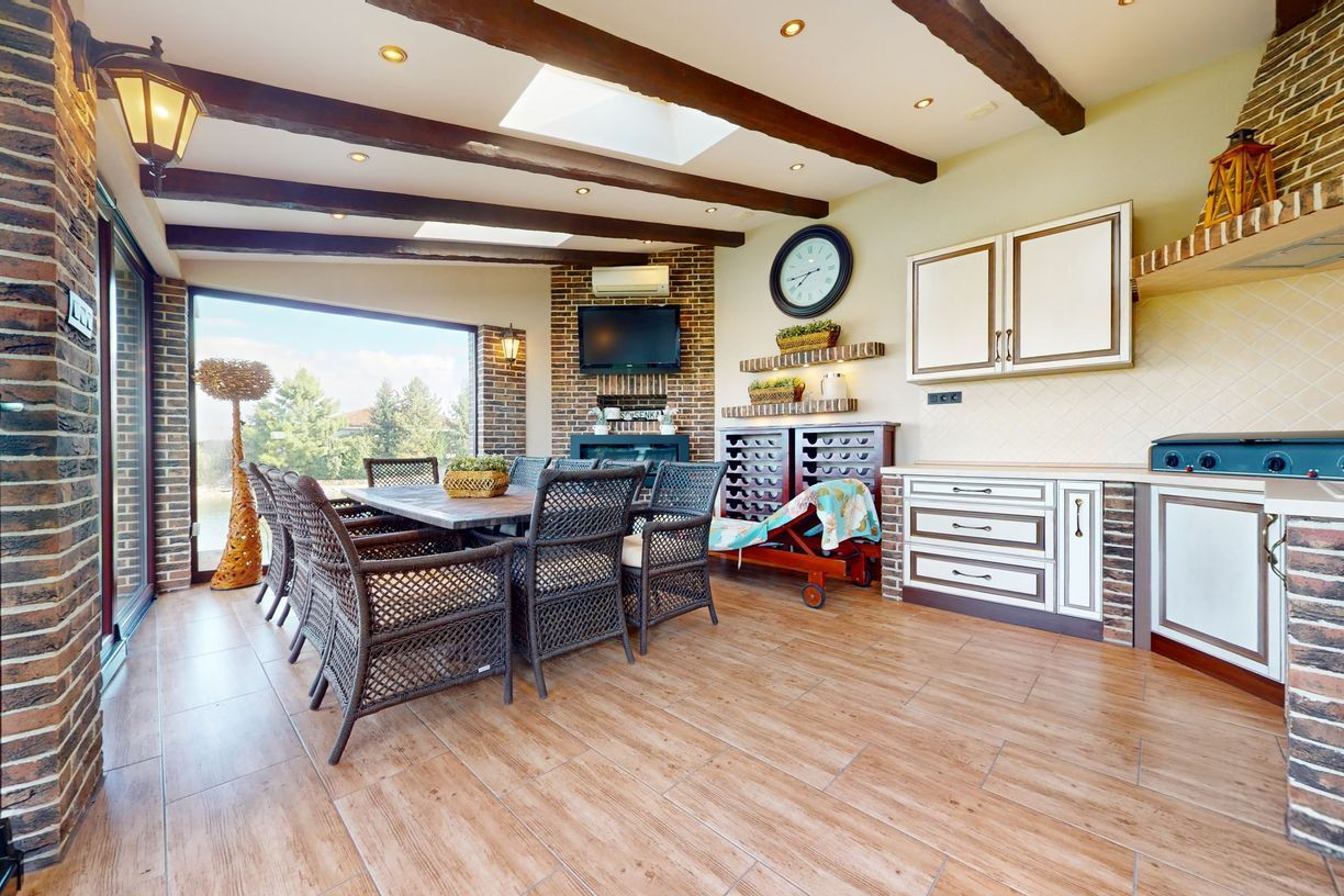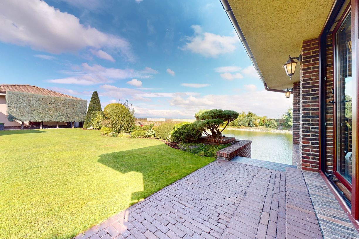 Za domom je záhradný domček s krásnou plne vybavenou zimnou záhradou, kuchyňou a krbom a taktiež je v zadnej časti domu vonkajší sklad, v ktorom je možné umiestniť náradie a záhradný nábytok. Celý exteriér je zabezpečený zavlažovacím systémom, Nachádza sa tu veľkorysé fitness. Za domom sa výstupom zo záhrady dostanete priamo na súkromnú pláž so vstupom do súkromného jazera, ktorého časť je súčasťou predaja domu. Konkrétne ¼ podielu.