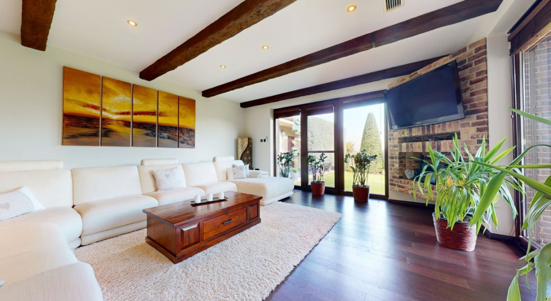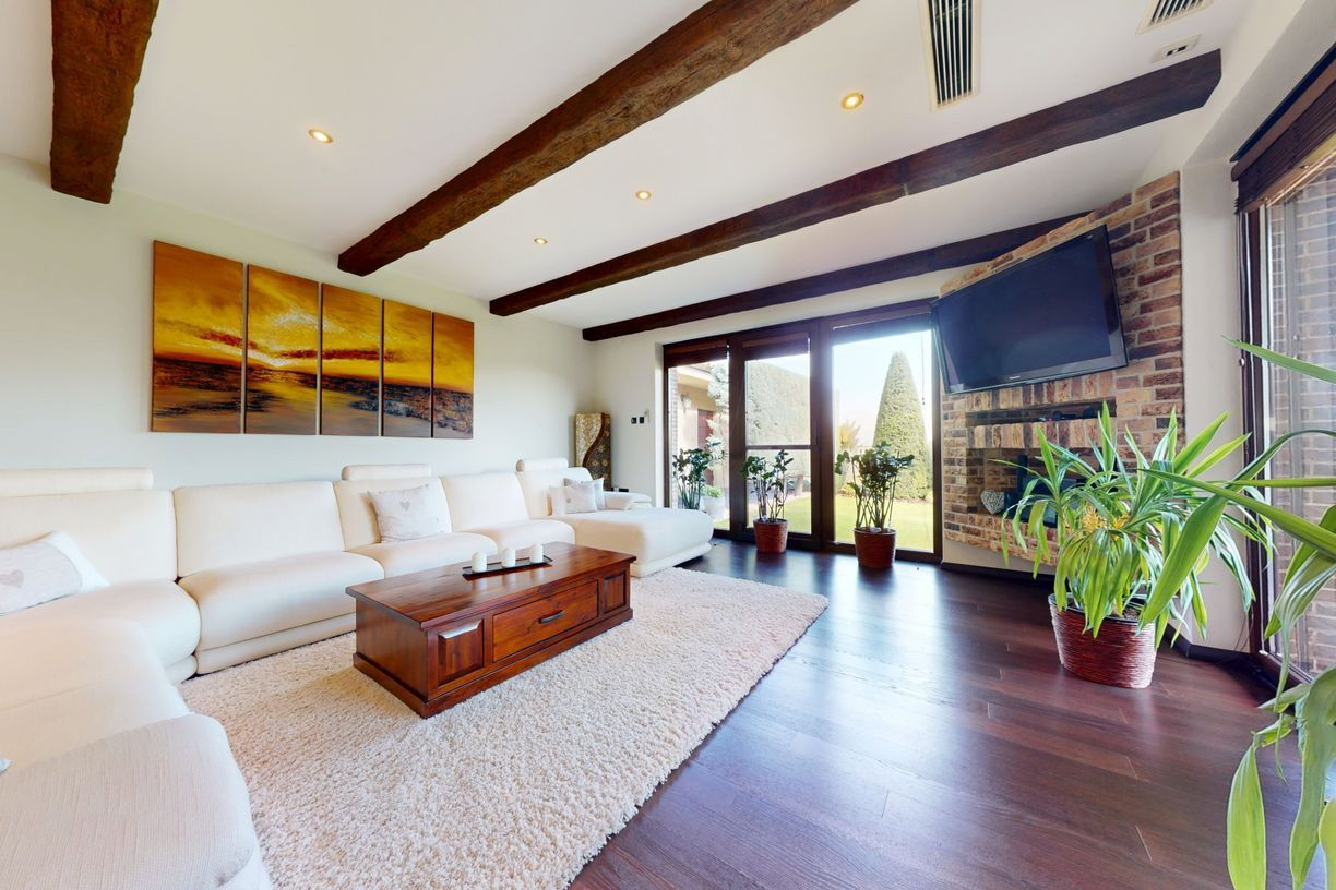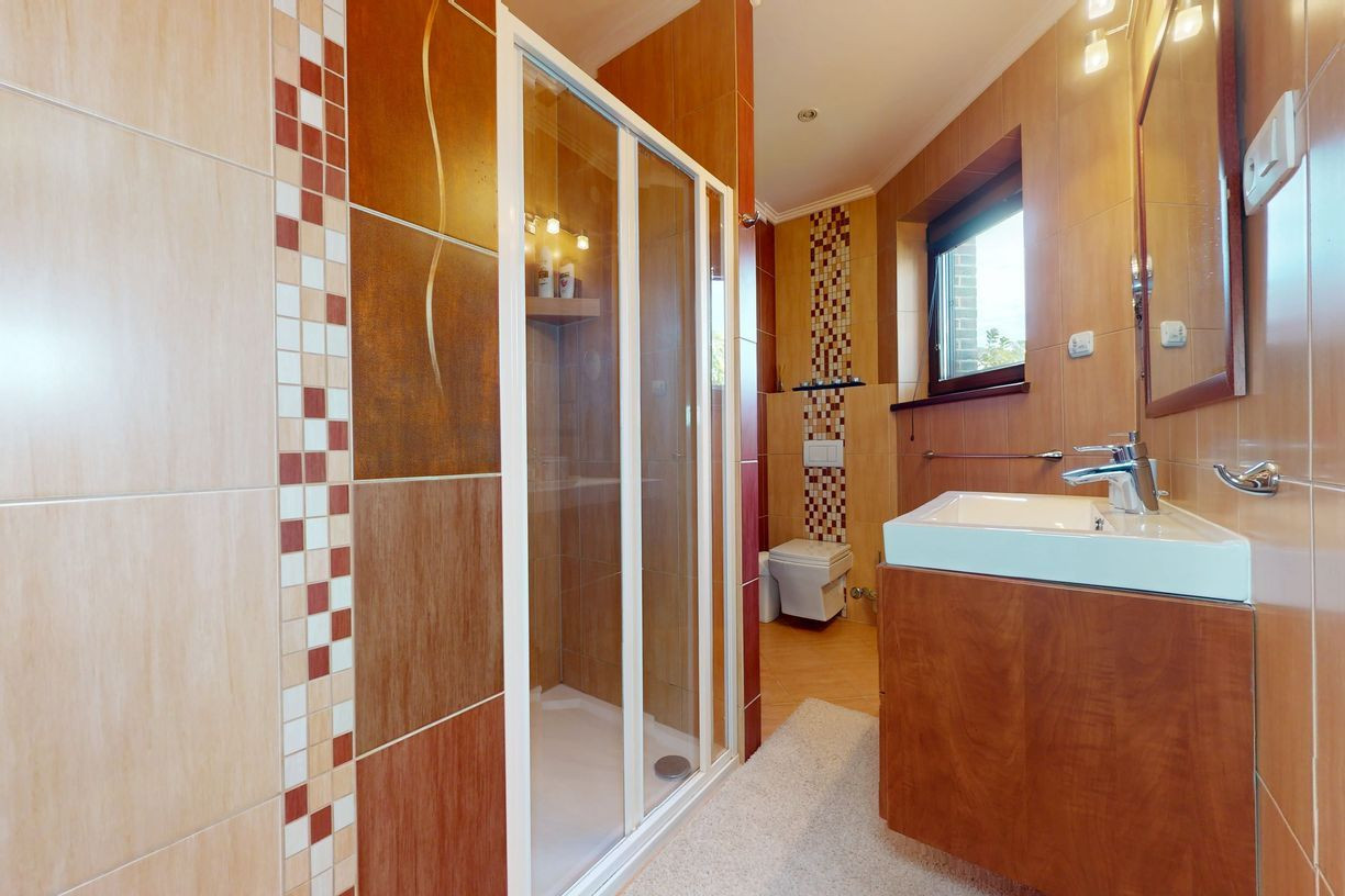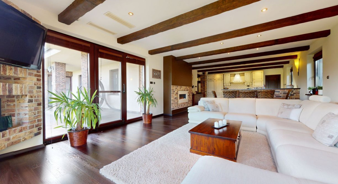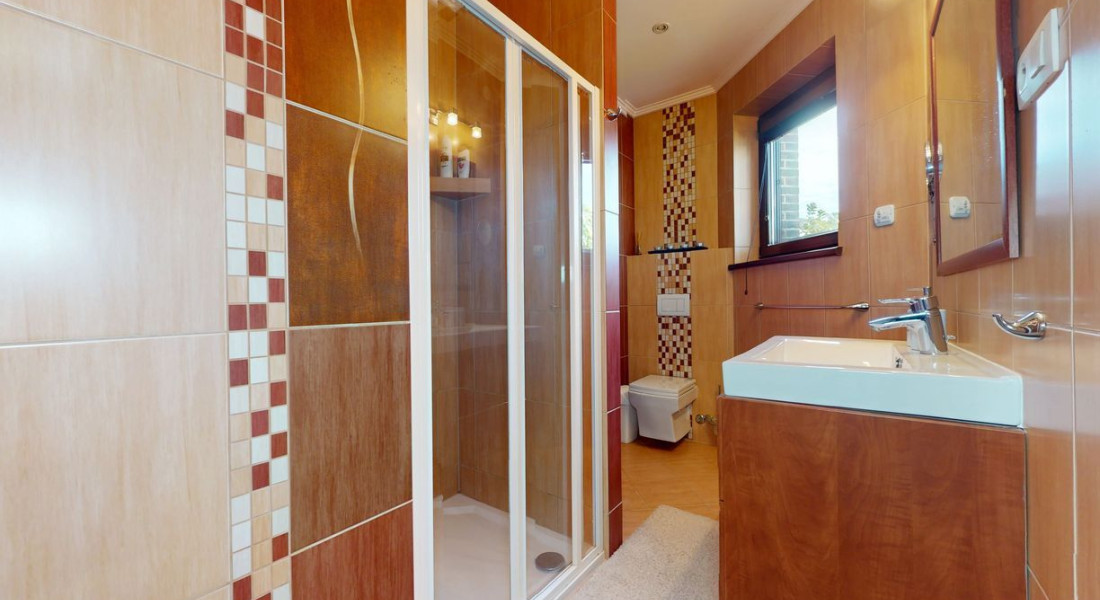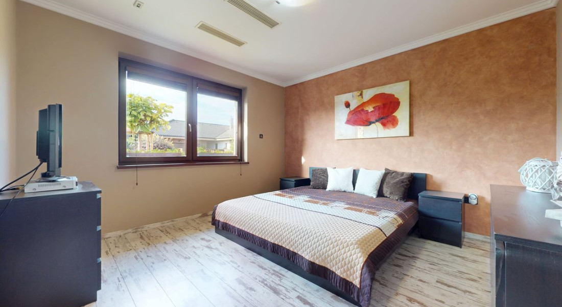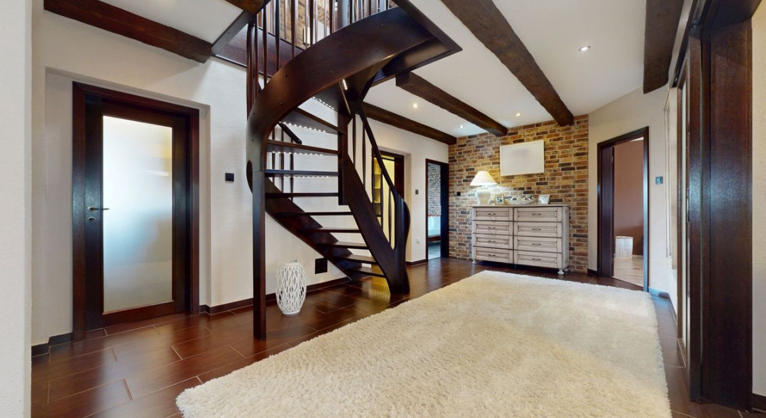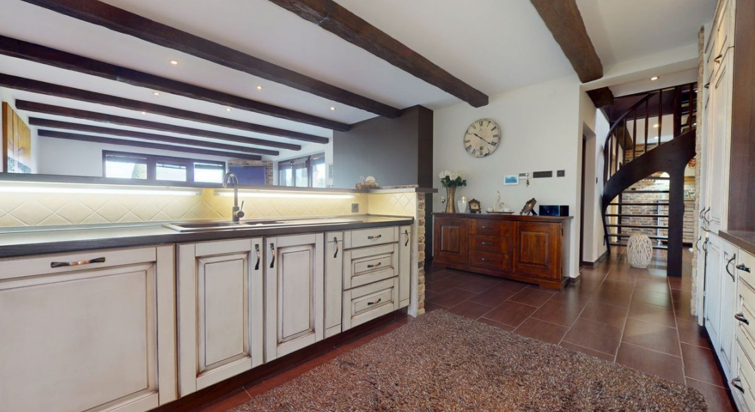 Tvorí ho prízemie, kde sa nachádza zázemie ako kuchyňa, jedáleň, priestranná obývacia miestnosť s krbom, tri samostatné spálňe s vlastnými kupeľňami a šatníkmi, práčovňa, hosťovská toaleta. Všetky tieto izby sa stretávajú na priestrannej chodbe, z ktorej sa krásnym schodiskom dostaneme na poschodie, ktoré je otvoreným priestorom. Slúži ako samostatný byt s kúpeľnou, saunou a šatníkom.