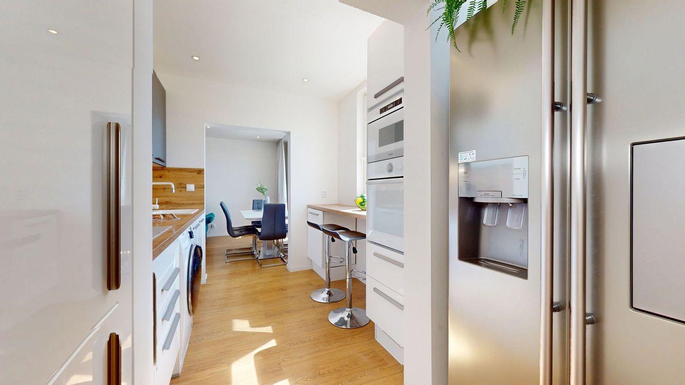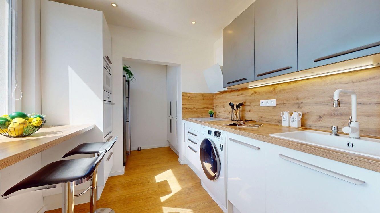 V rámci rekonštrukcie nové elektroinštalácie, sadrokartónové podhľady a steny, interiérové dvere a zárubne, obklady, laminátové podlahy, dlažby, kuchynská linka na mieru Dekodom vrátane spotrebičov (umývačka riadu, elektrická rúra na pečenie, sklokeramická indukčná varná doska, mikrovlnná rúra, odsávač pár, práčka, chladnička s mrazničkou) a nábytkové skrine na mieru od Komandor, žalúzie a sieťky proti hmyzu.