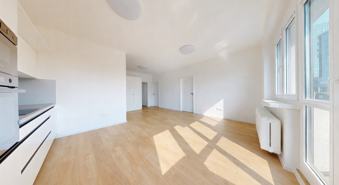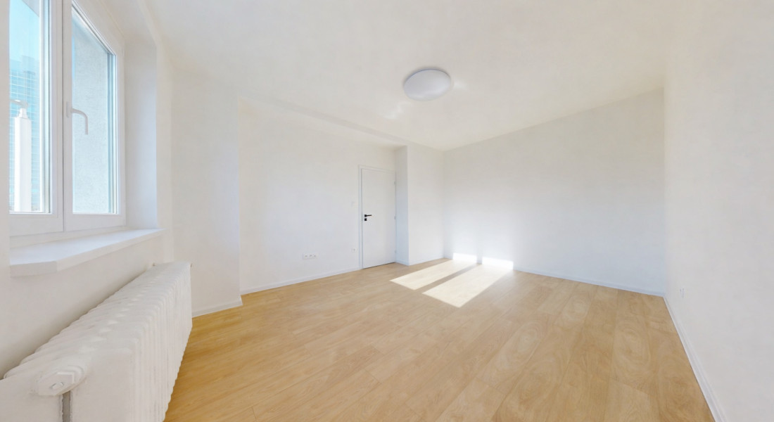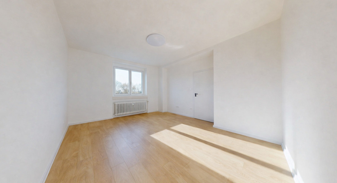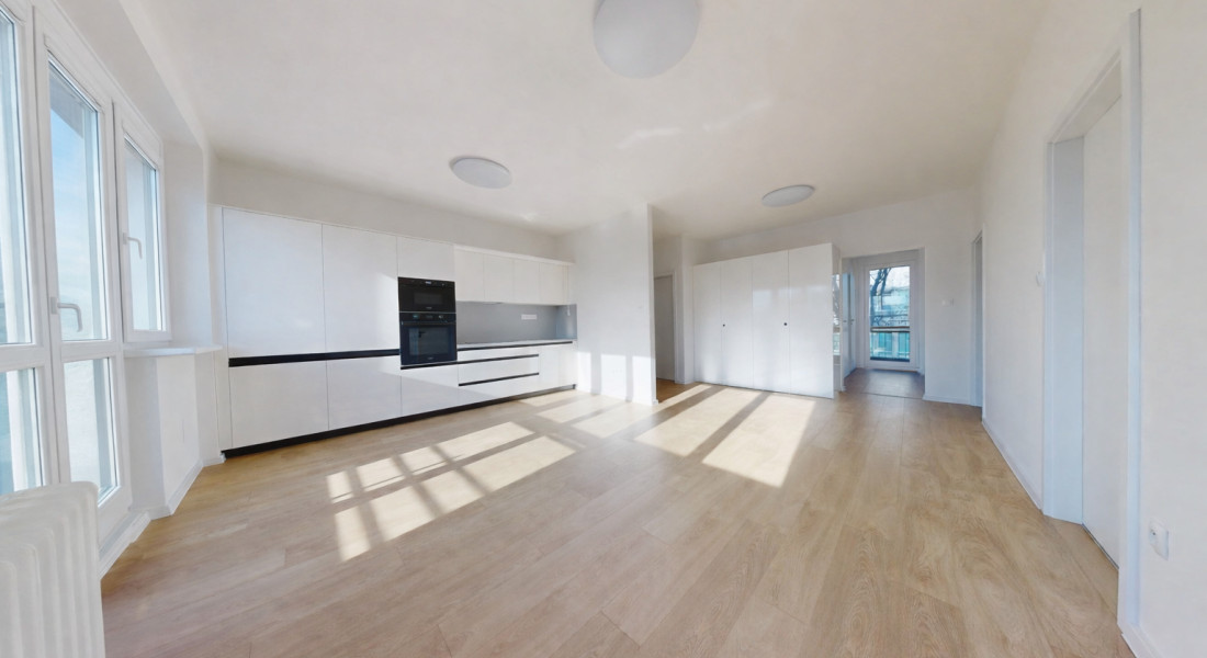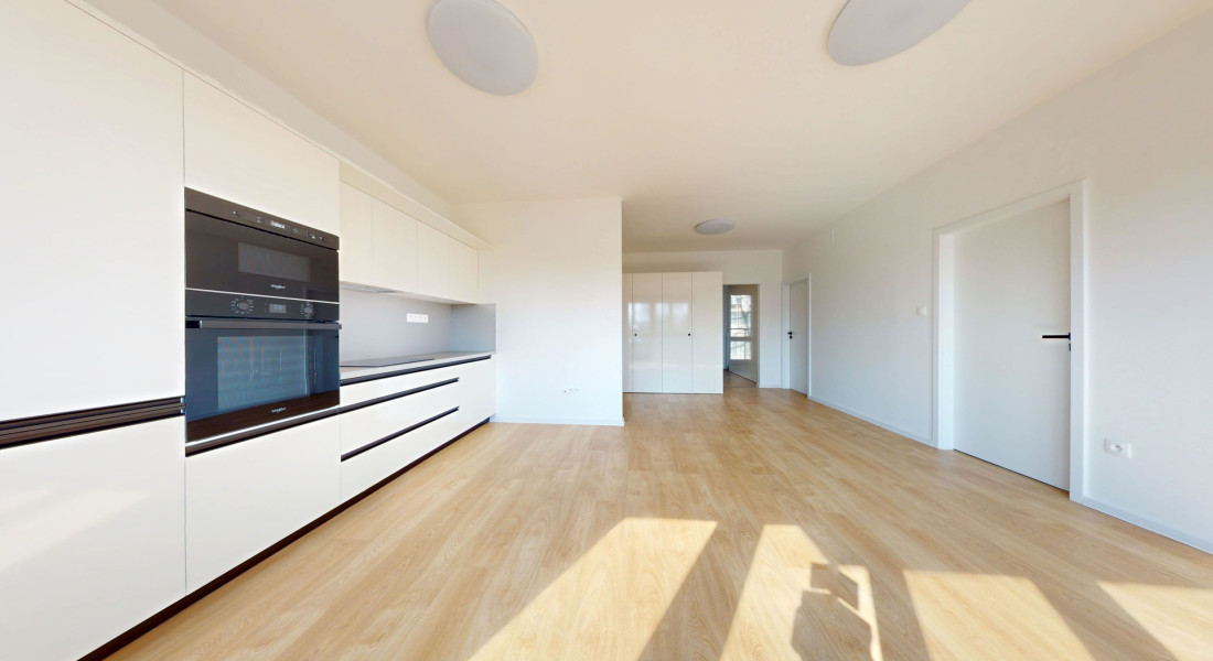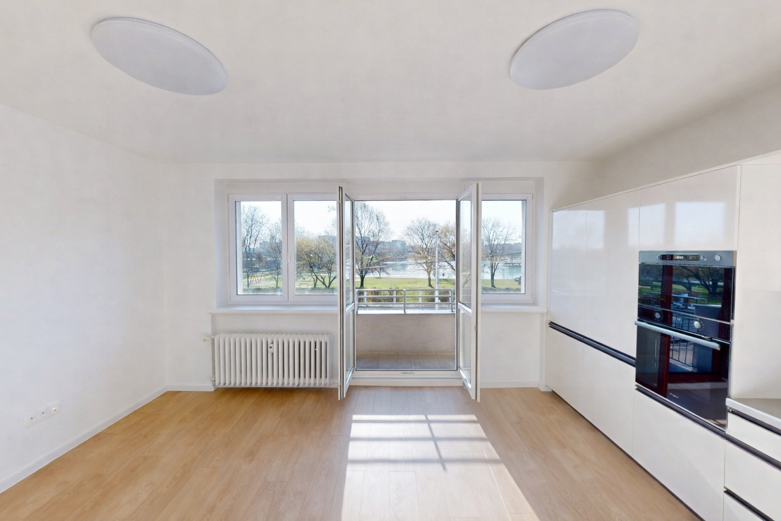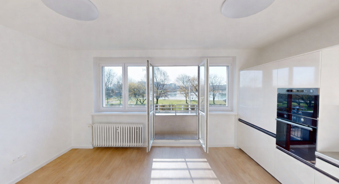 Výborná obojstranná dispozícia. Spálne orientované do tichého dvora plus krásny výhľad na jazero Kuchajda.