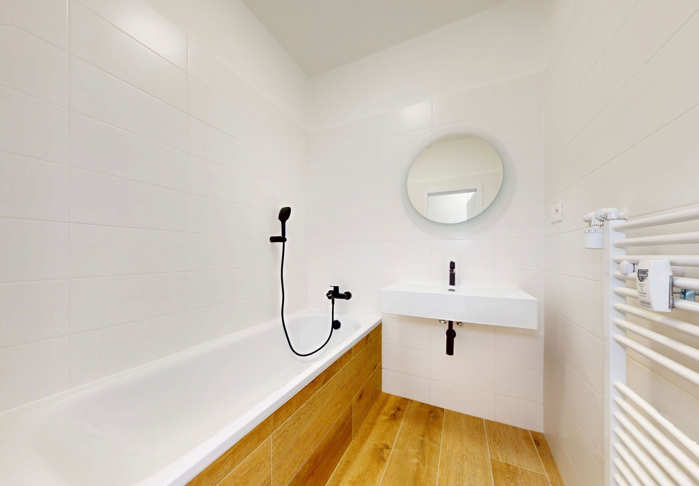 Na poschodí sú iba dva byty čo ponúka veľmi komfortné bývanie. Nehnuteľnosť prešla kvalitnou kompletnou rekonštrukciou a to nová elektroinštalácia podľa platnej STN, predpríprava na centrálnu klimatizáciu, nová vodoinštalácia, kvalitné maľovky aj stierky, nová kúpeľňa a samostatné WC s oknom, nové podlahy a nivelizácie, dlažby, obklady, nové interiérové dvere a svietidlá. Kuchynská linka na mieru prevedenie biely vysoký lesk s plne zabudovanými spotrebičmi: chladnička s mrazničkou, umývačka riadu, mikrovlnná rúra, varná doska, digestor a rúra. Tak isto zabudovaná pračka a sušička plus technická vstavaná skriňa.