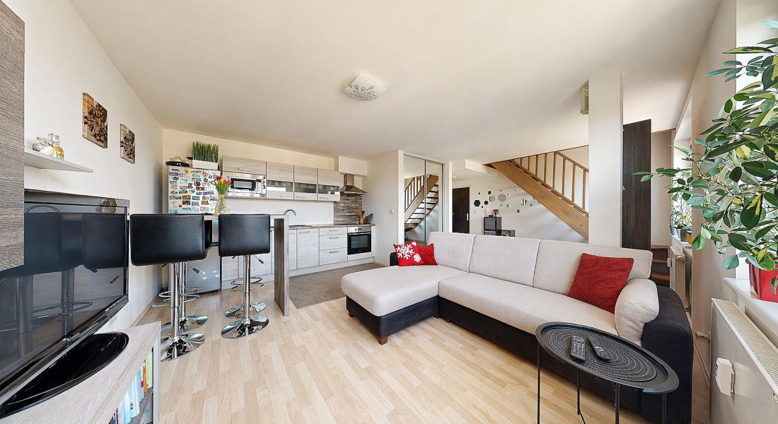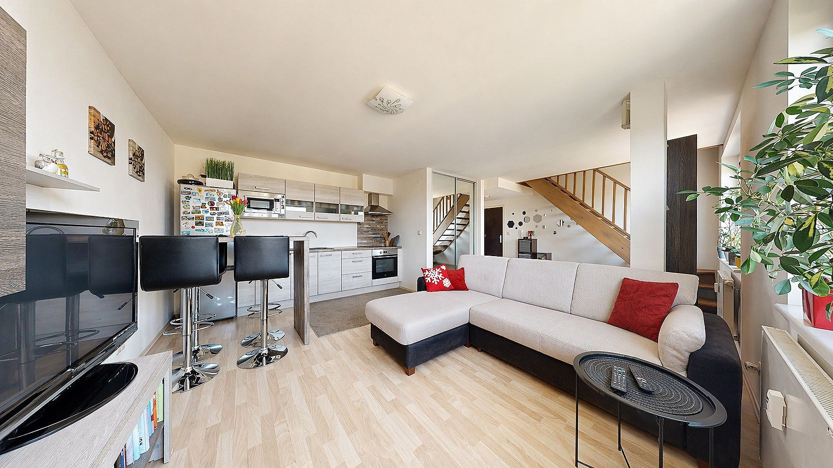 Dolná časť bytu – priestranná obývačka s kuchyňou, predsieň, sam. WC, schodisko