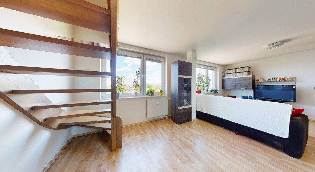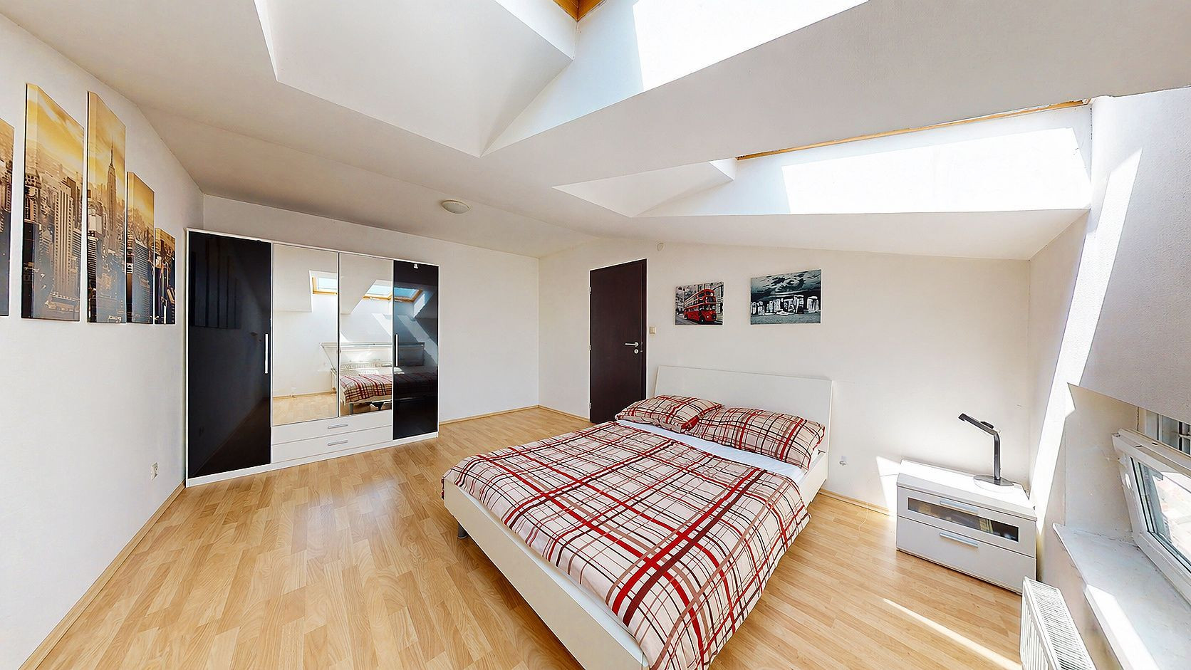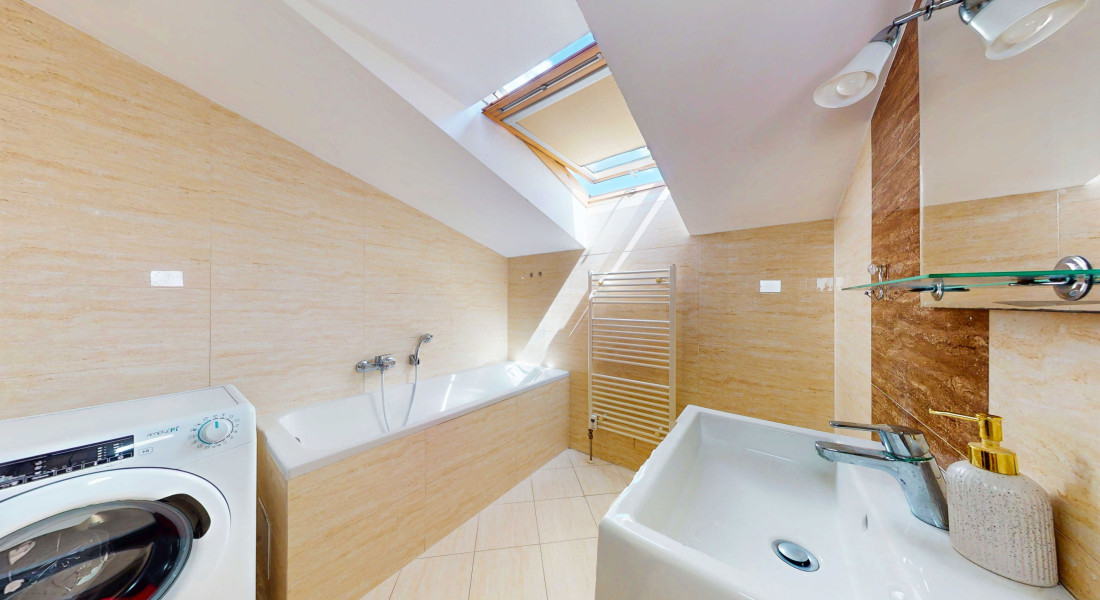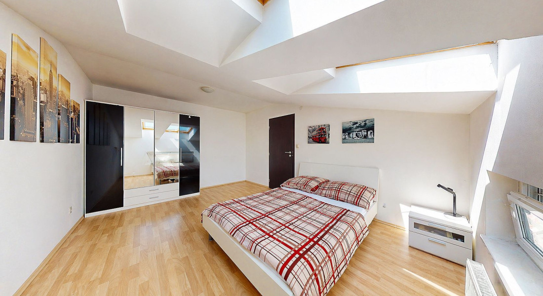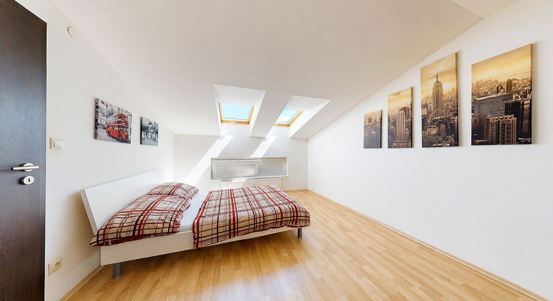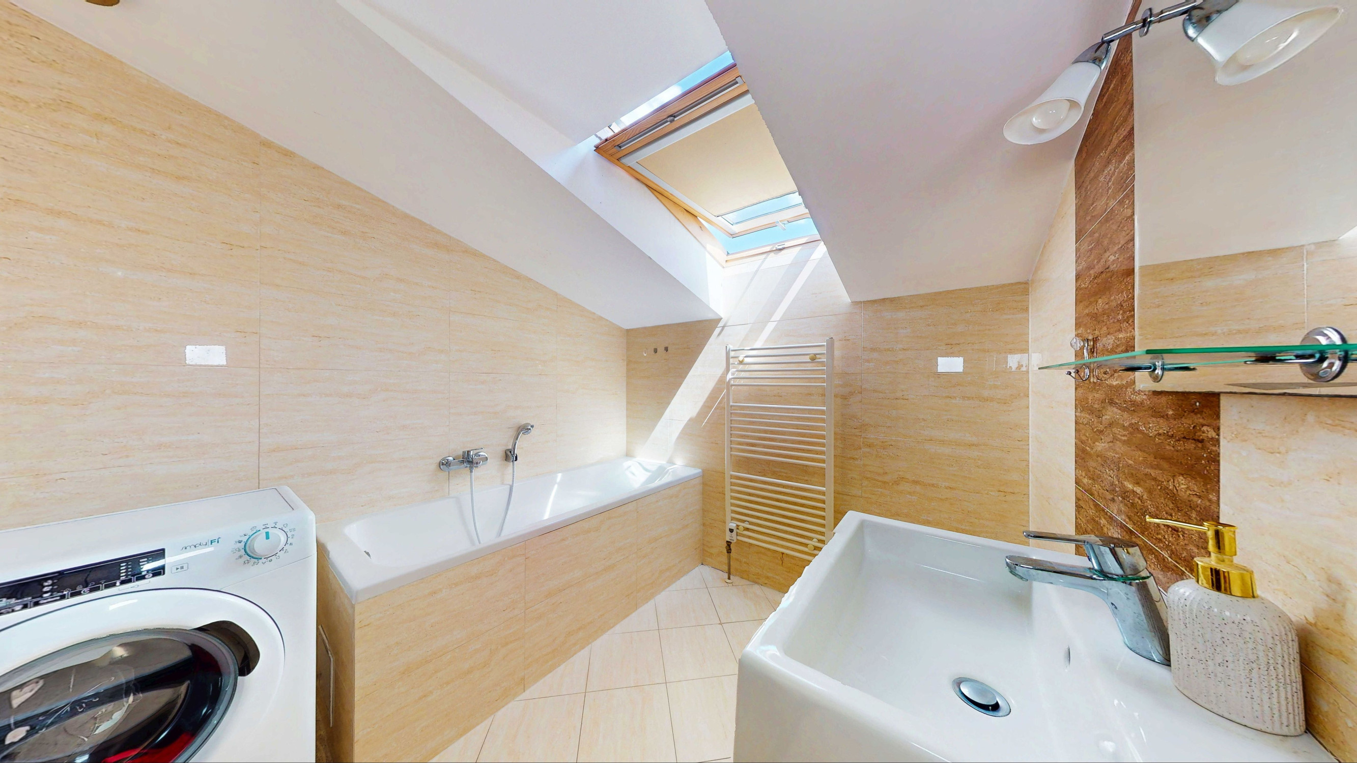 Horná časť bytu – 2 izby s nadštandardnou výmerou cca 17m2, kúpeľňa s vaňou, sam. WC, chodba